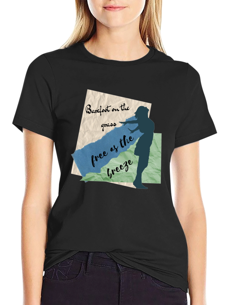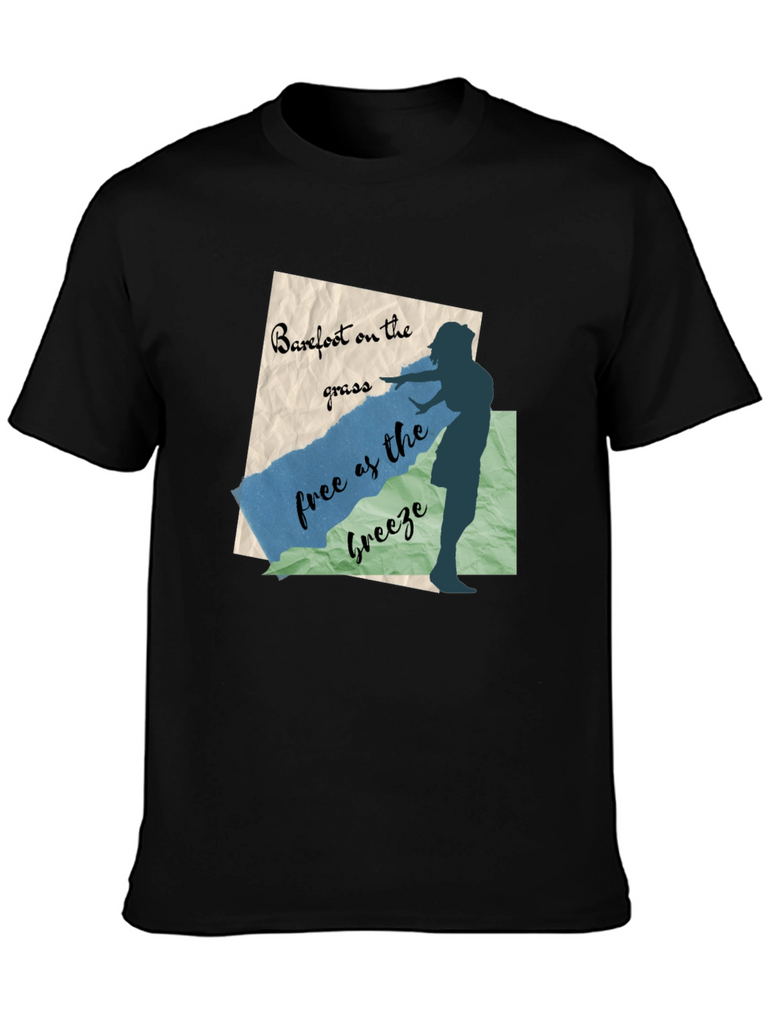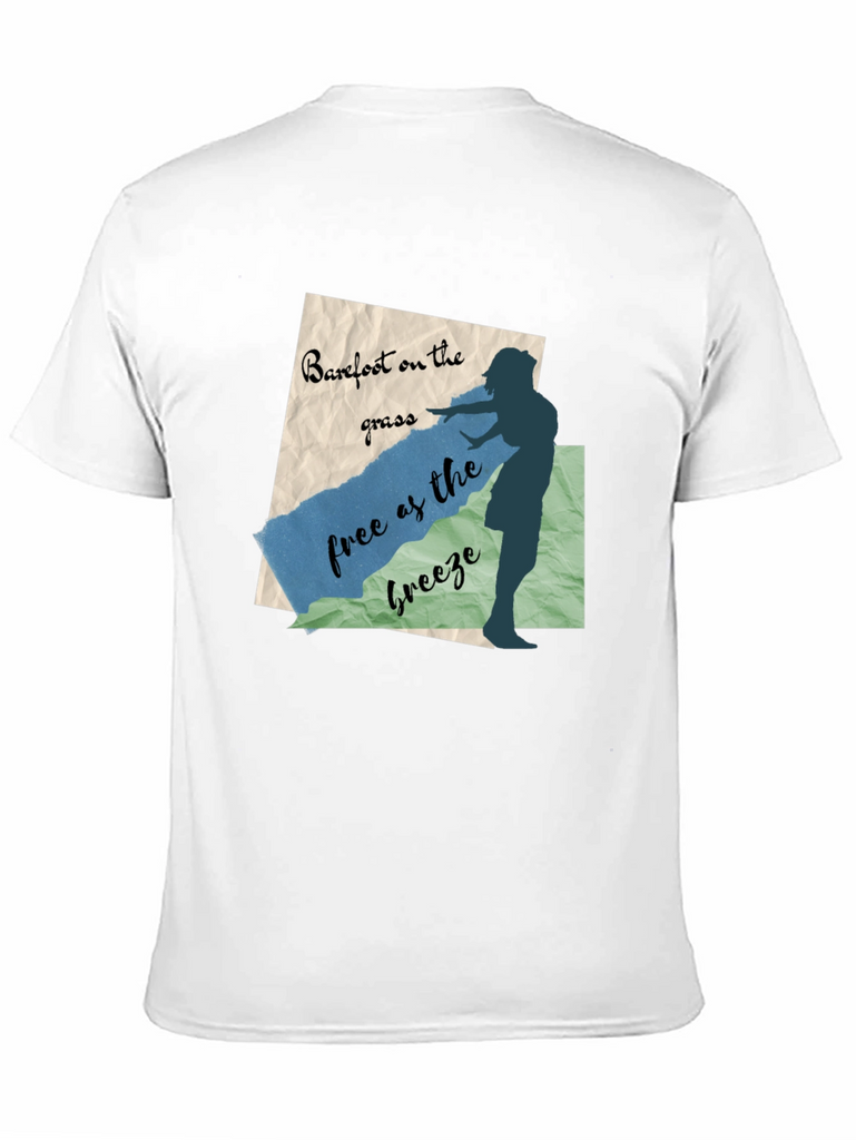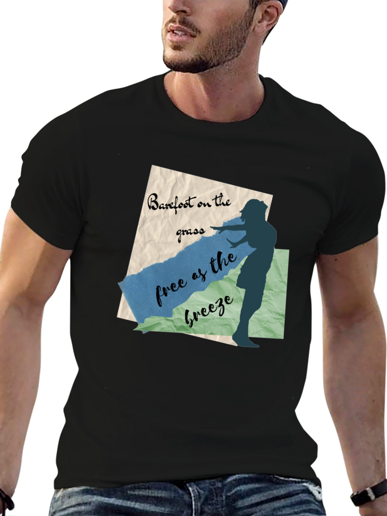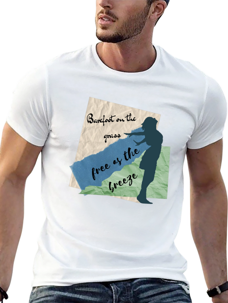 Embrace a free-spirited vibe with this unique graphic tee. Featuring a stylized design that reads "Barefoot on the grass, free as the breeze", this shirt captures a sense of carefree joy. The design incorporates a silhouette of a person, suggesting a connection to nature and a feeling of liberation. Made from a comfortable, soft fabric, this tee is perfect for everyday wear. Whether you're heading to a casual outing or simply relaxing at home, this tee adds a touch of whimsical charm to your outfit. Pair it with jeans, shorts, or a skirt for a laid-back, stylish look.