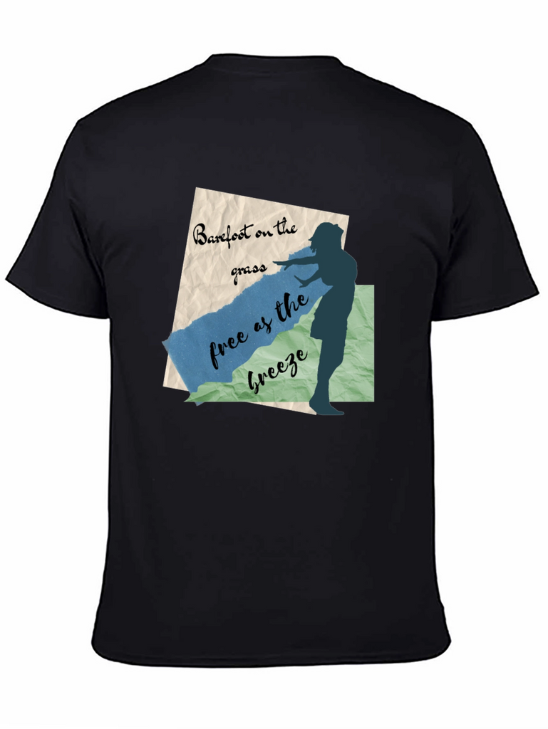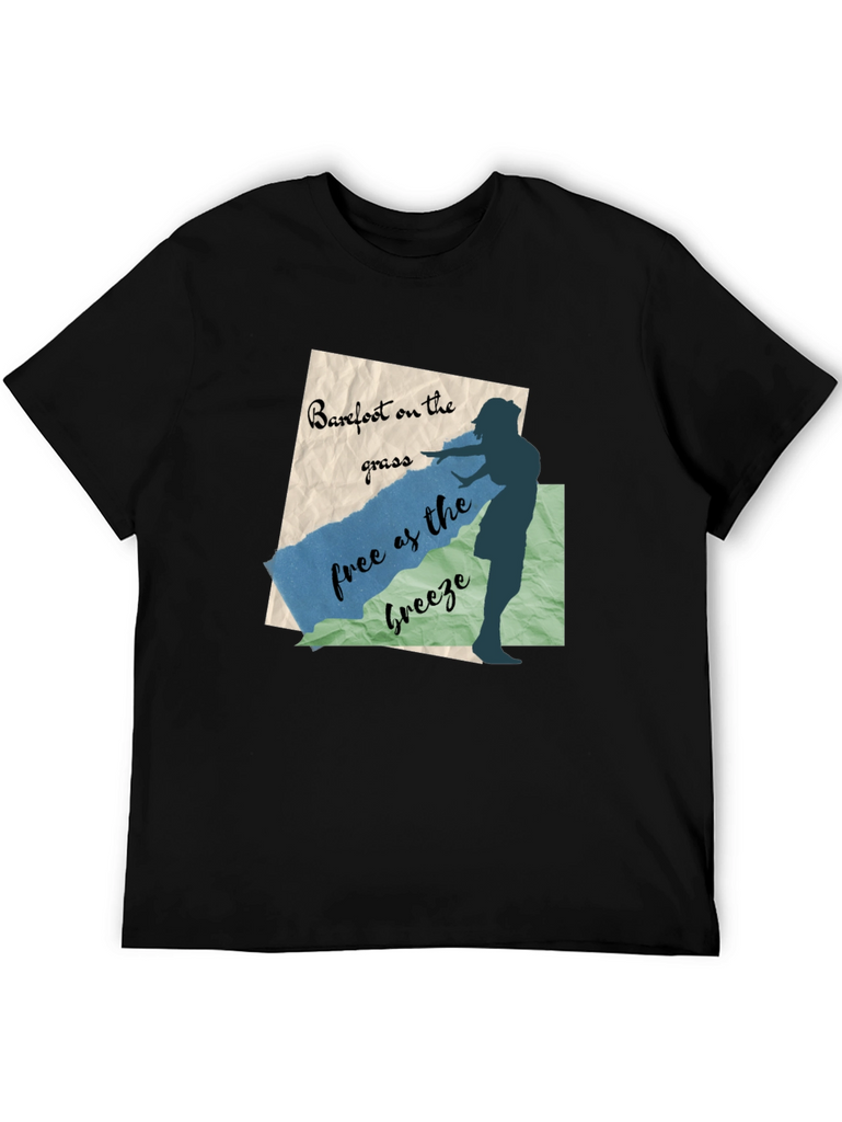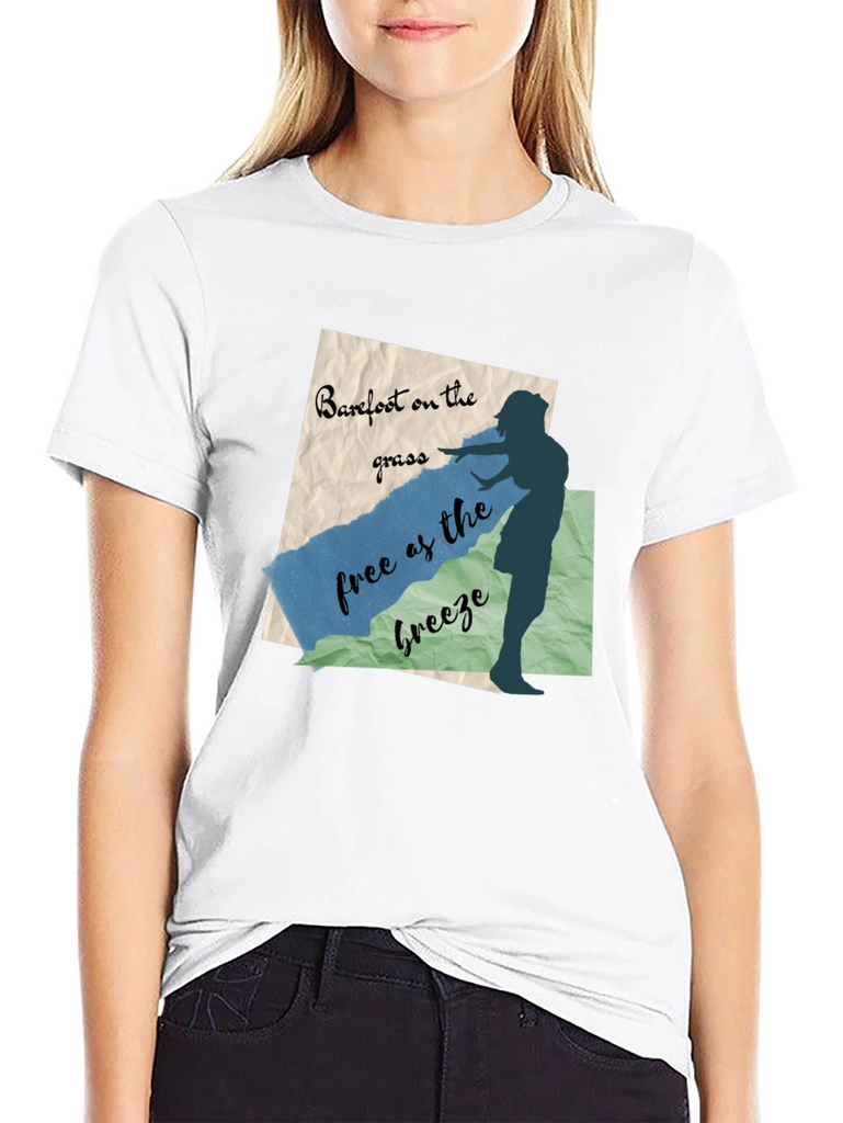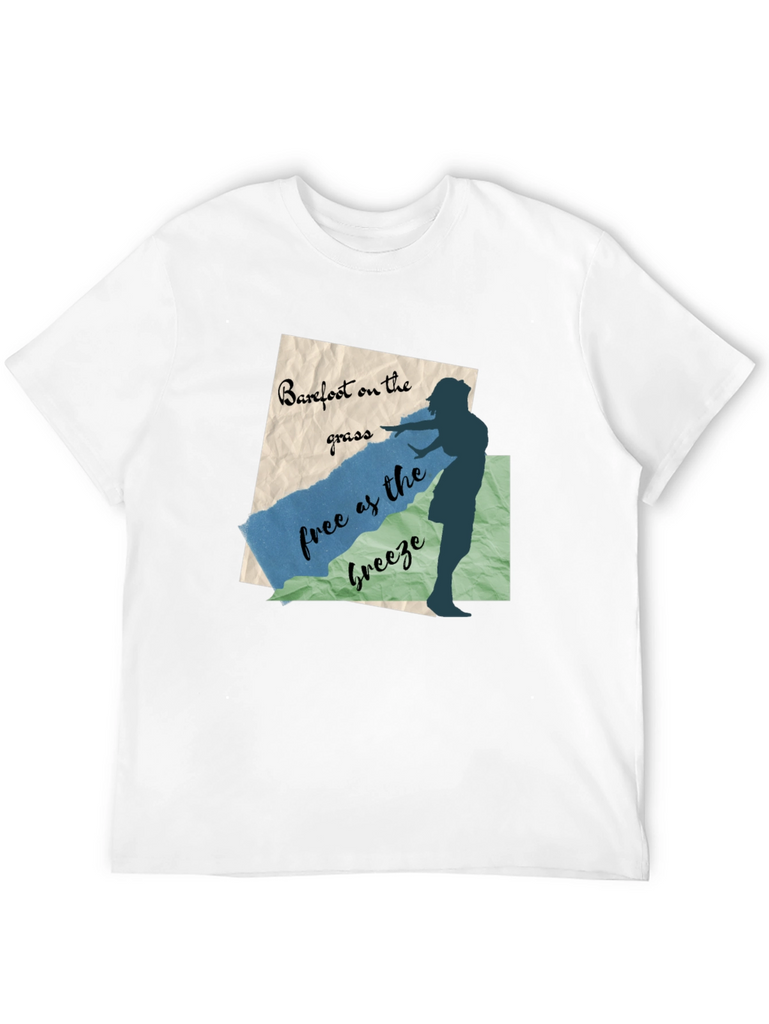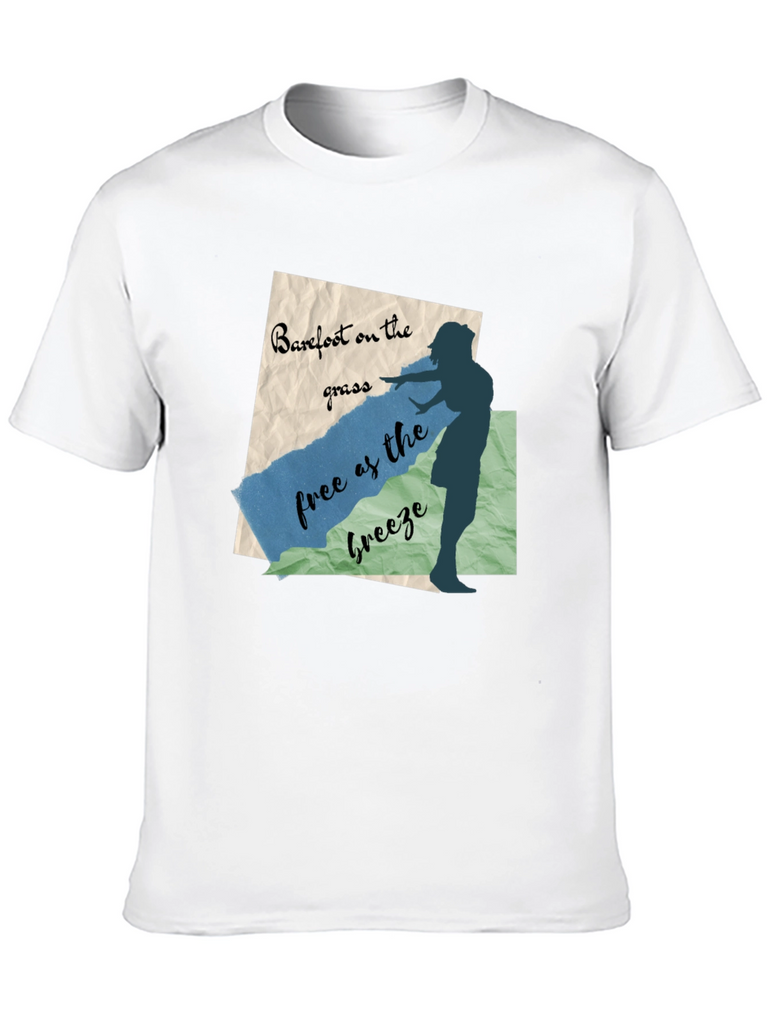 Embrace a free-spirited vibe with this unique graphic tee. Featuring a stylized design that reads "Barefoot on the grass, free as the breeze", this shirt captures a sense of carefree joy. The design incorporates a silhouette of a person, suggesting a connection to nature and a feeling of liberation. Made from a comfortable, soft fabric, this tee is perfect for everyday wear. Whether you're heading to a casual outing or simply relaxing at home, this tee adds a touch of whimsical charm to your outfit. Pair it with jeans, shorts, or a skirt for a laid-back, stylish look.