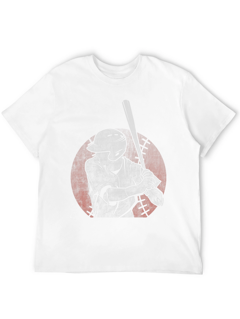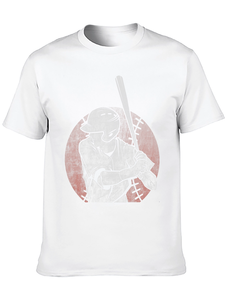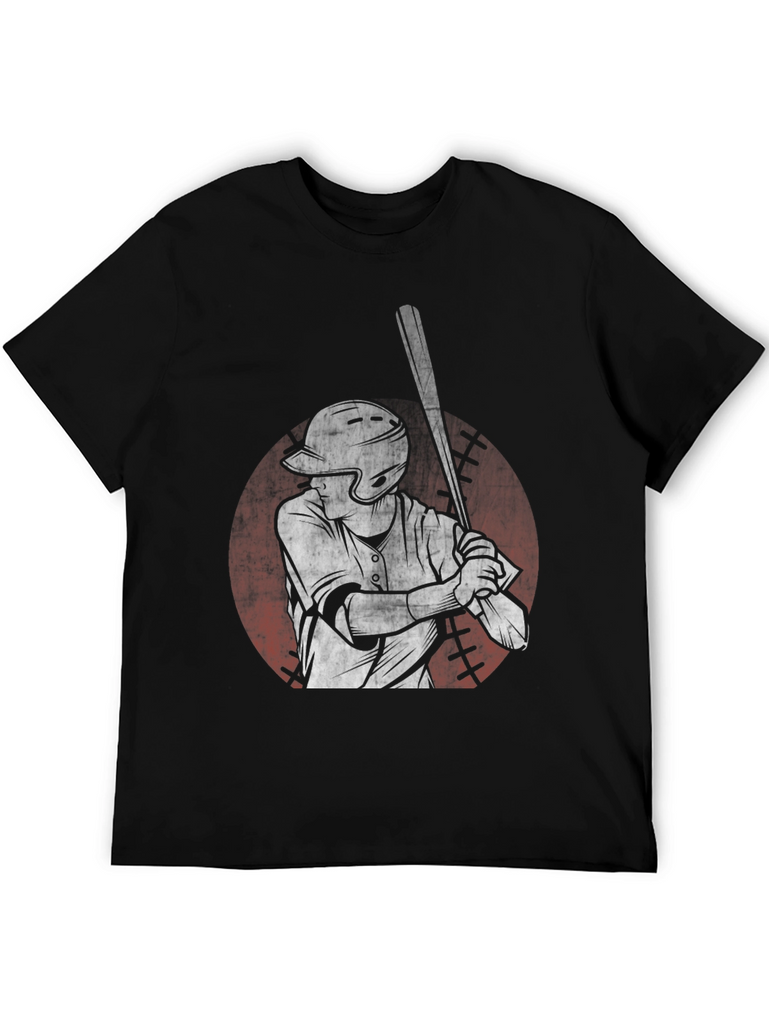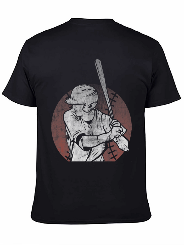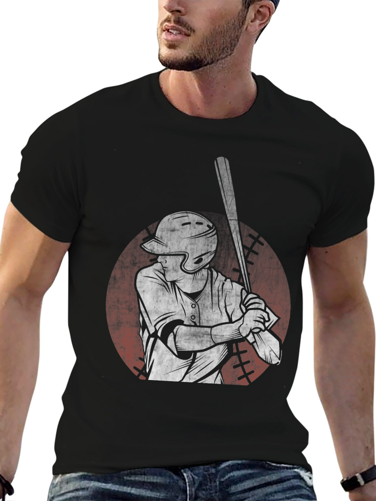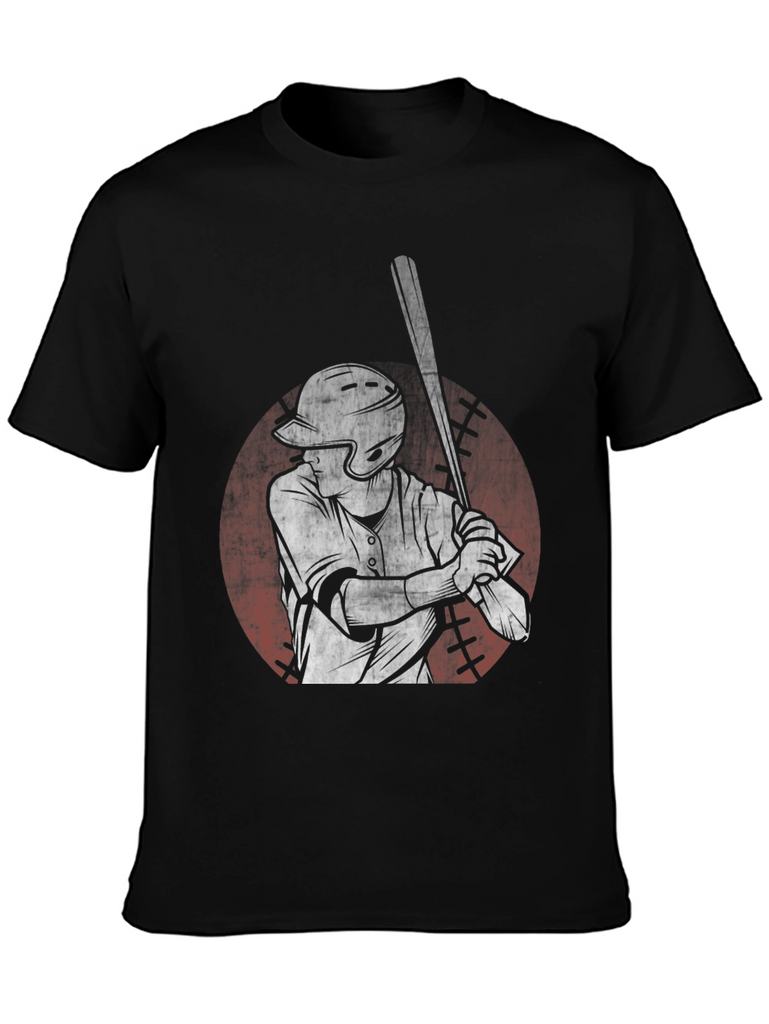 Step up to the plate in style with this unique black t-shirt featuring a striking graphic of a baseball player. The design showcases a batter in action, rendered in a distressed, vintage-inspired style. The graphic is set against a faded red circle reminiscent of a baseball. Made from comfortable cotton, this tee offers a relaxed fit, perfect for everyday wear or showing off your love for the game. Ideal for casual outings, sports events, or simply lounging, this baseball graphic tee is a grand slam addition to any wardrobe.