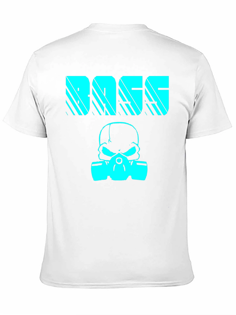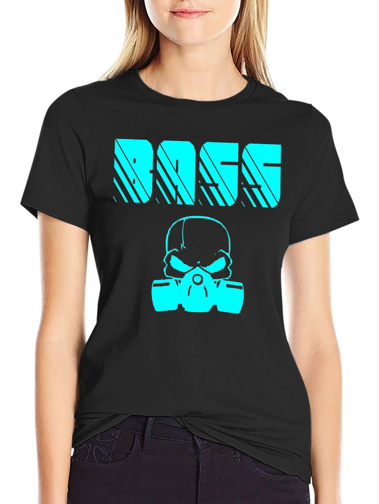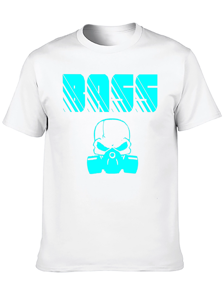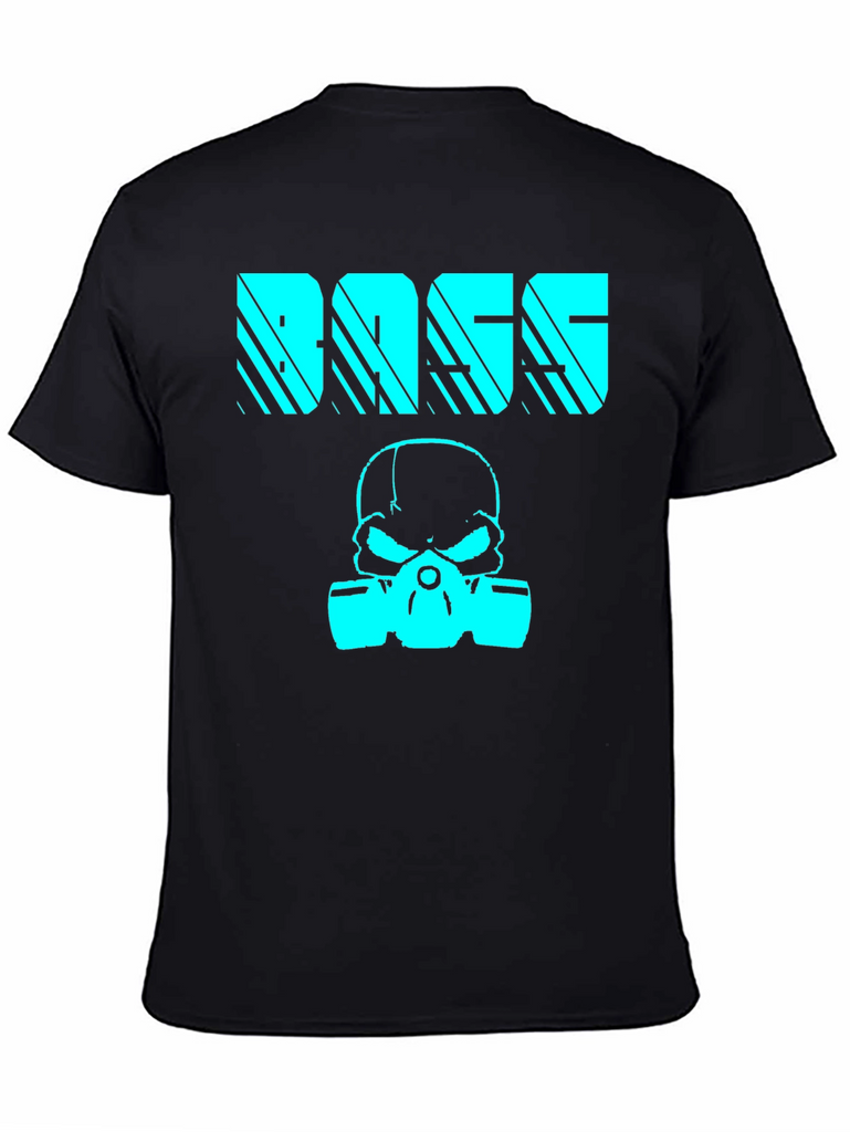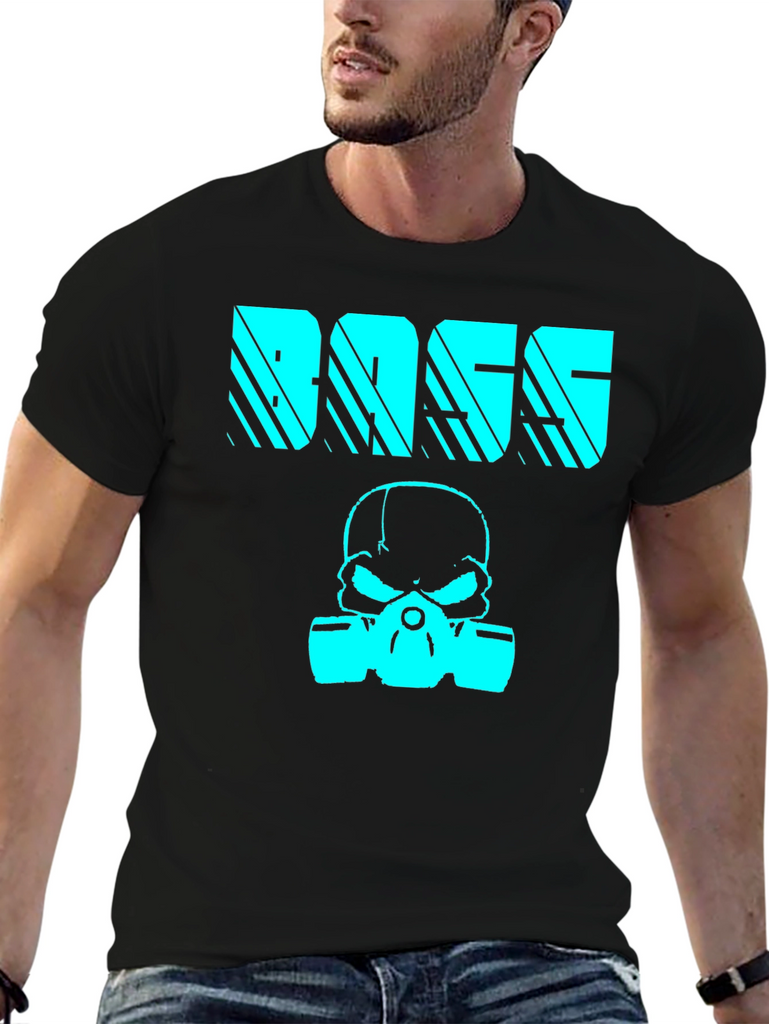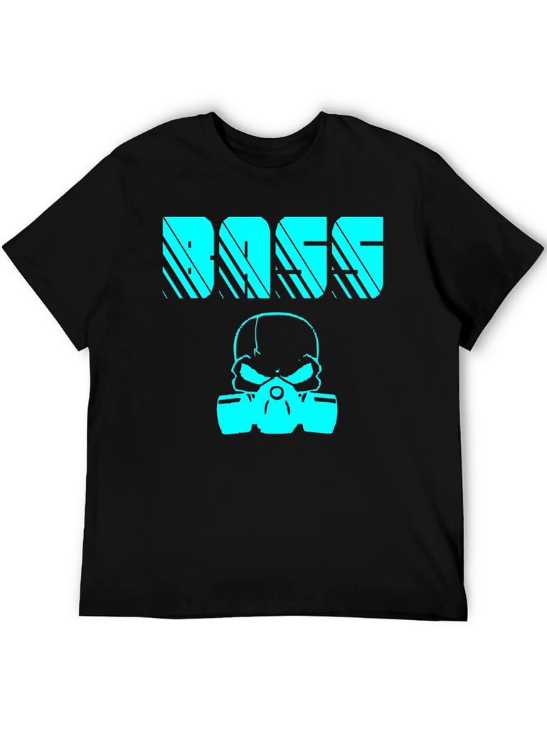 Show off your love for music with this edgy black T-shirt. The shirt features a bold, cyan "BASS" graphic above a skull design with a respirator, creating a striking visual contrast. Made from a comfortable-looking fabric, this tee is ideal for casual wear, concerts, or music events. Its unique design makes it a standout piece, perfect for making a statement. This eye-catching T-shirt is a must-have for any music enthusiast looking to add a touch of rebellious style to their wardrobe.