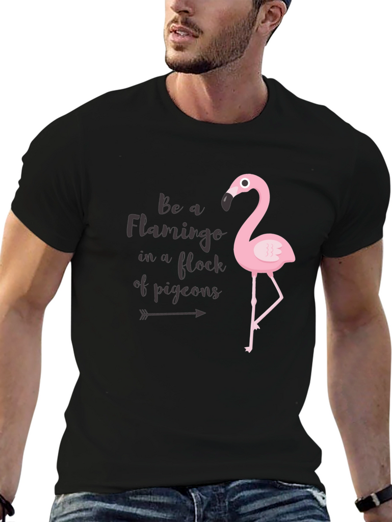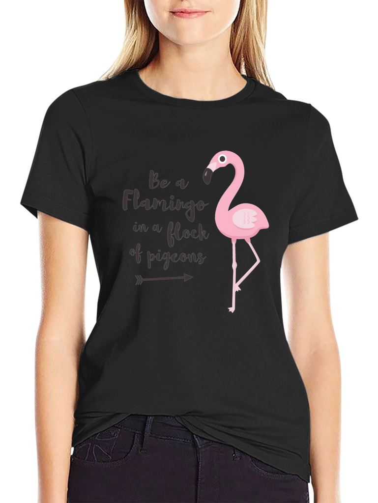 Stand out from the crowd with this bold black tee featuring a unique "Be a Flamingo in a Flock of Pigeons" graphic. The design includes a playful pink flamingo illustration and stylish text. Made from a comfortable cotton blend, this shirt is perfect for casual wear and expressing your individuality. Its versatile style makes it ideal for pairing with jeans, shorts, or skirts. Whether you're headed to a social gathering or simply want to make a statement, this tee is a fun and fashionable choice. Embrace your inner flamingo and let your style shine!
