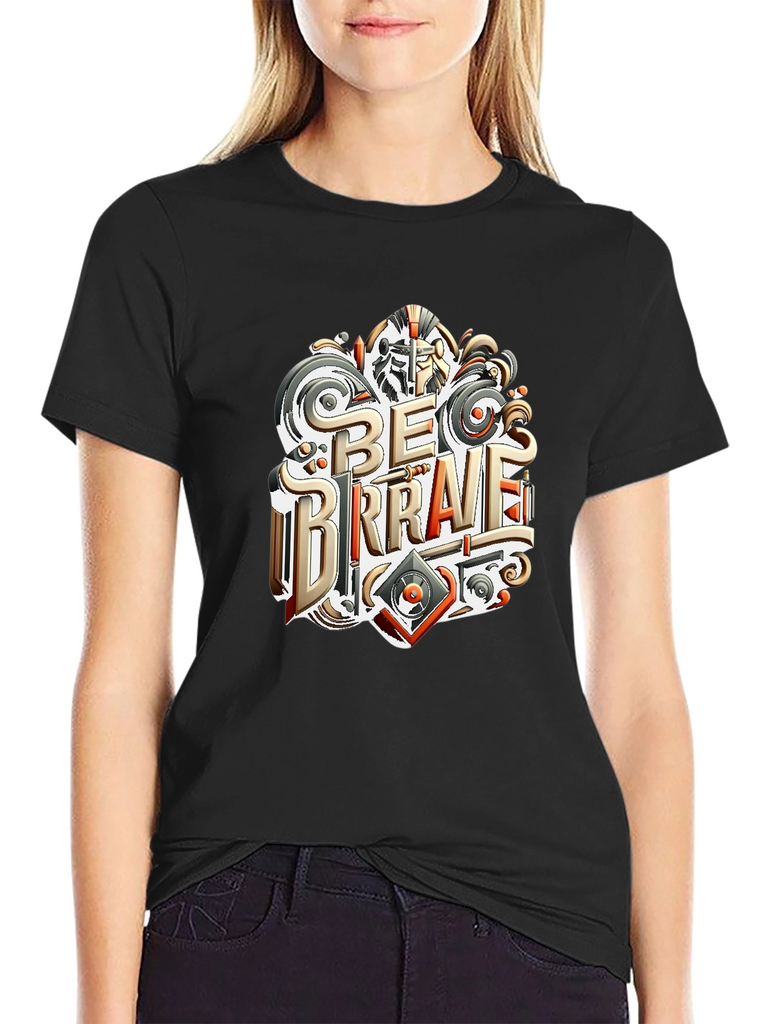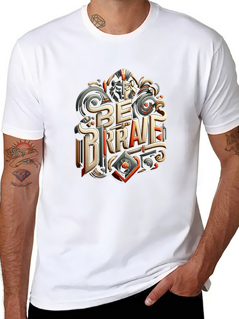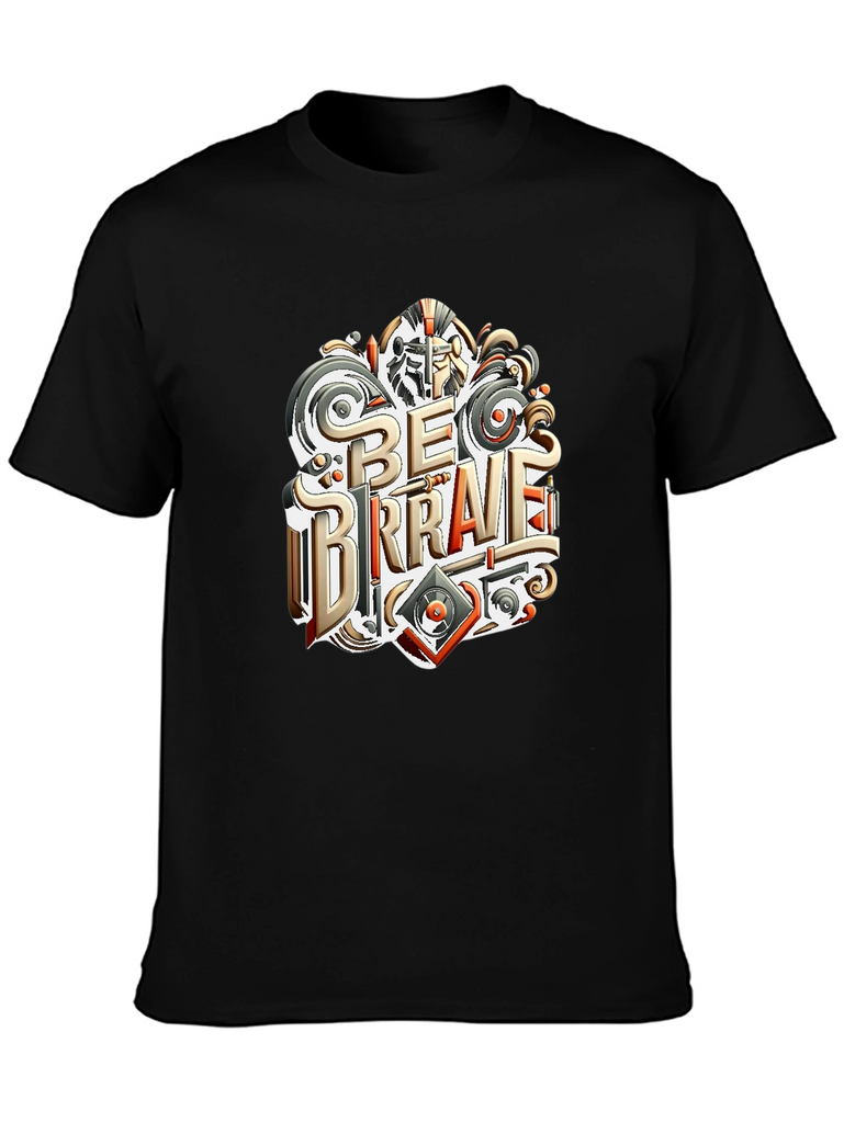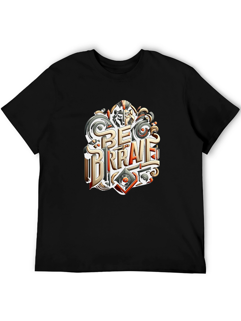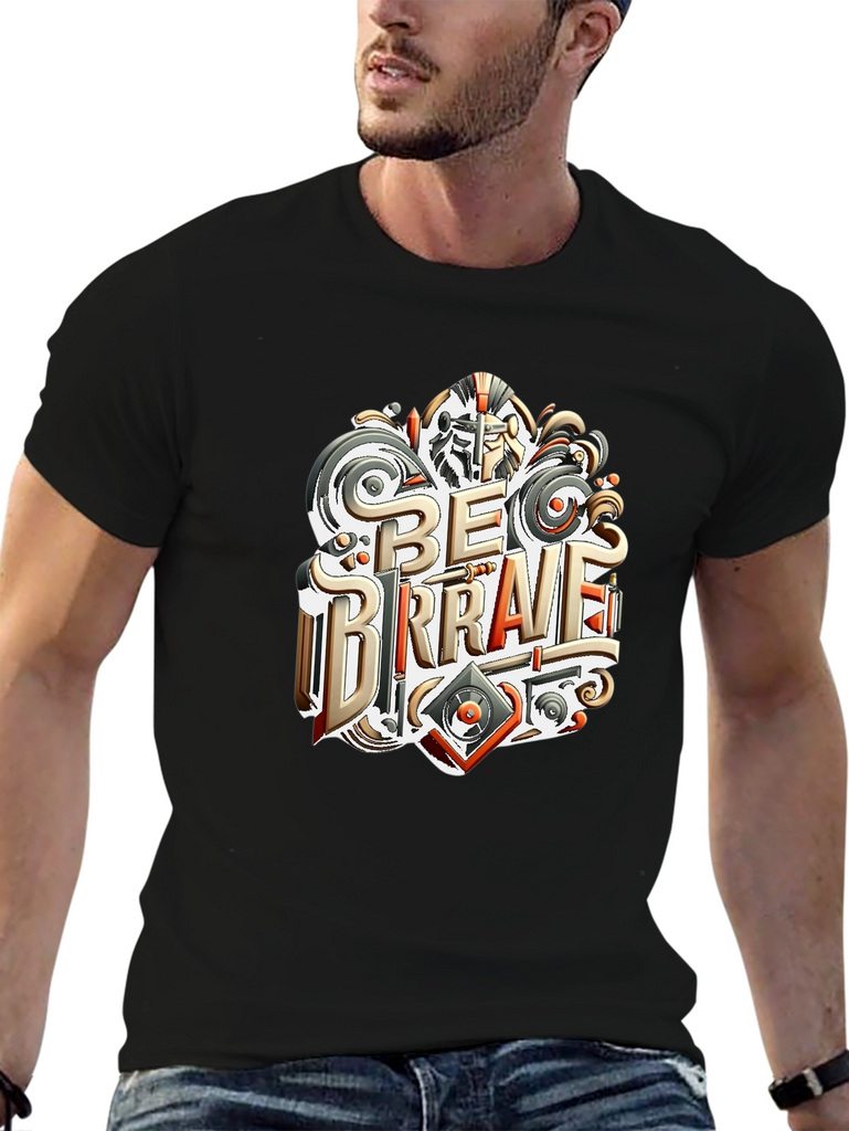 Embrace courage with this stylish black t-shirt featuring a unique "Be Brave" graphic print. The design incorporates elements of medieval armor and modern design. Made from comfortable, breathable cotton, this tee is perfect for everyday wear. Show off your fearless spirit with this statement piece, ideal for casual outings, workouts, or expressing your individuality. Make a statement and inspire others with this empowering and fashionable t-shirt. The shirt has a classic fit, which works well for a broad range of body types.