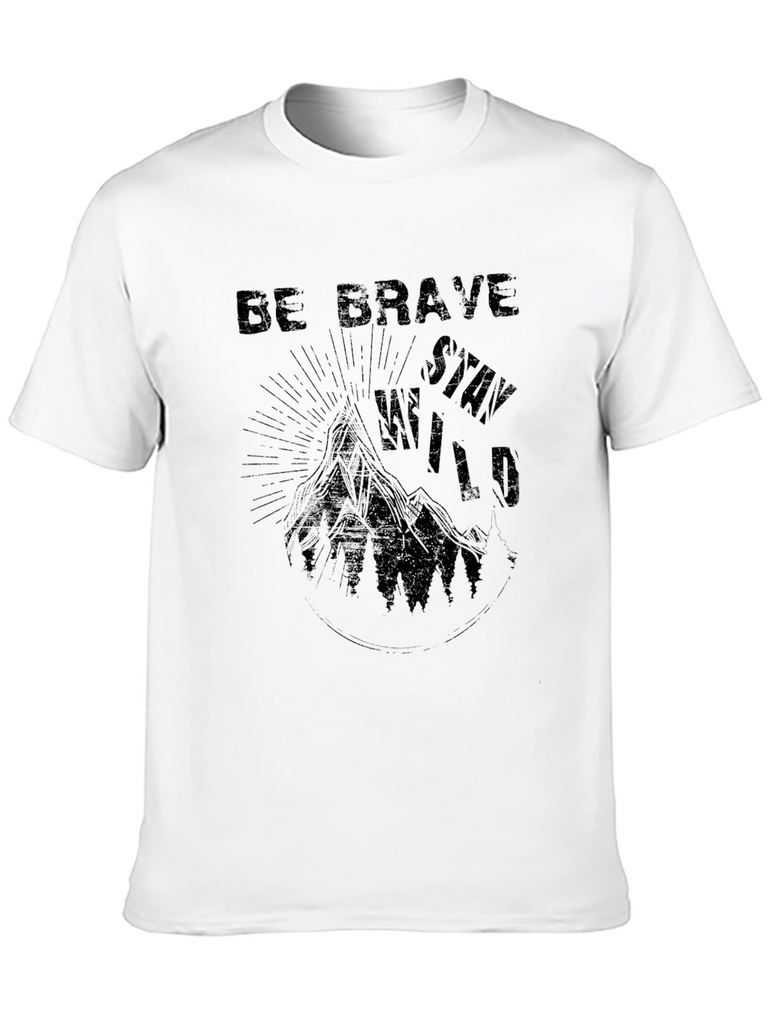 Embrace your adventurous side with this striking black t-shirt. Featuring a bold graphic design with the phrase 'Be Brave Stay Wild' intertwined with a mountain and forest landscape, this tee is perfect for nature lovers and thrill-seekers. The dark print on the black fabric creates a stylish, edgy look. Made from a soft, breathable fabric, this shirt ensures all-day comfort, whether you're exploring the outdoors or relaxing at home. Its classic fit makes it a versatile addition to any wardrobe. Show off your free spirit with this unique and inspiring t-shirt. This is a must-have for those who dare to live life to the fullest.