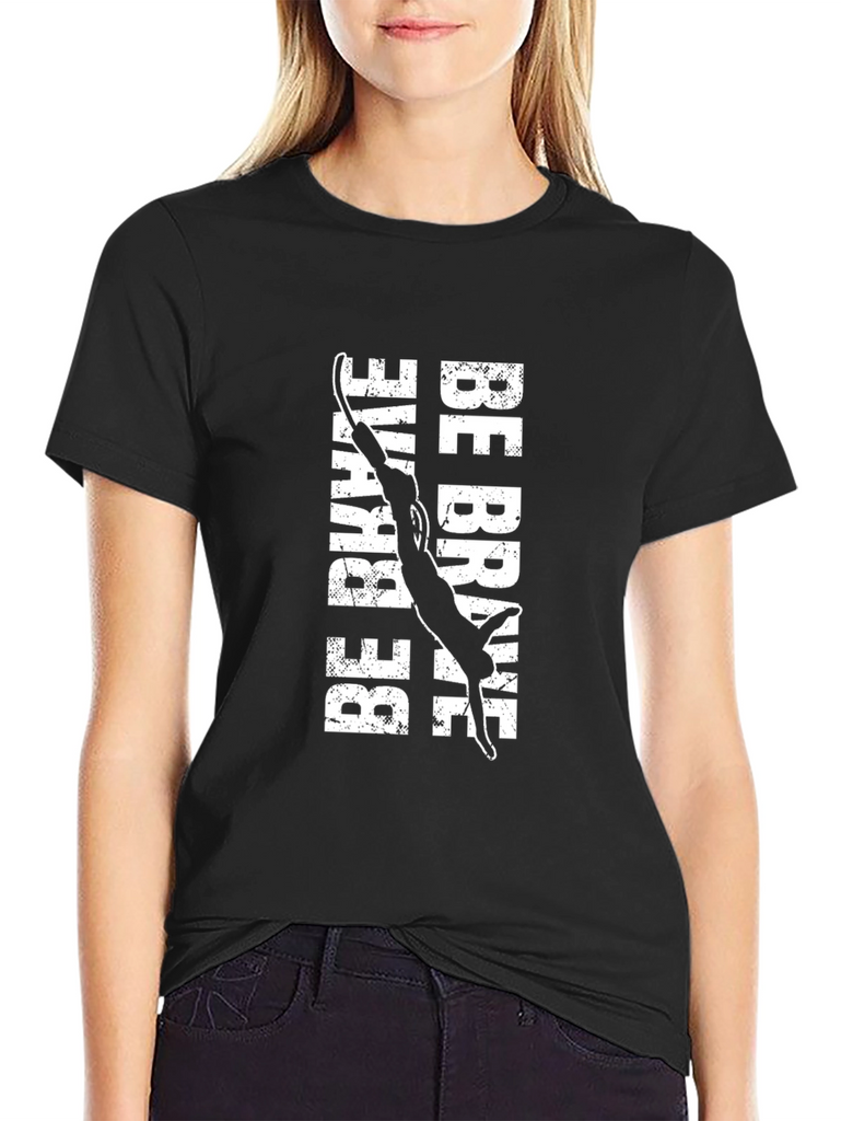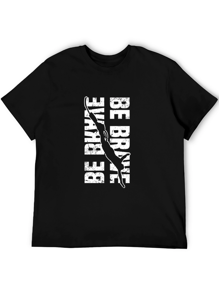 Showcase your fearless spirit with this bold graphic tee. The shirt features a diver silhouette integrated within the powerful "BE BRAVE" text design. The classic black color provides a sleek backdrop, making the statement pop. Made with soft and breathable fabric, this t-shirt offers comfort and style. Perfect for everyday wear, gym workouts, or casual outings, this tee is a great way to express your motivation and inspire others. Elevate your wardrobe with this inspiring design.