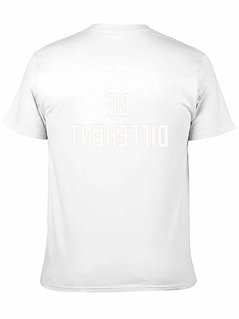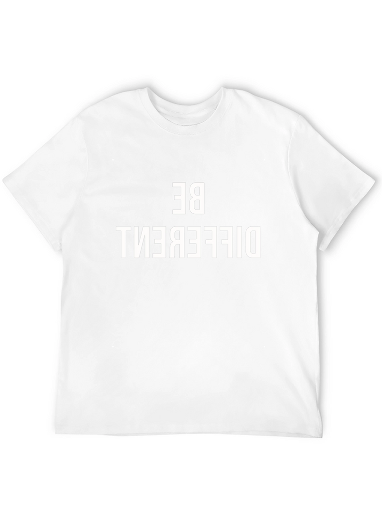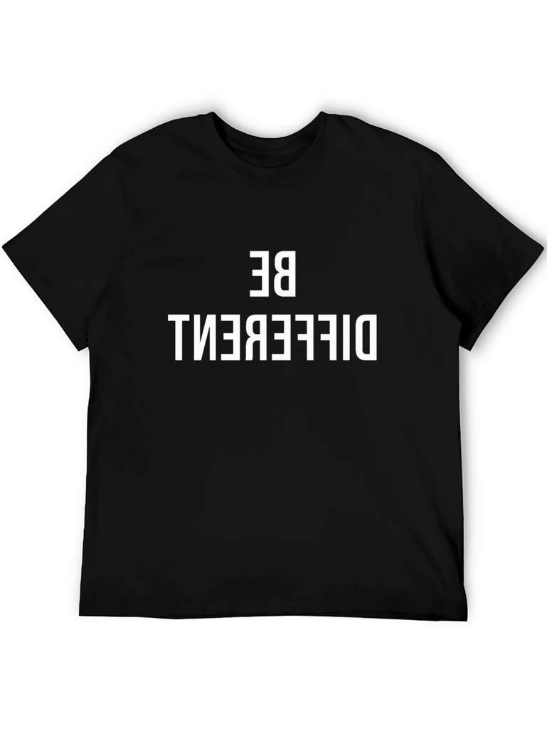 Make a bold statement with this striking black graphic tee. The shirt features a bold, reversed "BE DIFFERENT" print, making it a unique and eye-catching piece. Constructed from what appears to be a soft and comfortable cotton blend, this tee offers both style and ease. The short-sleeved design and classic crew neck make it versatile for casual wear. Wear it to express your individuality and stand out from the crowd. Perfect for everyday style or making a statement at social gatherings.
