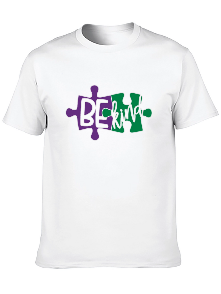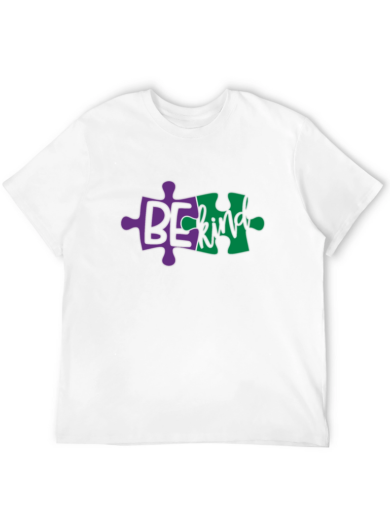 Show your support with this unique black t-shirt. The design features the phrase 'Be Kind' integrated into vibrant puzzle pieces, a symbol of autism awareness. The purple and green pieces create a visually striking contrast against the black fabric, making the message pop. Made from a comfortable, breathable material, this shirt is perfect for everyday wear, autism awareness events, or as a thoughtful gift for someone who supports inclusivity. This tee is more than just apparel; it's a statement of compassion.