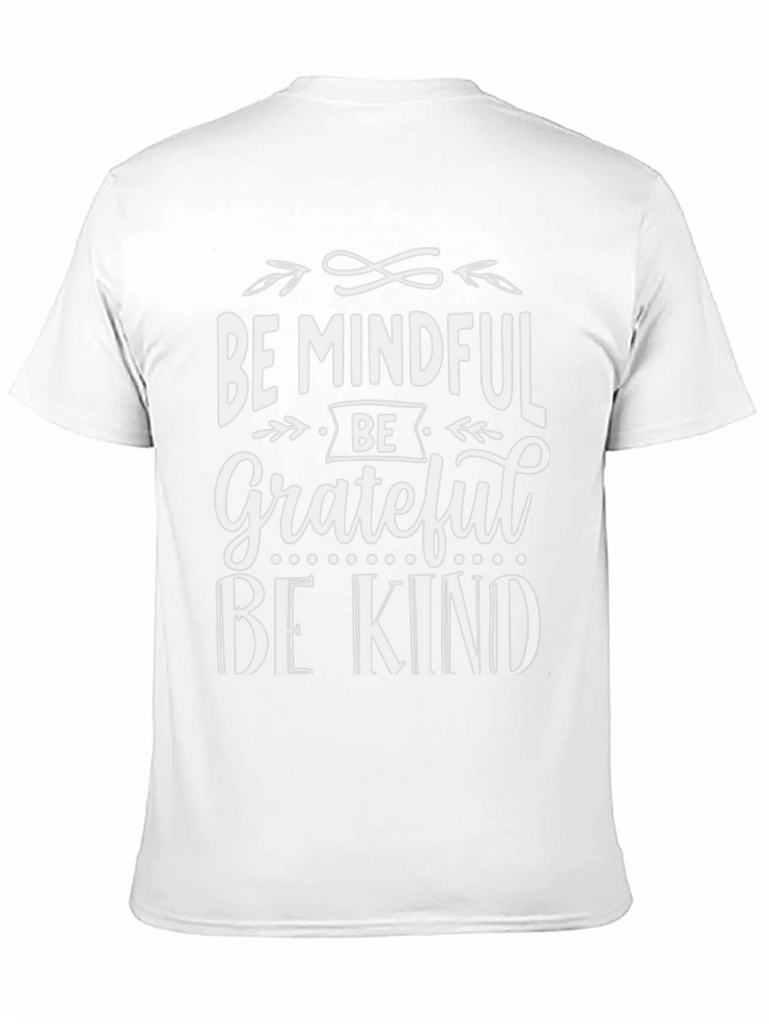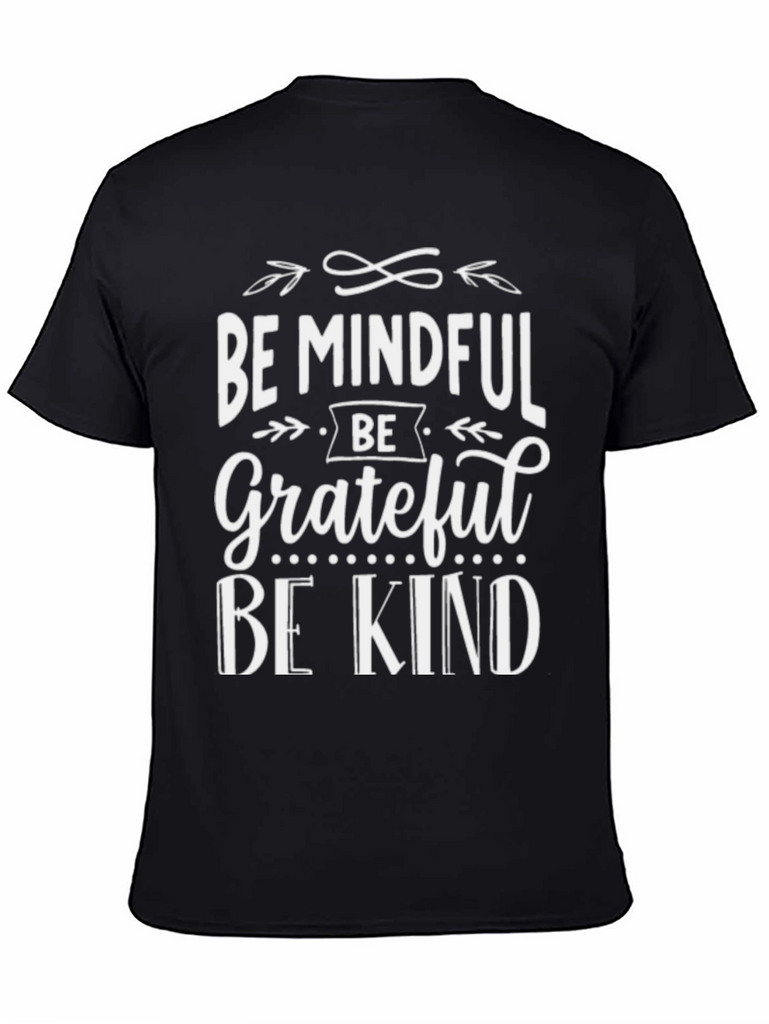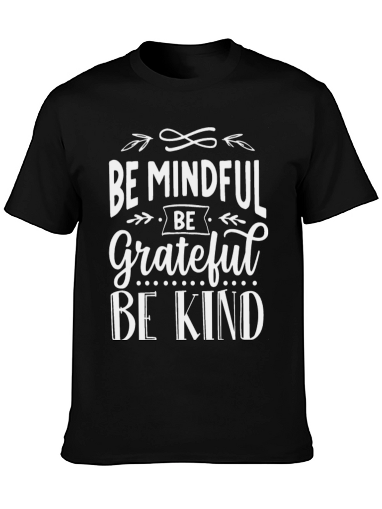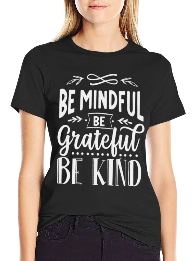 This classic black tee features a crisp white graphic print with the words "Be Mindful, Be Grateful, Be Kind" arranged in a stylish, eye-catching design. Made from comfortable fabric, this short-sleeve shirt is perfect for casual wear, everyday activities, or layering under jackets and hoodies. The meaningful message promotes positivity and mindfulness, making it a great conversation starter. It's a versatile addition to any wardrobe and can be easily paired with jeans, shorts, or leggings for a relaxed yet fashionable look. Show off your positive attitude with this unique tee!