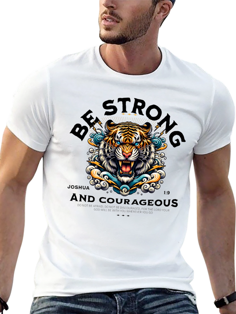 Show your inner strength with this black graphic tee. Features a bold tiger design with striking detail, set against a black backdrop. The text "Be Strong and Courageous, Joshua 1:9" adds an inspirational touch. This shirt is perfect for casual wear, gym sessions, or as a statement piece. Made for comfort and style, it's a must-have for anyone who wants to stand out. The eye-catching design and meaningful message make it a great gift, too. Wear your faith and fortitude proudly!