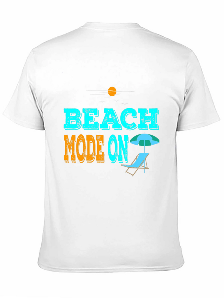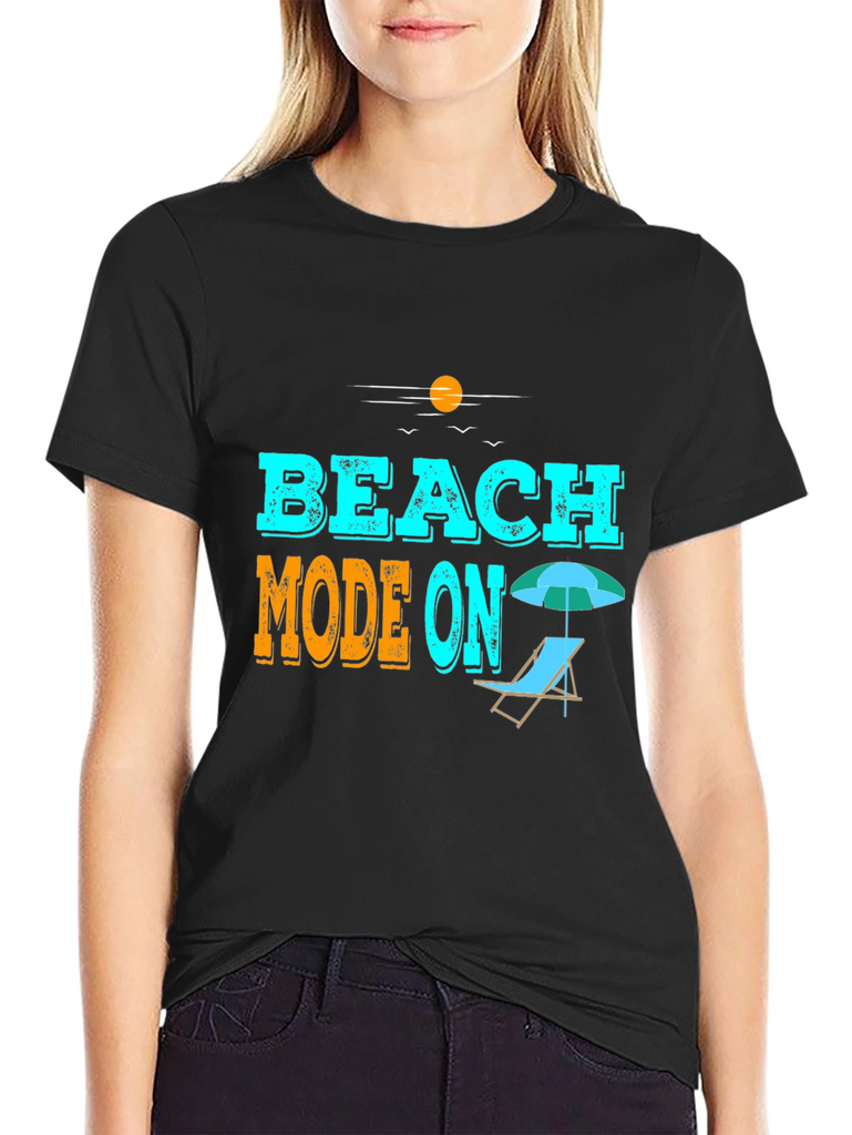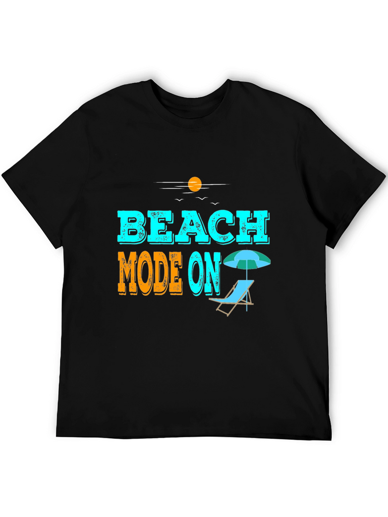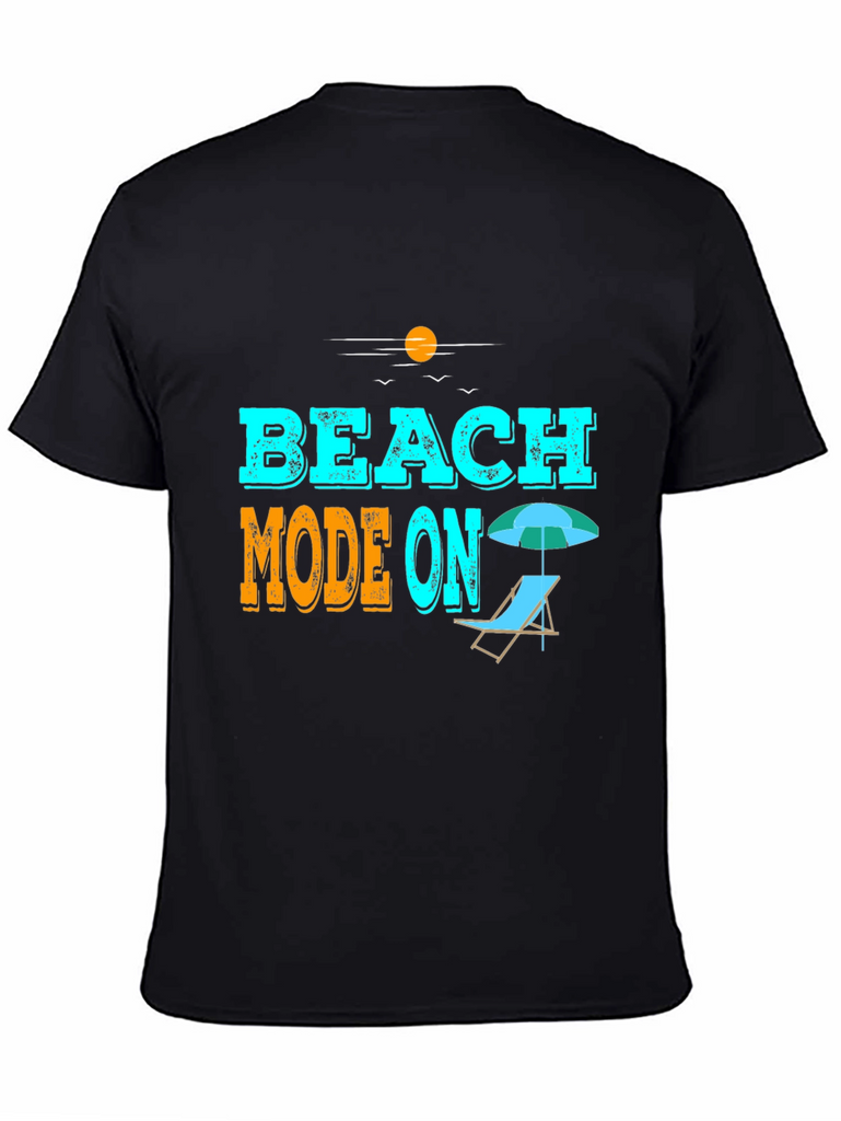 Get ready for summer with this stylish black graphic tee! Featuring the playful "Beach Mode On" slogan in vibrant blue and orange, this tee is perfect for vacation or casual wear. The design includes a beach chair and umbrella, adding to the summery theme. Made from comfortable material, it offers a relaxed fit, ideal for beach outings, poolside lounging, or everyday wear. Show off your vacation spirit with this eye-catching and comfortable t-shirt. A must-have addition to your summer wardrobe!