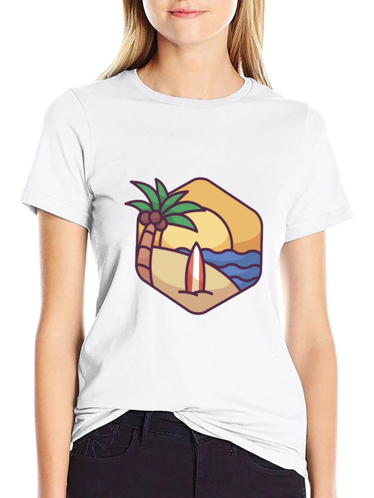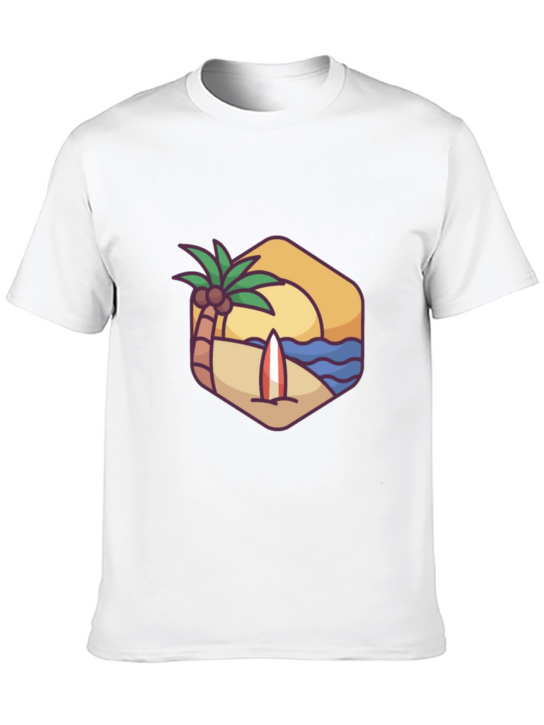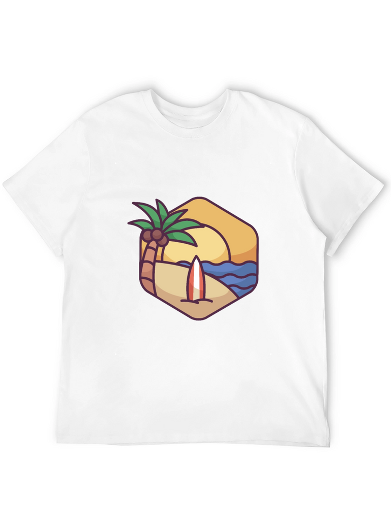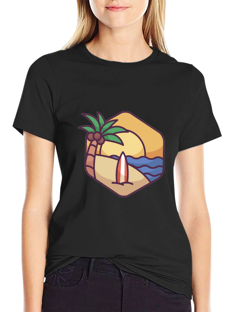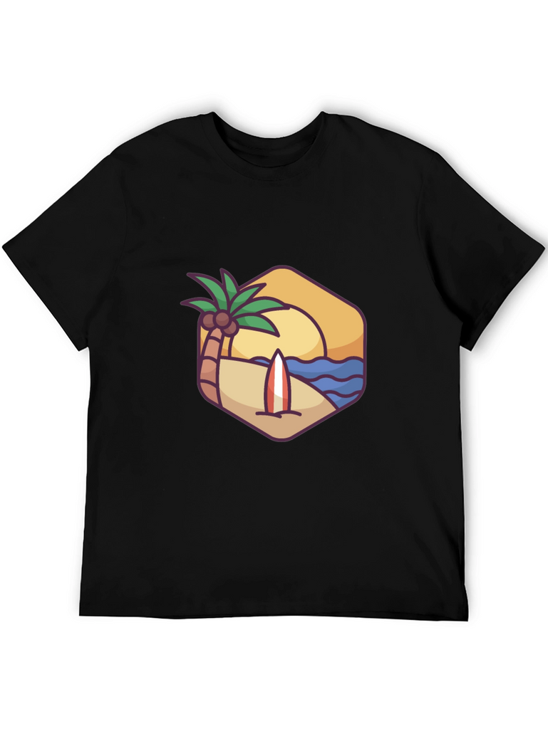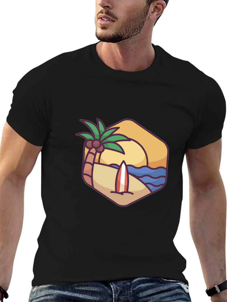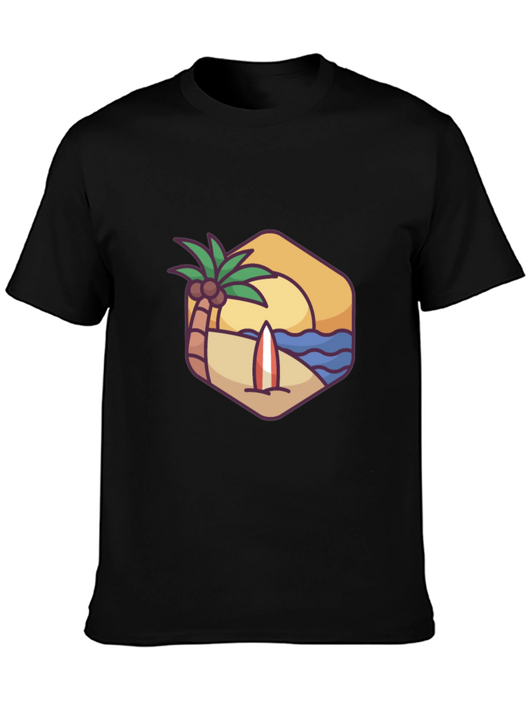 Embrace the beach vibes with this stylish black t-shirt. The tee features a unique graphic design of a tropical beach scene inside a geometric shape. The design includes a palm tree, a surfboard on the sand, and an ocean wave under a sunny sky. Made from soft, comfortable fabric, this shirt is perfect for casual wear. Whether you're heading to the beach, hanging out with friends, or just relaxing at home, this tee will keep you looking cool and feeling great. Get yours today and show off your love for the beach!