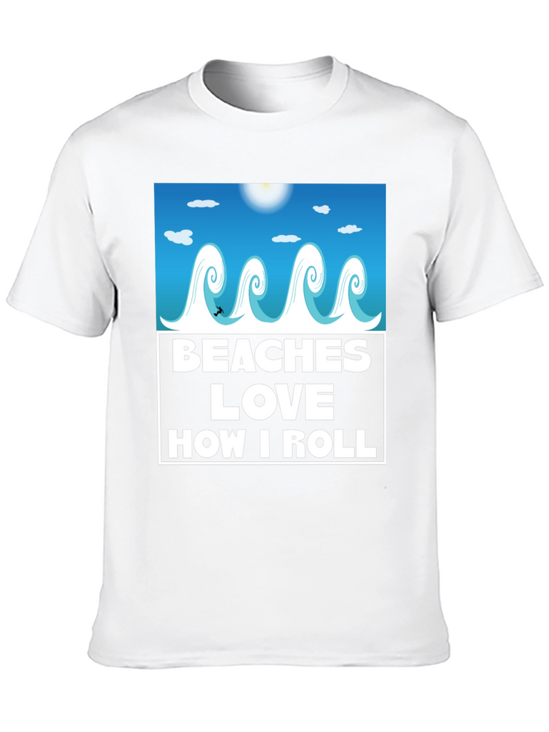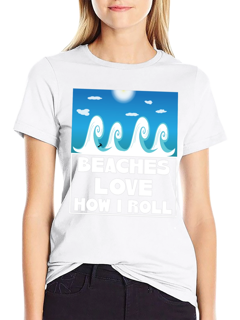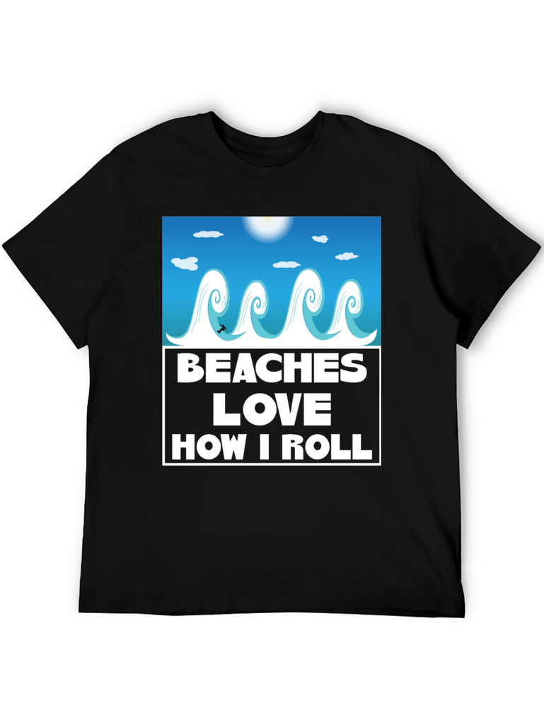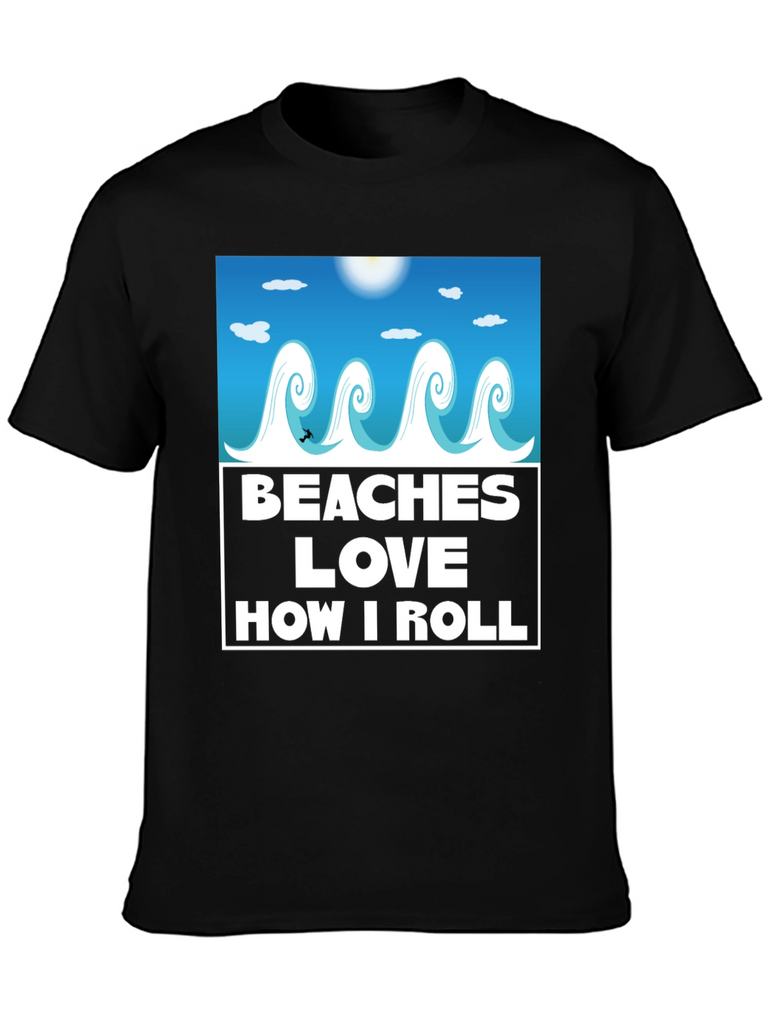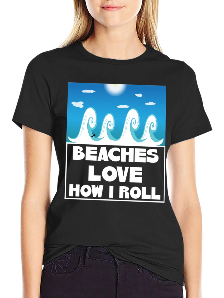 Show off your fun side with this eye-catching black T-shirt. The shirt features a playful graphic design of ocean waves, a bright sun, and the bold text "BEACHES LOVE HOW I ROLL." Made from a comfortable-looking fabric, this tee is perfect for casual wear, beach outings, or vacation. The design suggests a love for surfing or a carefree attitude. It's a great conversation starter and a fun addition to your wardrobe. Wear it to the beach, a summer party, or just around town to spread good vibes. Great gift for beach lovers.