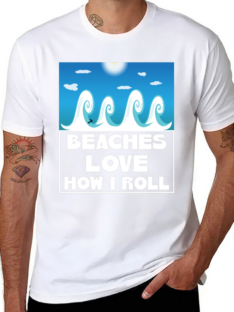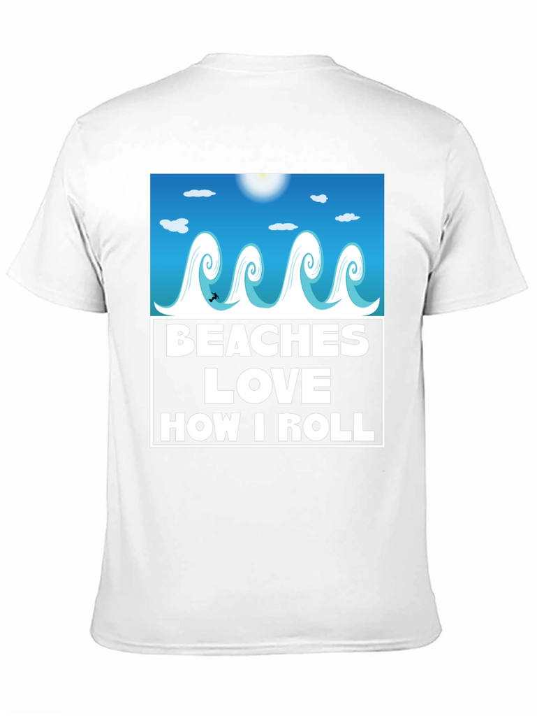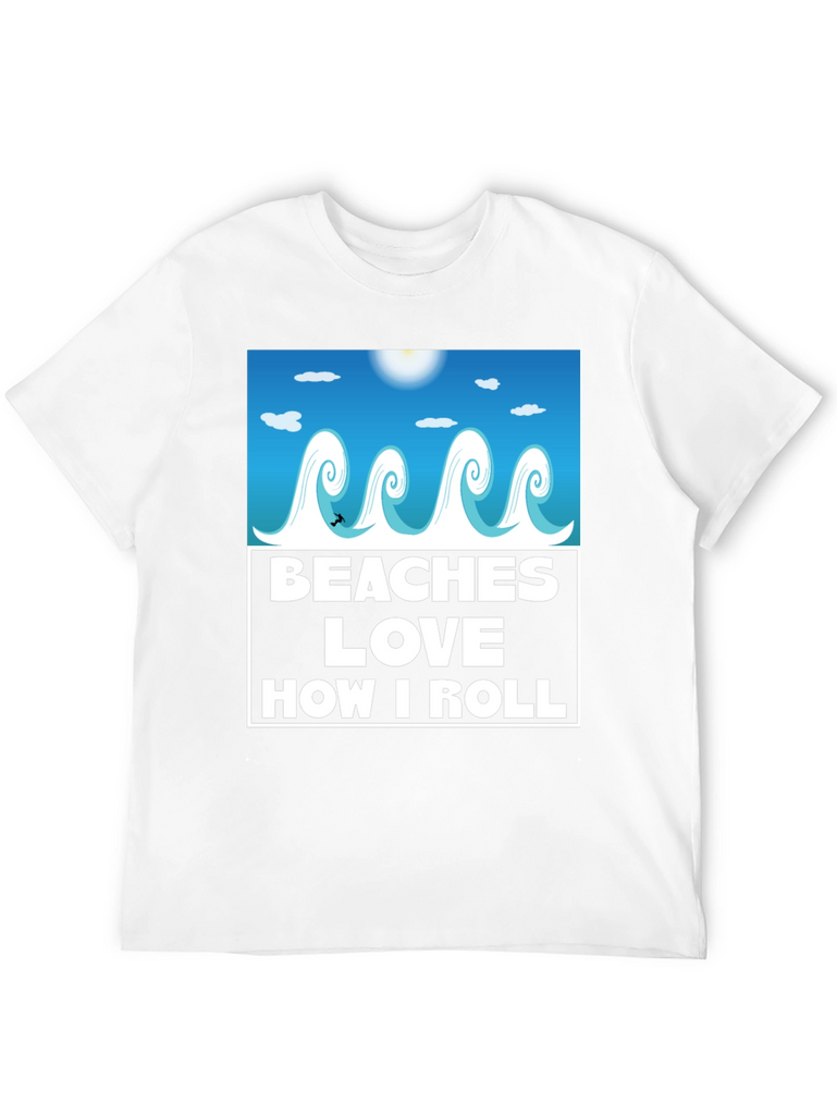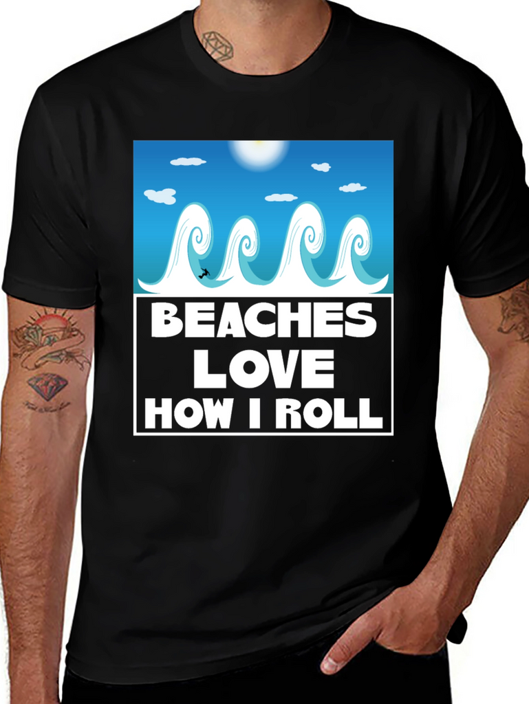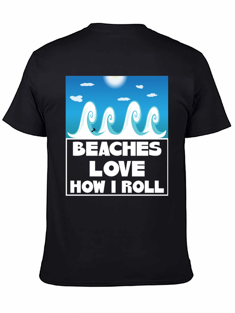 Show off your fun side with this eye-catching black T-shirt. The shirt features a playful graphic design of ocean waves, a bright sun, and the bold text "BEACHES LOVE HOW I ROLL." Made from a comfortable-looking fabric, this tee is perfect for casual wear, beach outings, or vacation. The design suggests a love for surfing or a carefree attitude. It's a great conversation starter and a fun addition to your wardrobe. Wear it to the beach, a summer party, or just around town to spread good vibes. Great gift for beach lovers.