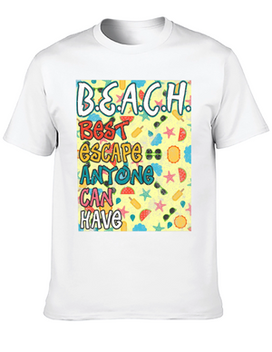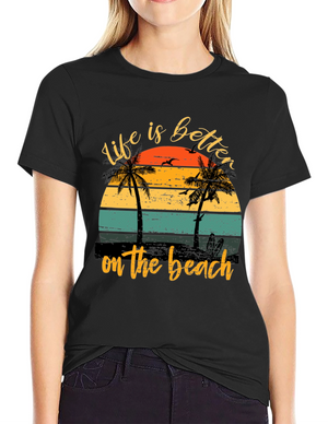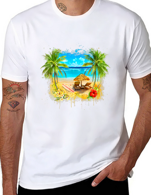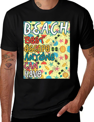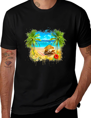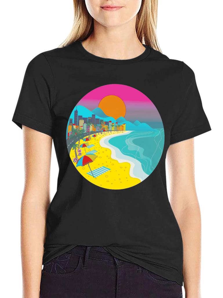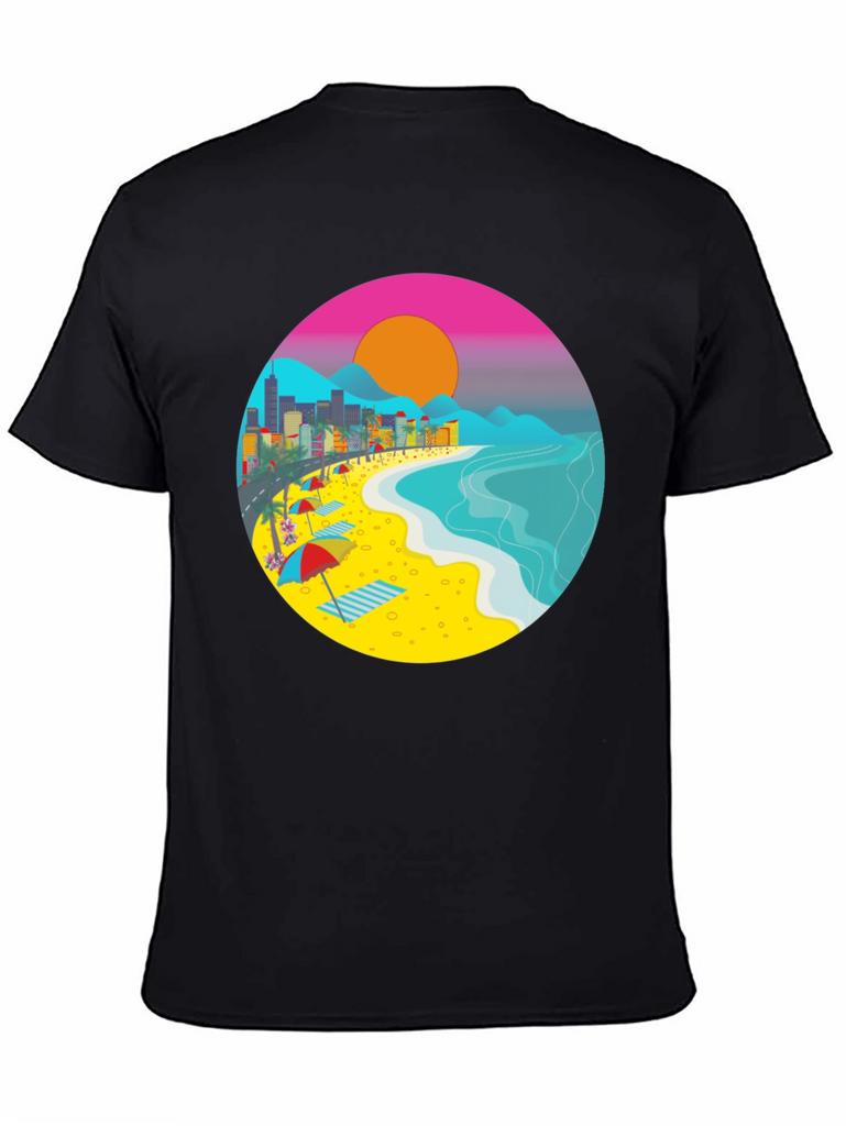 Embrace summer vibes with this eye-catching black tee featuring a vibrant beachscape design. The round graphic showcases a sunny beach scene with playful details - colorful umbrellas, palm trees, city buildings and a serene ocean view. Perfect for casual outings, beach trips, or adding a pop of color to your everyday look. Made with soft and breathable cotton blend, this t-shirt offers both comfort and style. This tee is sure to be a conversation starter. Get yours today and bring the beach to your wardrobe!