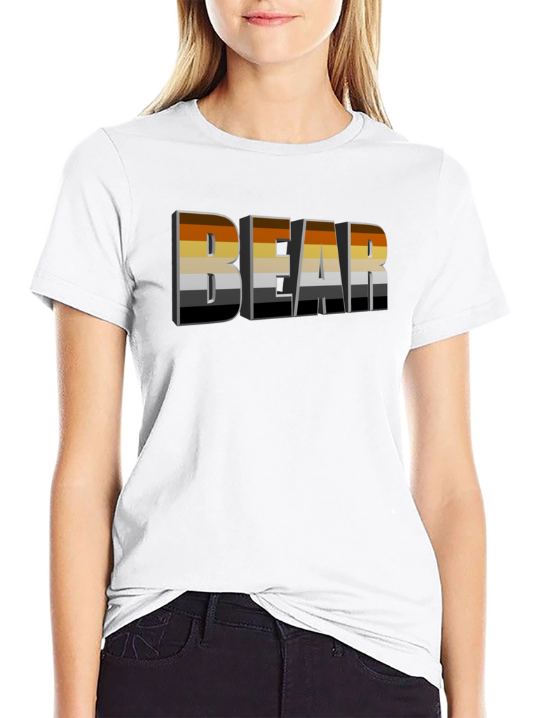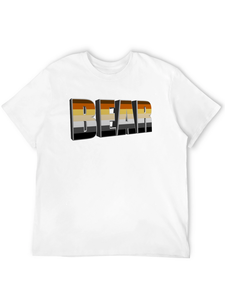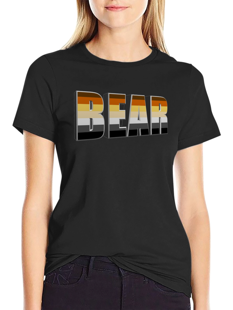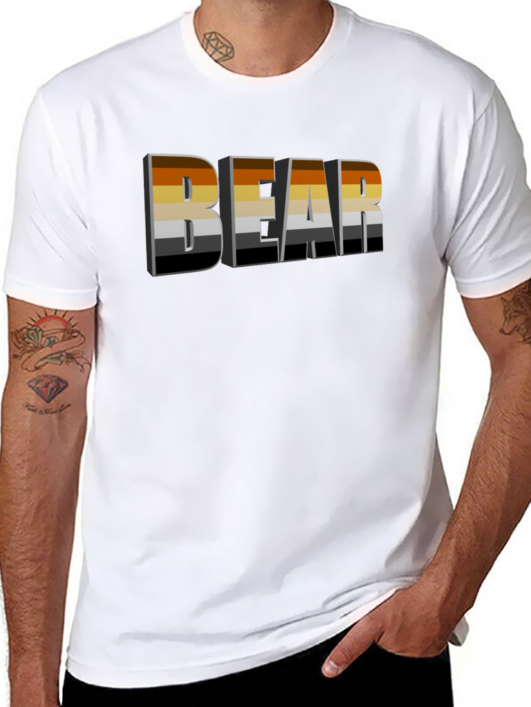 Show your pride with this bold black t-shirt featuring the iconic Bear Brotherhood flag colors. The word "BEAR" is emblazoned across the chest in a striking 3D font, each letter showcasing the distinctive brown, gold, white, grey, and black stripes of the Bear Pride flag. Made from a comfortable, breathable fabric, this t-shirt is perfect for casual wear, pride events, or simply expressing your identity. The classic fit makes it a versatile addition to any wardrobe. Wear it with pride and let your colors shine!