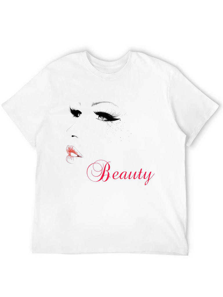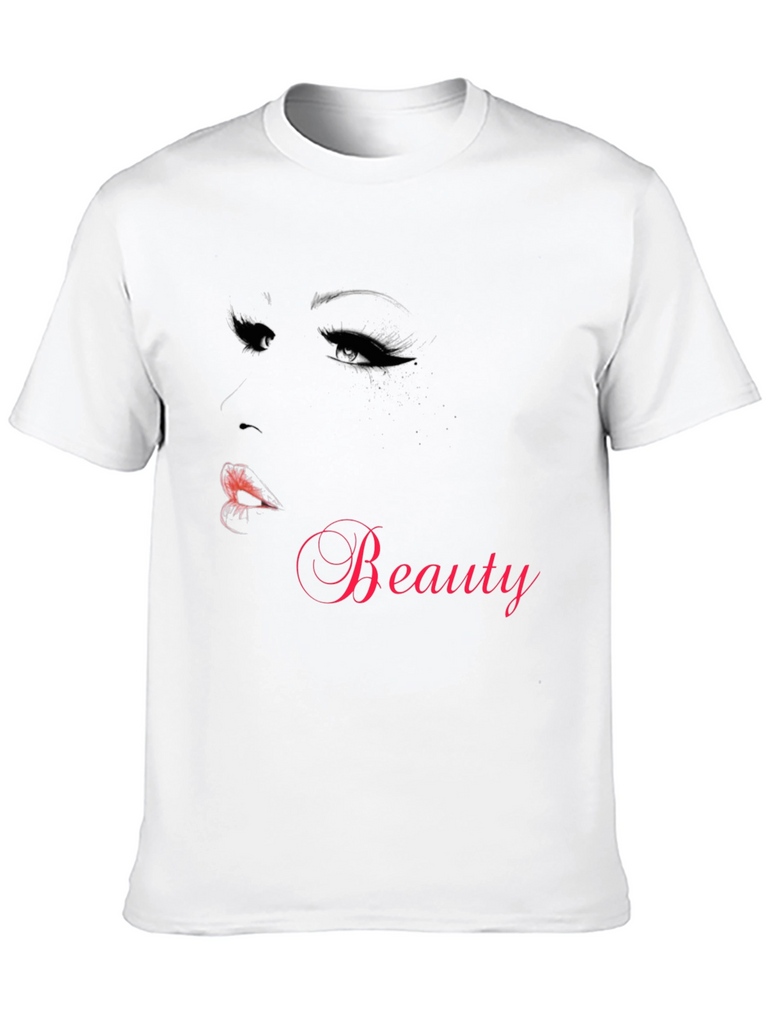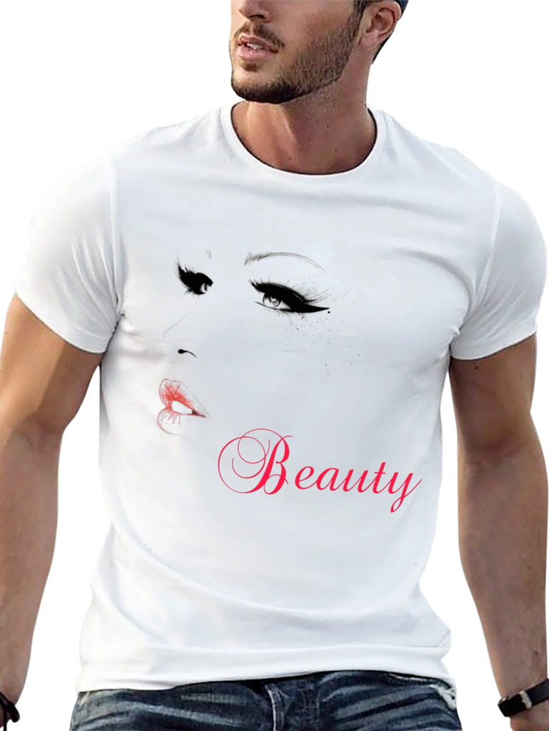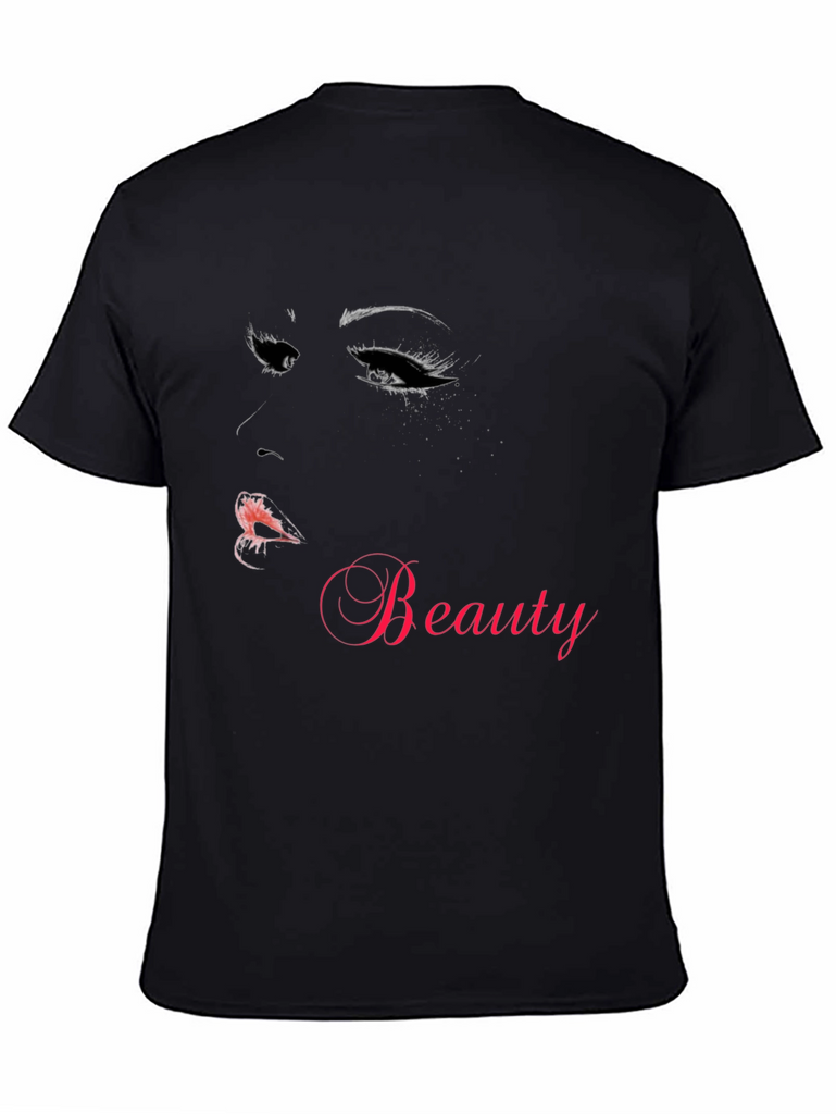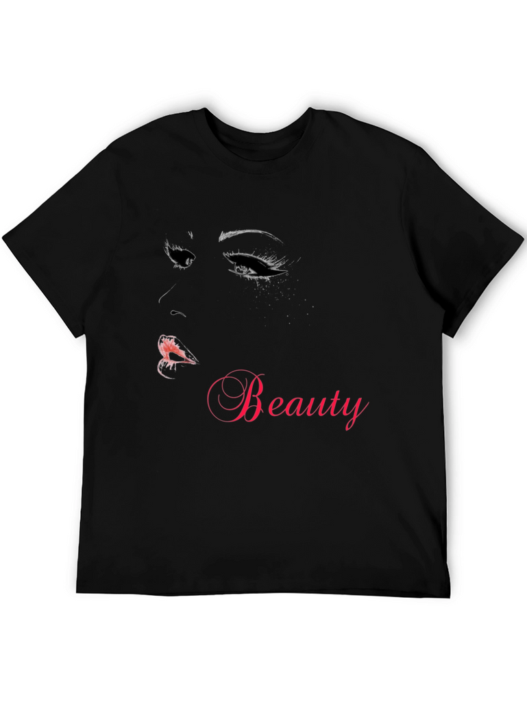 Show off your love for beauty with this stylish black t-shirt. Made from comfortable material, this tee features a striking graphic of a woman's face with dramatic eyes and lips. The word "Beauty" is elegantly displayed in a complementary hue, making it a standout piece. Perfect for casual wear, this shirt is a great addition to any wardrobe. It is ideal for everyday use or a night out with friends. Be fashion-forward and eye-catching with this unique t-shirt.