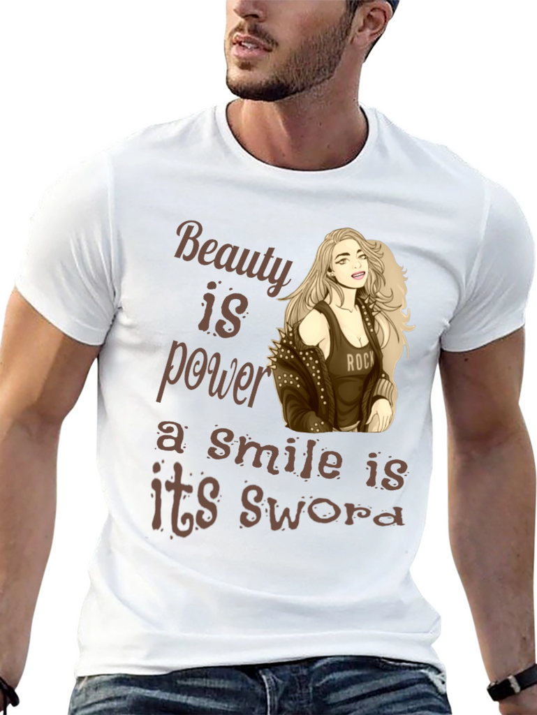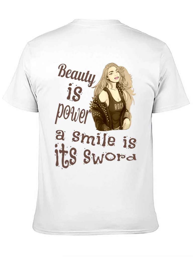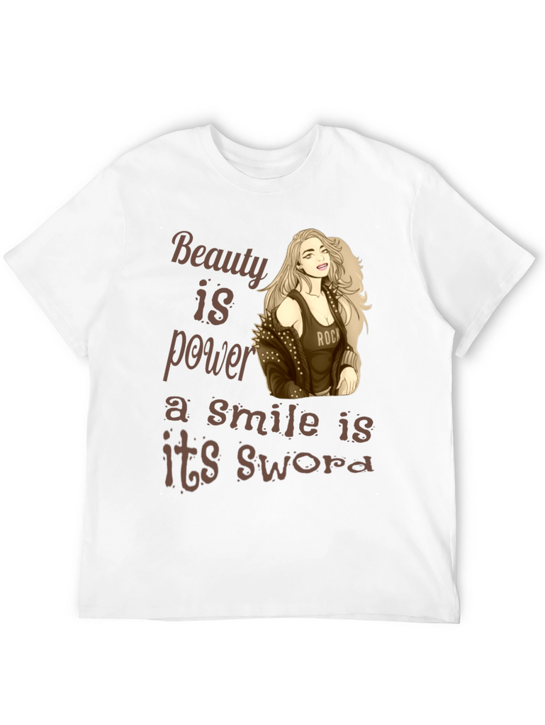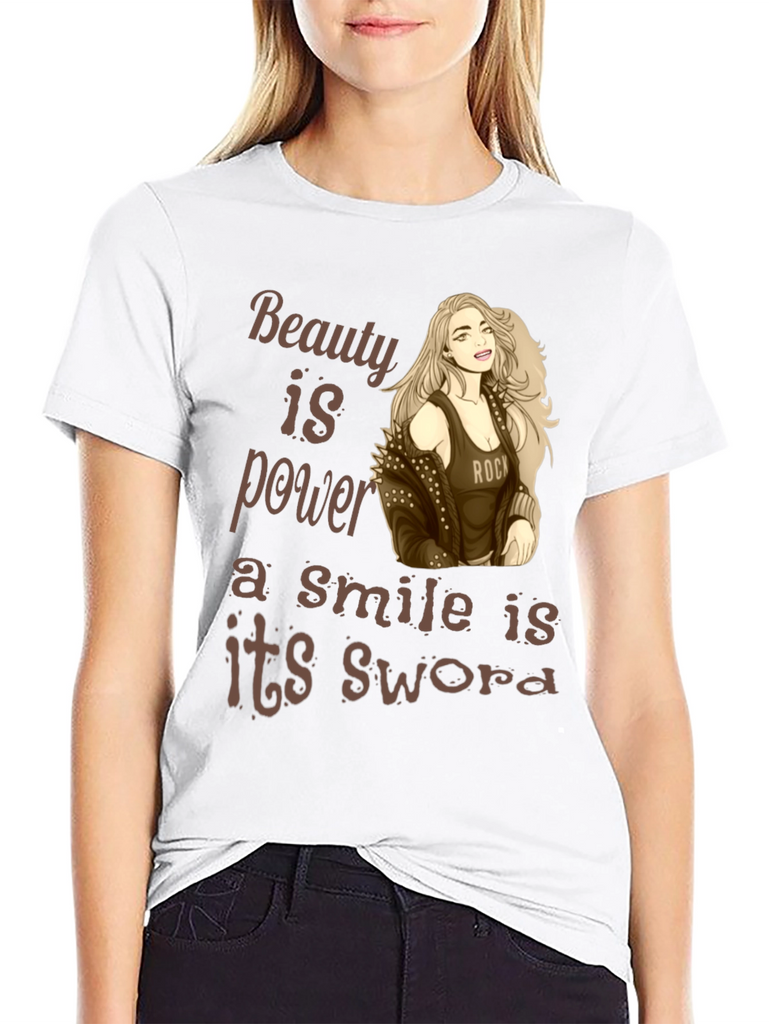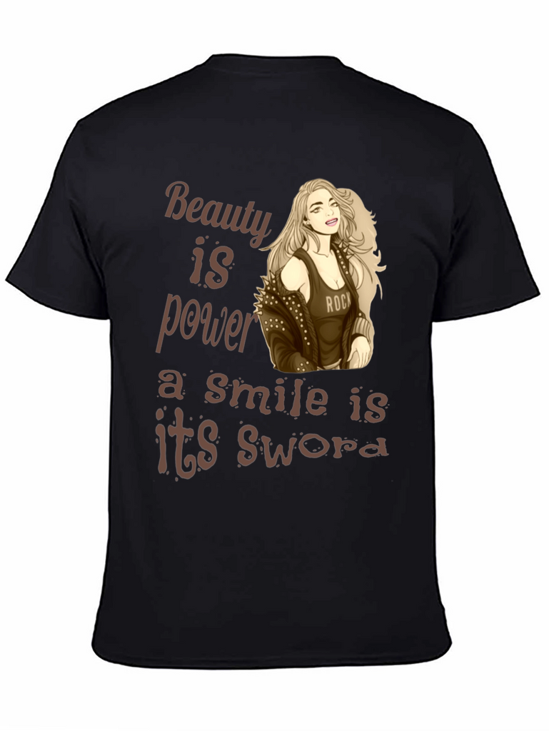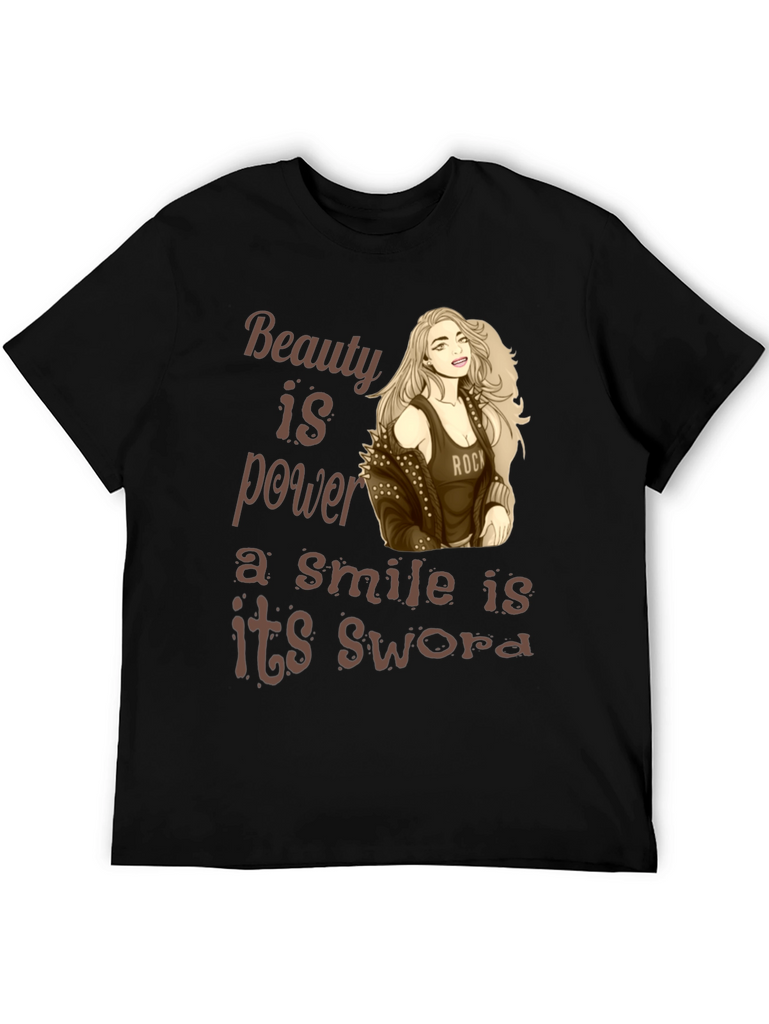 Show off your fierce side with this stylish black t-shirt. Featuring the inspiring quote "Beauty is Power, A Smile is its Sword" in a warm brown font, this tee makes a statement. The eye-catching design also includes a detailed illustration of a confident woman in a studded jacket, adding an edgy touch. Crafted from comfortable fabric, this tee is perfect for casual outings, concerts, or expressing your unique personality. Make a bold statement and empower yourself with this unique graphic tee. Available in standard sizes.