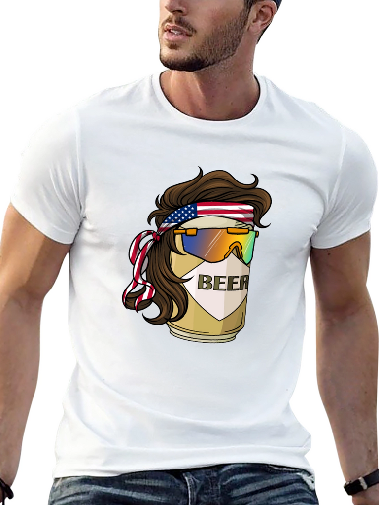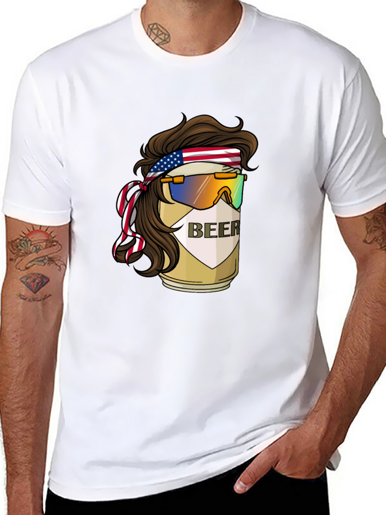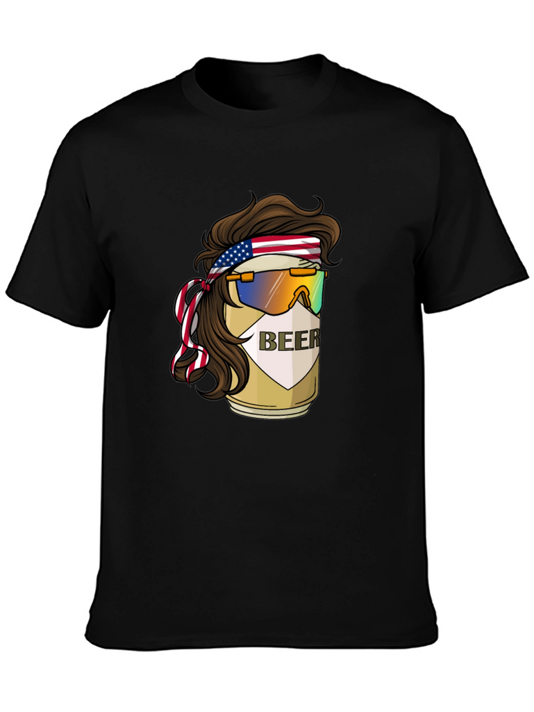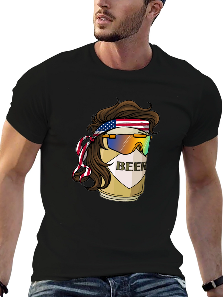 Show your fun, patriotic side with this unique graphic t-shirt! The design features a beer can cleverly styled with a mullet haircut, an American flag headband, and retro sunglasses. The "BEER" label is prominently displayed on the can, adding a humorous touch. Made from soft, breathable fabric, this t-shirt is comfortable for everyday wear. Perfect for parties, barbecues, or casual outings, this tee is sure to turn heads and spark conversations. A great way to express your love for beer and country in a fun, lighthearted way.