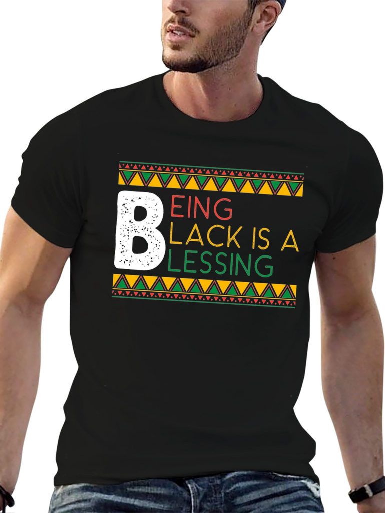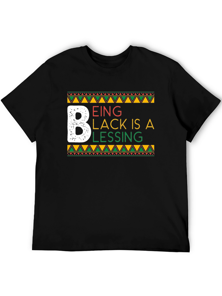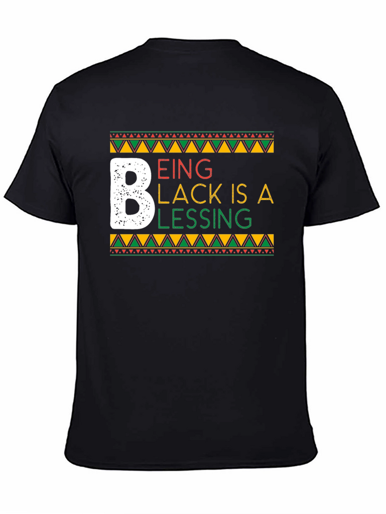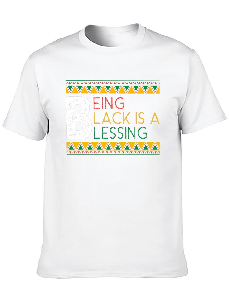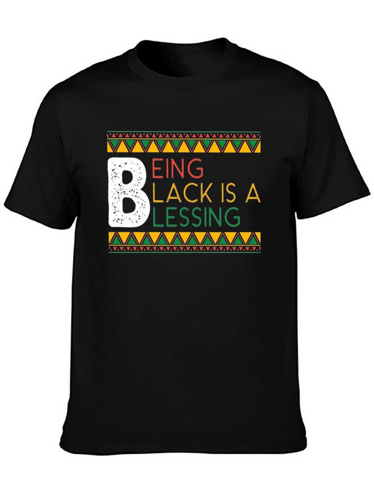 Showcase your pride with this bold 'Being Black is a Blessing' graphic tee. The design features a mix of vibrant colors, incorporating Pan-African-inspired patterns at the top and bottom edges. The lettering is eye-catching, with a textured white 'B' and other words colored in red, yellow, and green. Made from a comfortable, breathable fabric, this shirt is perfect for everyday wear, cultural events, or as a statement piece to spark conversation. Let your clothing reflect your identity and celebrate your heritage with this unique tee.