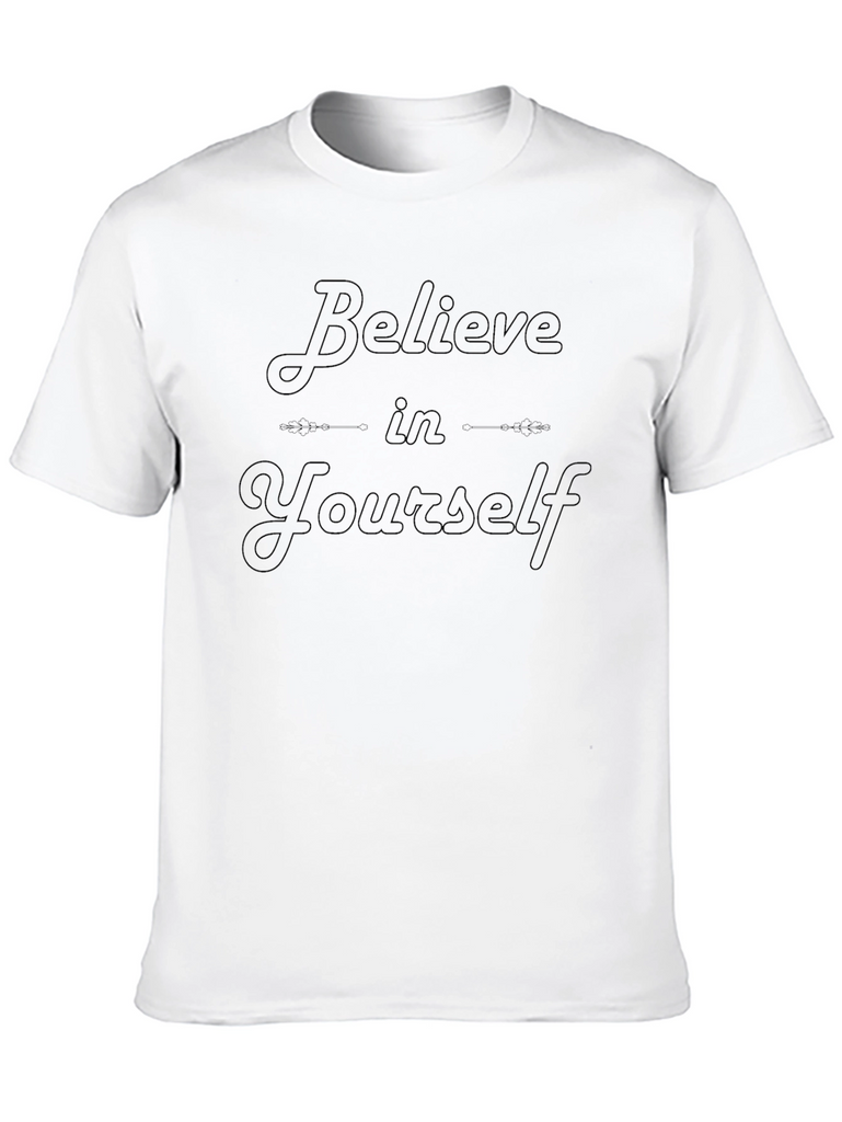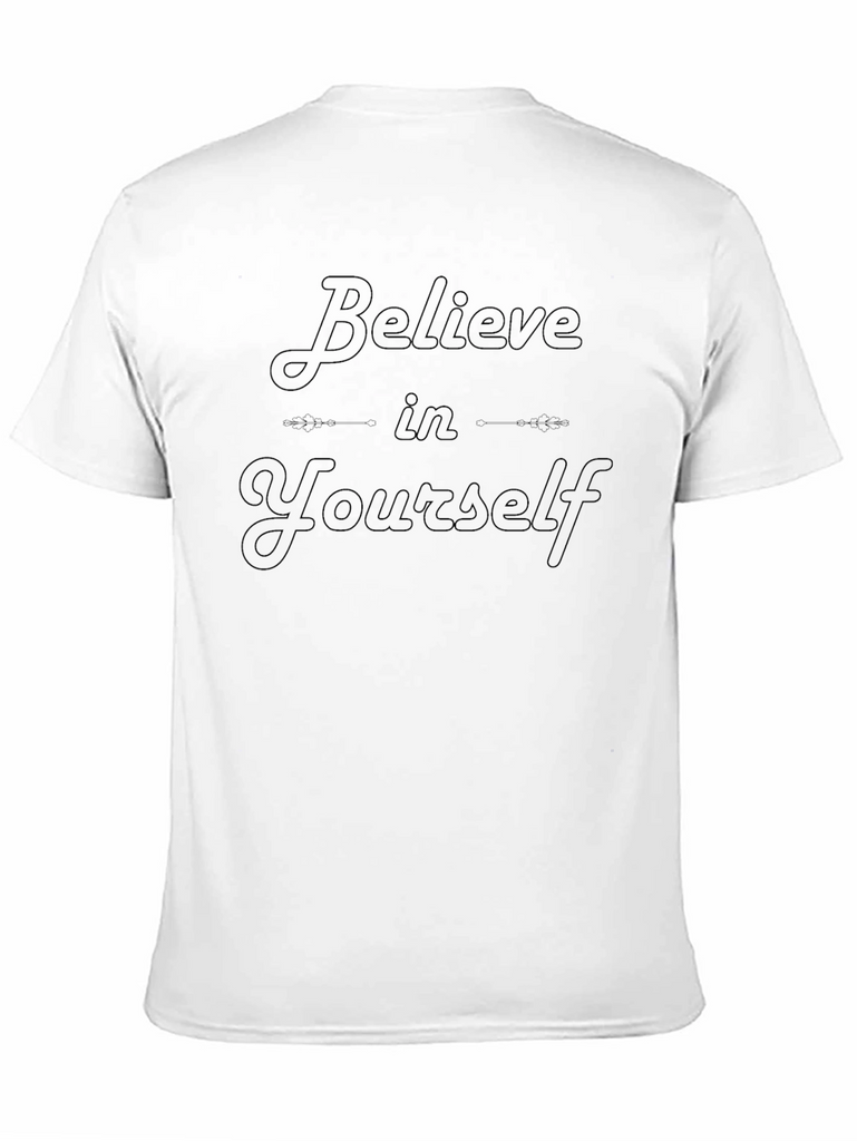 Showcase your self-confidence with this stylish black t-shirt featuring the uplifting message "Believe in Yourself." Crafted from what appears to be soft, breathable cotton fabric, this tee offers both comfort and a positive statement. The design is printed in a darker shade of black, giving the text a subtle, almost embossed effect. Perfect for everyday wear, workouts, or casual outings, this shirt is a great way to inspire yourself and those around you. Pair it with jeans, shorts, or leggings for a versatile look that embodies self-assurance. This t-shirt will become a staple in your wardrobe.