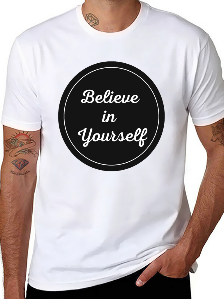 Show your inner confidence with this stylish black T-shirt. Featuring a bold, circular graphic with the inspiring message "Believe in Yourself", this tee is perfect for everyday wear. Made from a comfortable, breathable fabric, it offers a relaxed fit that's ideal for casual outings, gym sessions, or simply lounging at home. The classic black color ensures versatility, allowing it to be easily paired with jeans, shorts, or joggers. This motivational tee is not just a piece of clothing, but a statement. Wear your self-belief proudly and inspire those around you!