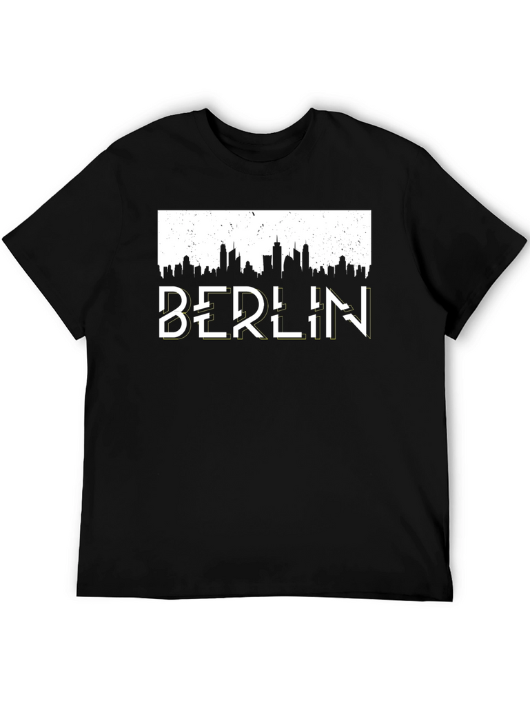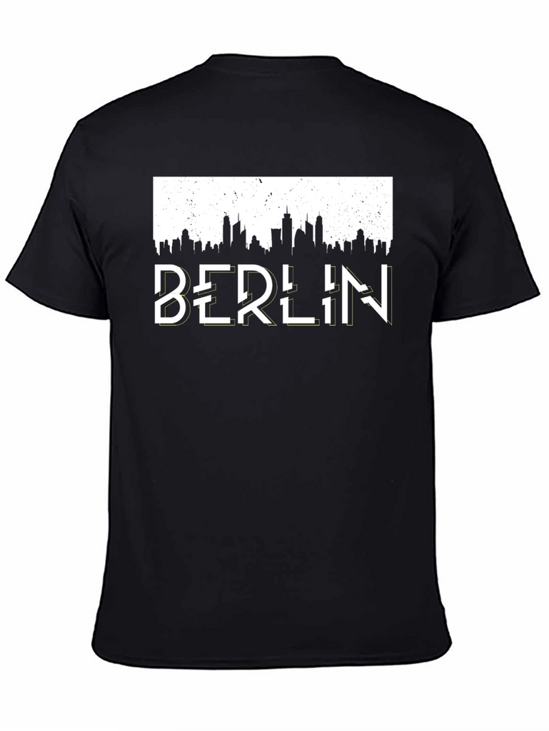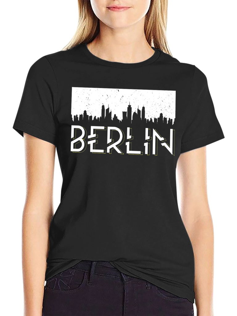 Show your love for the German capital with this striking Berlin skyline t-shirt. Featuring a bold, graphic print, the tee showcases the city's iconic silhouette above the word "BERLIN." The design has a modern, edgy font. Made from what appears to be soft, comfortable cotton, this black tee offers a classic fit, perfect for everyday wear. The minimalist design makes it easy to pair with jeans, shorts, or joggers for a casual yet stylish look. Ideal for tourists, expats, or anyone who appreciates Berlin's unique vibe.