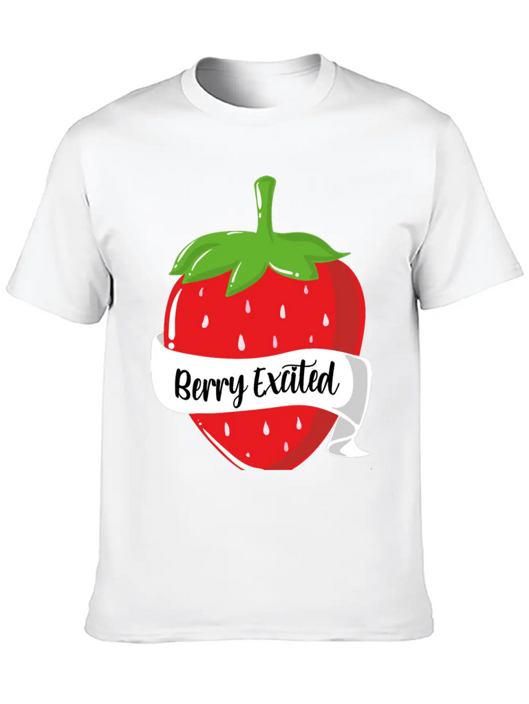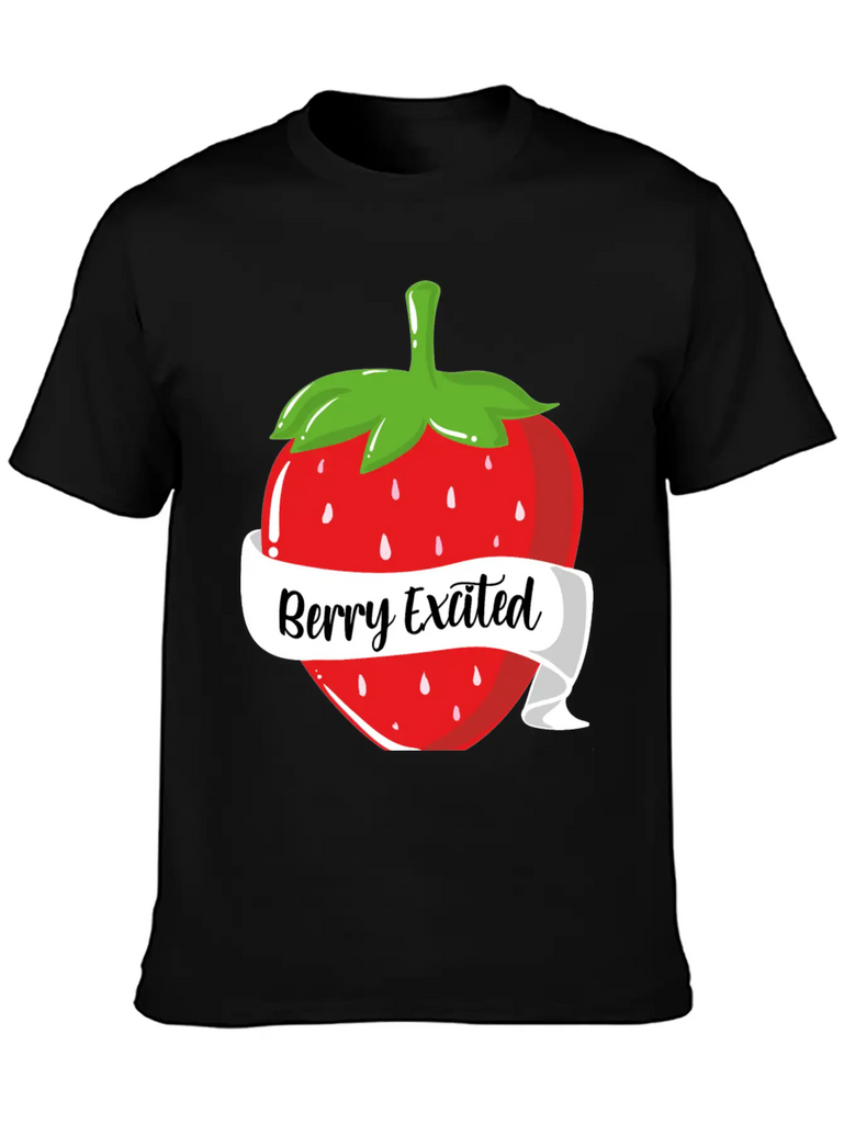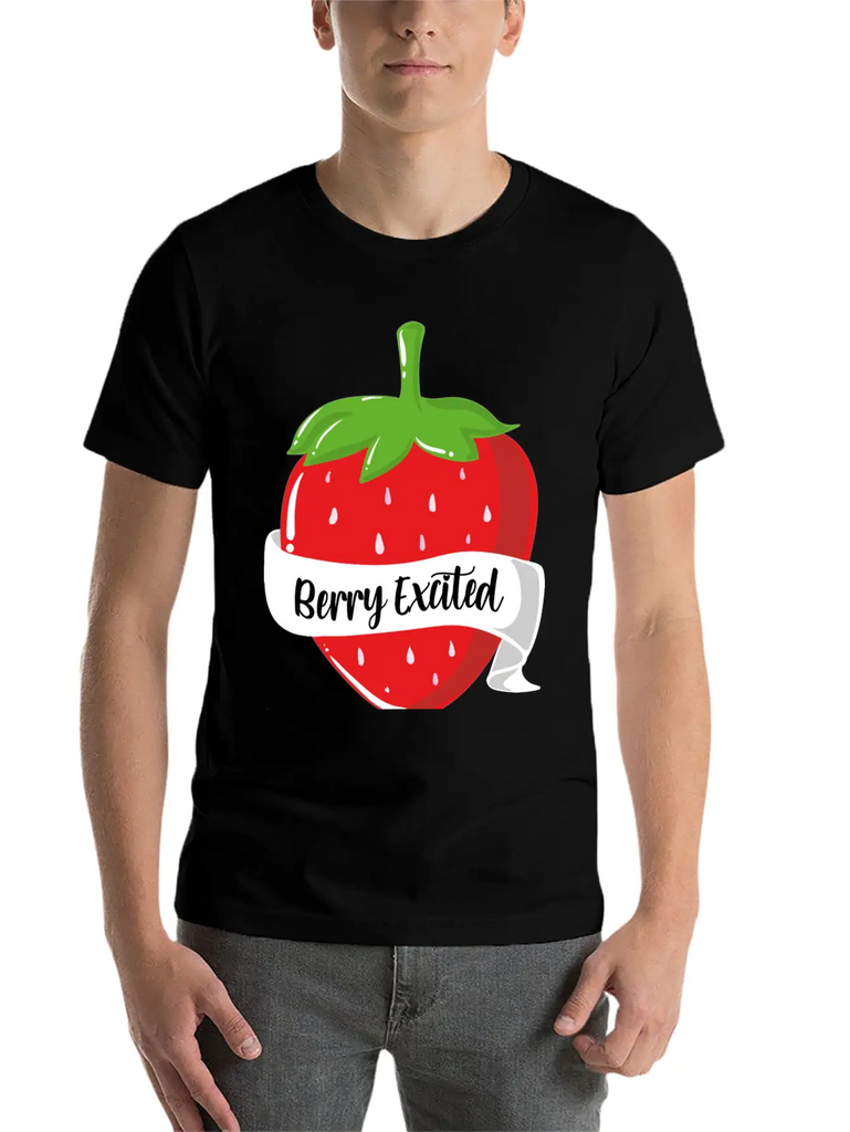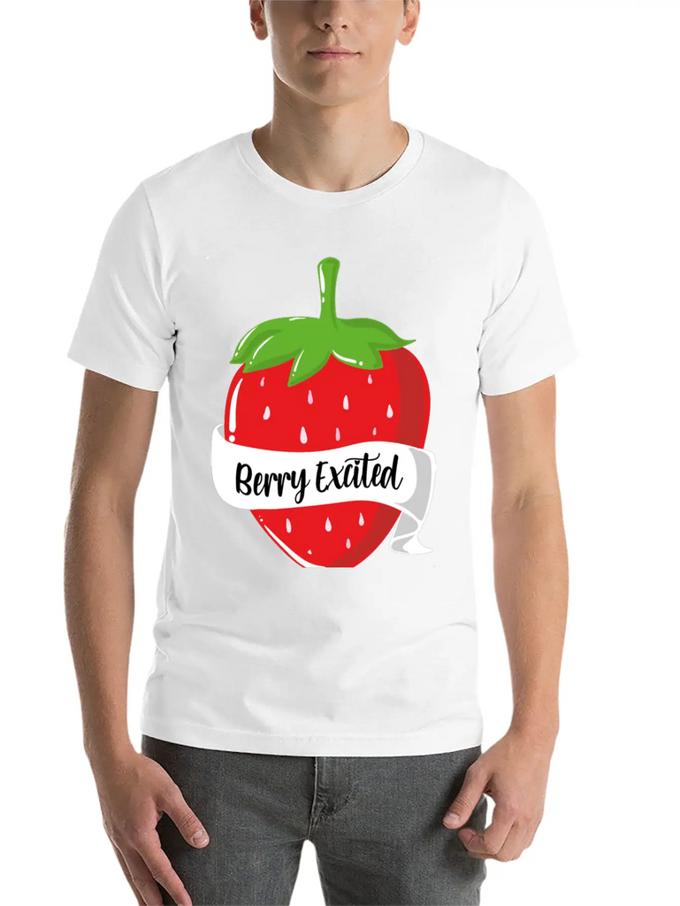 This shirt showcases the Berry excited strawberry very excited pun in a sleek and subtle way. A must-have for fans of timeless design. Pure cotton feel.