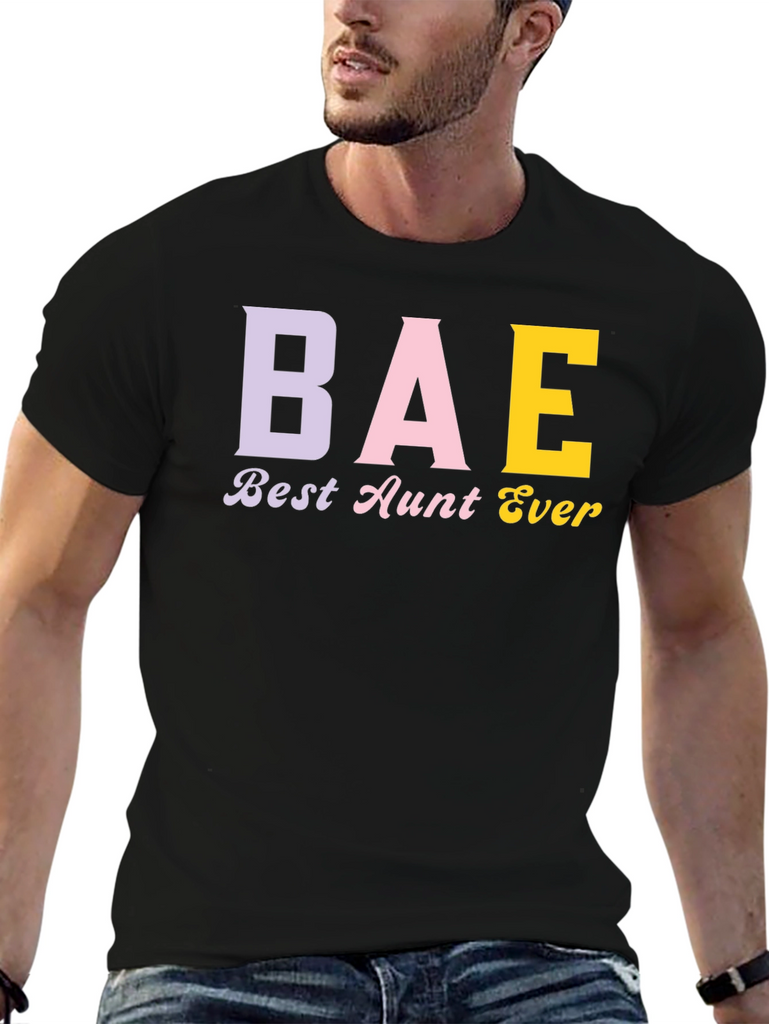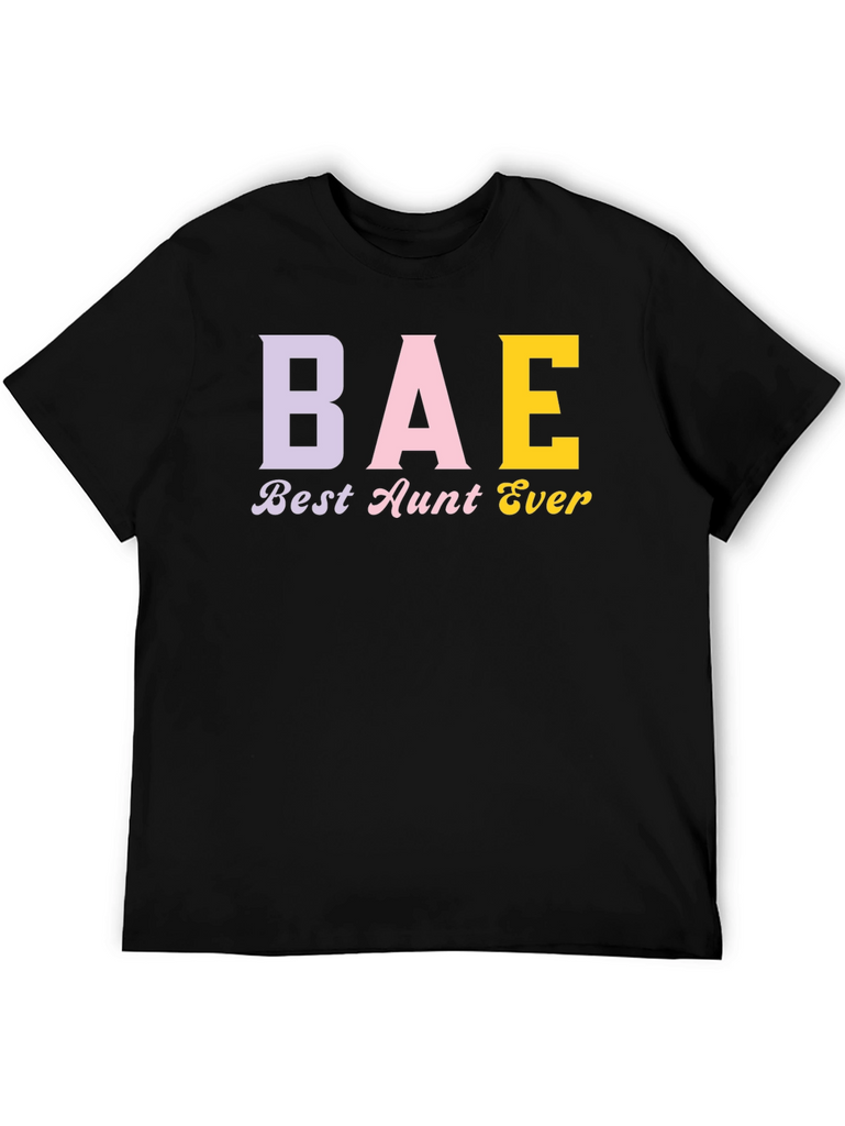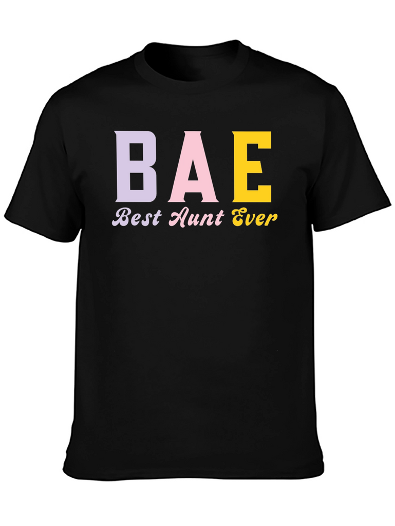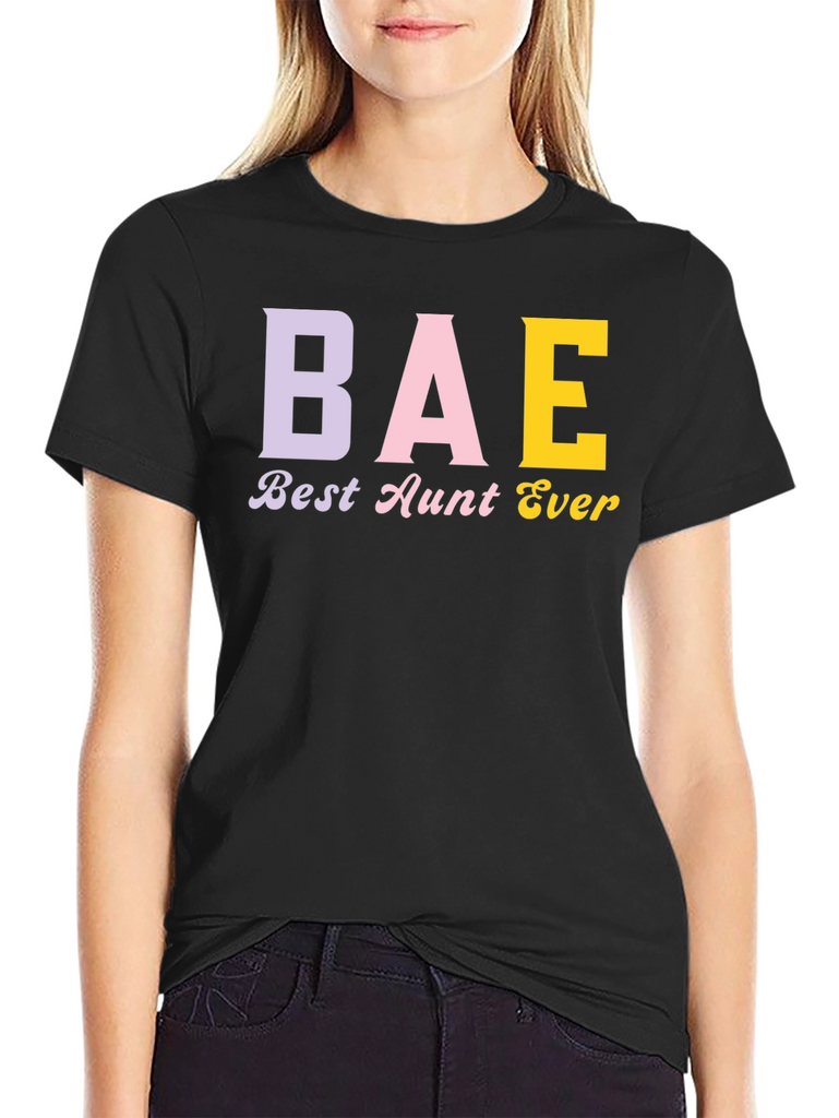 Show your love for the best aunt ever with this stylish black t-shirt. The shirt features the text "BAE" in pastel purple, pink, and yellow, along with "Best Aunt Ever" printed below. Made from soft, breathable fabric, this comfortable tee is perfect for everyday wear or special occasions. It's a great gift idea for birthdays, holidays, or just to show your appreciation for that special aunt in your life. The classic fit and versatile design make it easy to pair with jeans, shorts, or skirts. Let everyone know who the best aunt is with this fun and fashionable t-shirt!