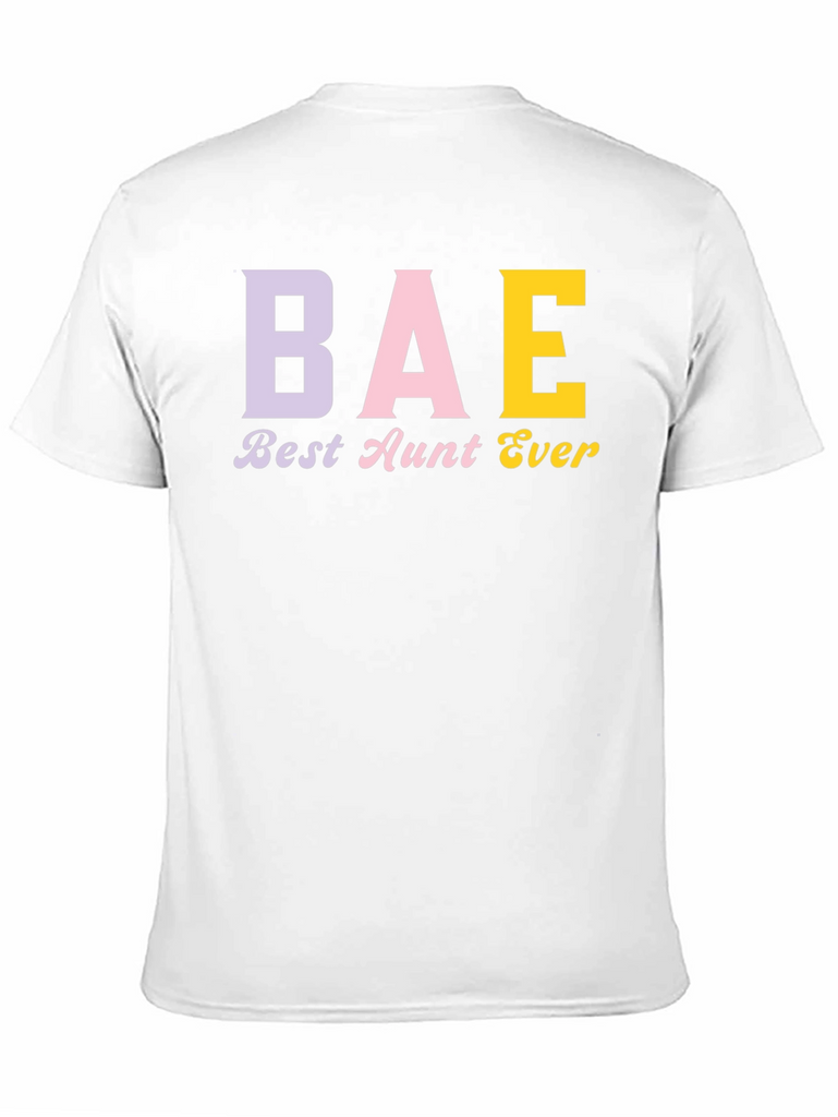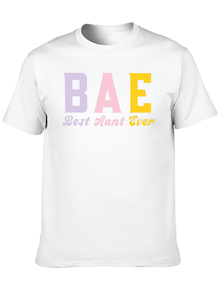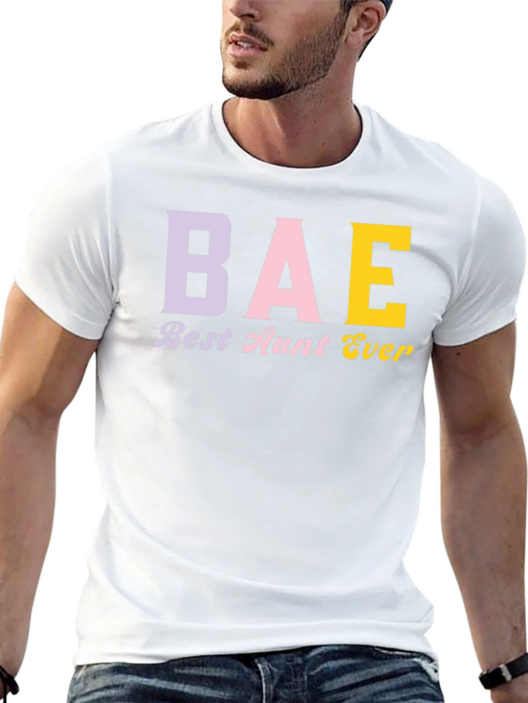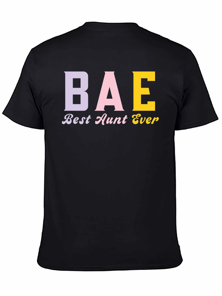Show your love for the best aunt ever with this stylish black t-shirt. The shirt features the text "BAE" in pastel purple, pink, and yellow, along with "Best Aunt Ever" printed below. Made from soft, breathable fabric, this comfortable tee is perfect for everyday wear or special occasions. It's a great gift idea for birthdays, holidays, or just to show your appreciation for that special aunt in your life. The classic fit and versatile design make it easy to pair with jeans, shorts, or skirts. Let everyone know who the best aunt is with this fun and fashionable t-shirt!