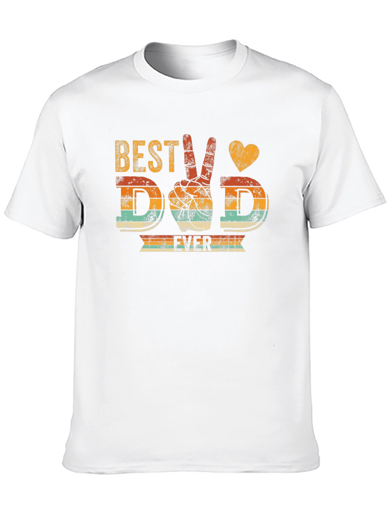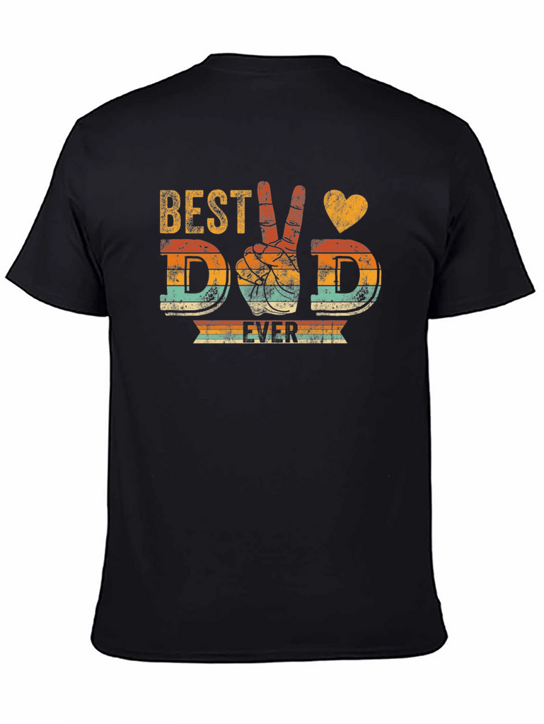 Show your love for the best dad ever with this stylish graphic t-shirt. The shirt features a vintage-inspired design with "Best Dad Ever" typography, incorporating a peace sign and heart. The design has a retro vibe, with orange, yellow, and teal hues, and distressed texture. The print is placed on a classic black t-shirt, providing a versatile backdrop for the vibrant graphic. Made from soft, breathable cotton fabric, this tee offers all-day comfort. Perfect for Father's Day, birthdays, or just to show appreciation, this t-shirt is sure to become a wardrobe favorite for any awesome dad.