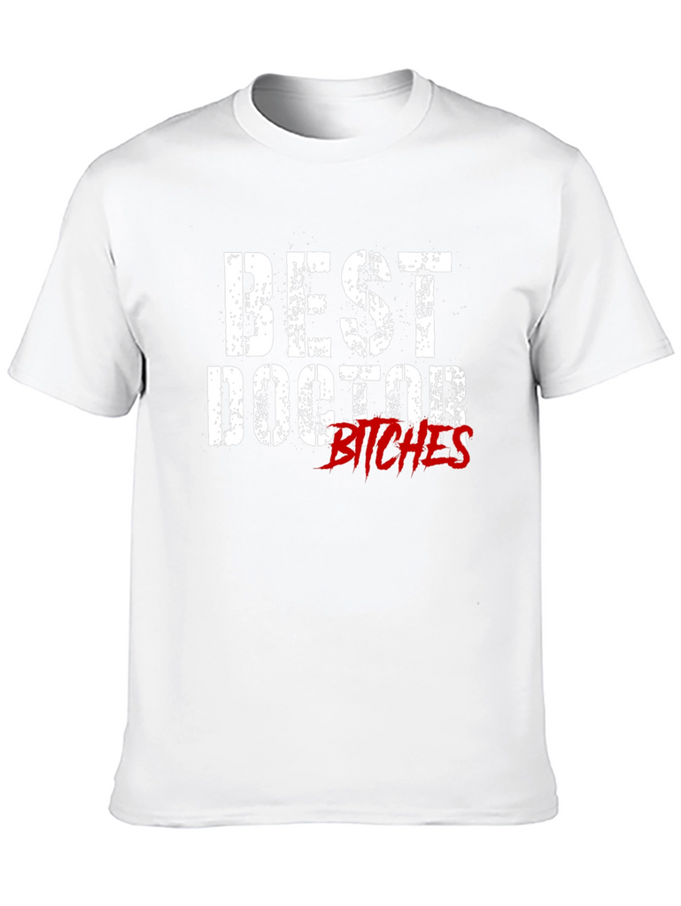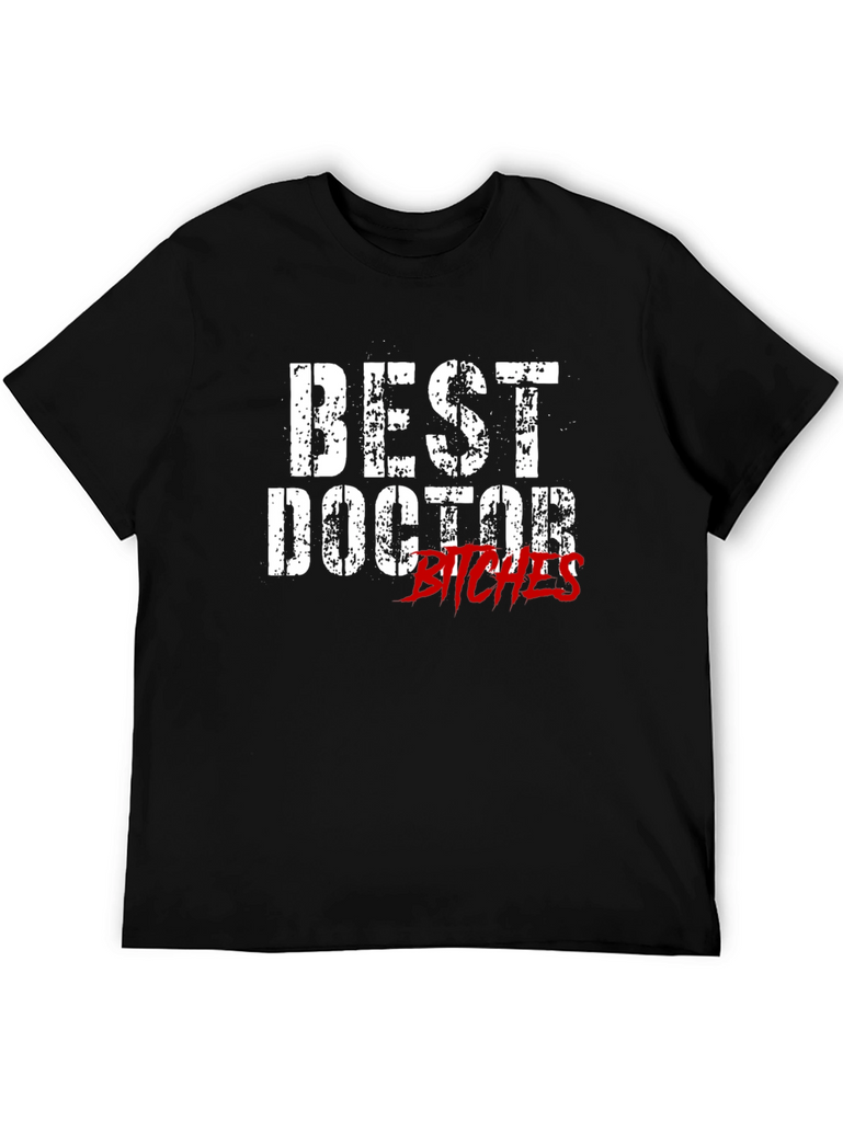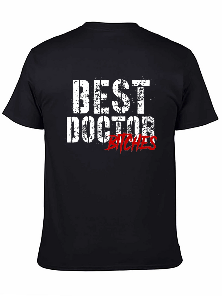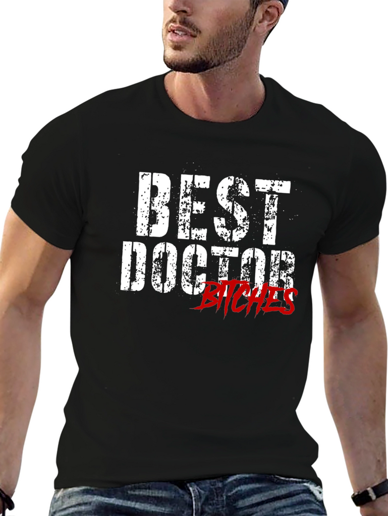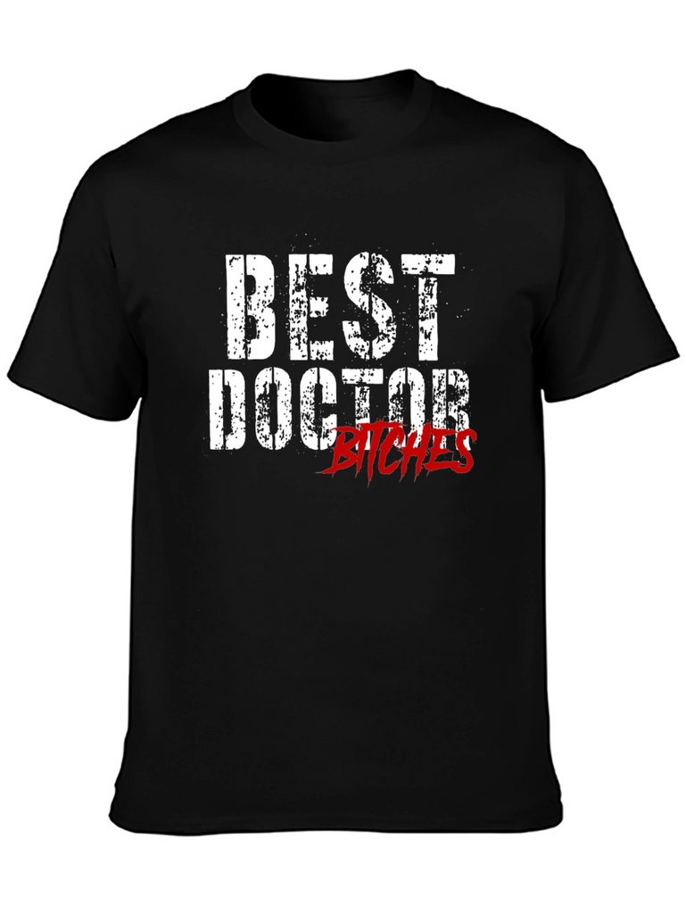 Show off your humorous side with this eye-catching graphic tee! The black t-shirt features bold, distressed white lettering that proudly proclaims "BEST DOCTOR," playfully contrasted by the word "BITCHES" in vibrant red. Perfect for casual wear, this tee adds a touch of edgy humor to your wardrobe. Crafted from comfortable materials, this shirt will become your go-to choice for a relaxed and stylish look. Makes a bold statement and is sure to turn heads. Ideal for medical professionals with a sense of humor!