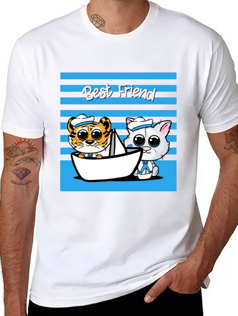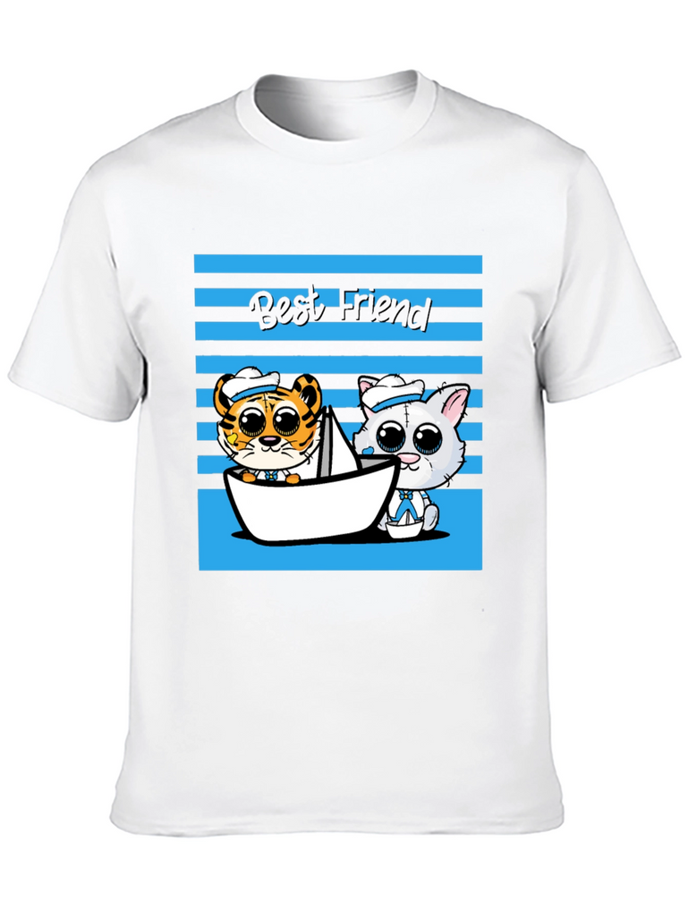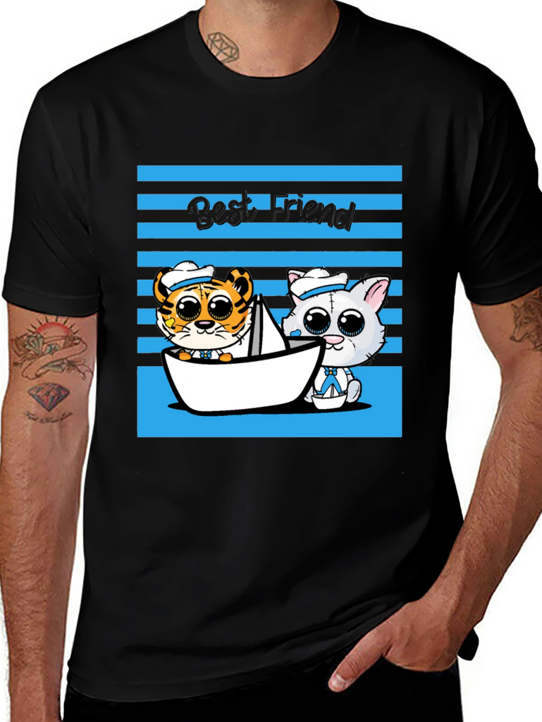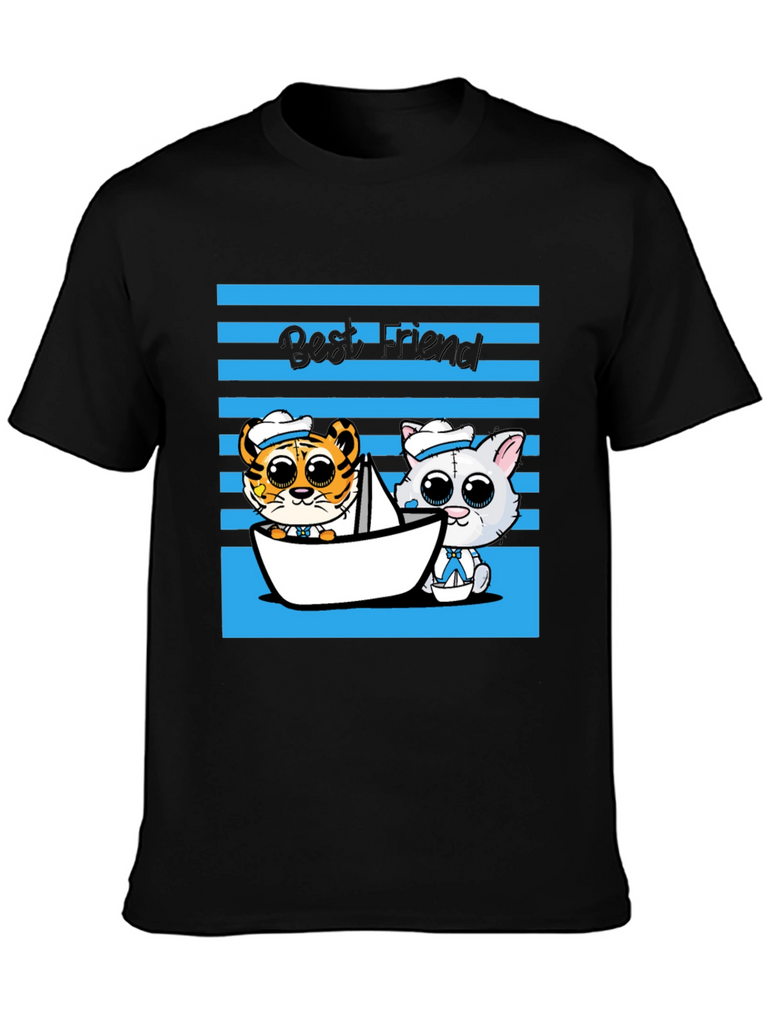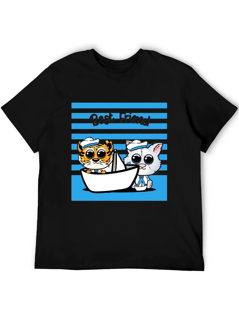 Show off your love for friendship with this adorable graphic tee! This black t-shirt features a charming cartoon design with a tiger and cat duo sailing in a paper boat, set against a blue striped backdrop and the text "Best Friend." The playful design and comfortable fit make it perfect for casual wear, outings with friends, or as a thoughtful gift for someone special. This tee is sure to bring a smile to everyone's face and add a touch of whimsy to your wardrobe. Get yours today and celebrate the power of friendship!