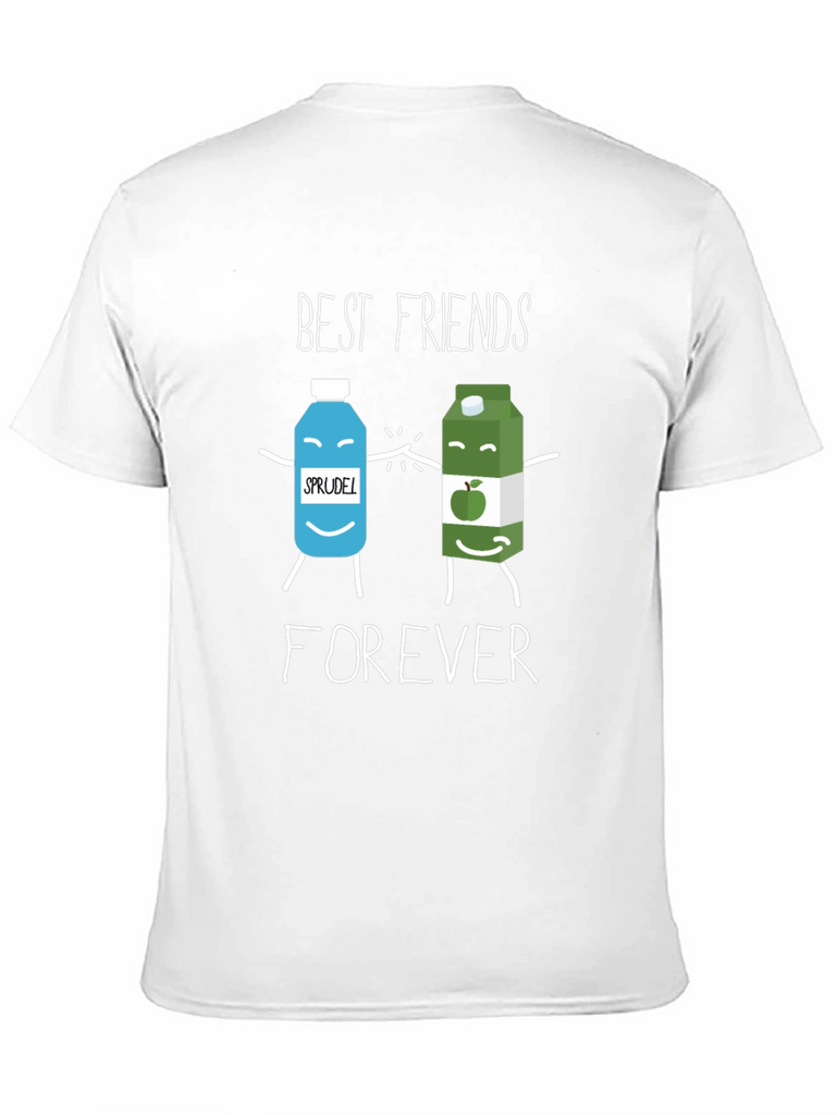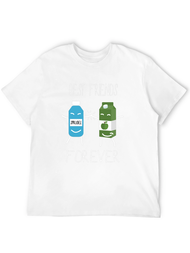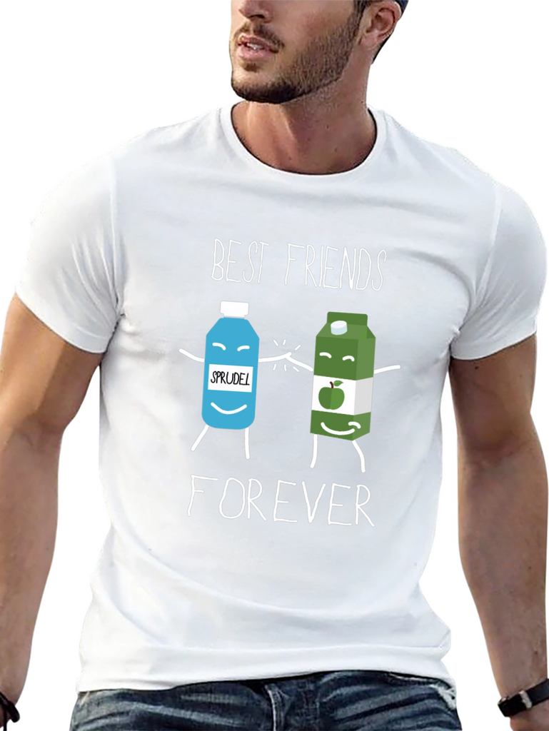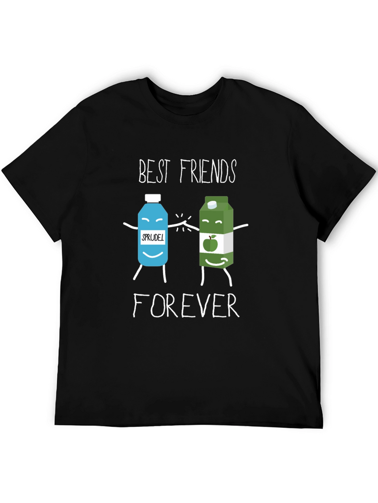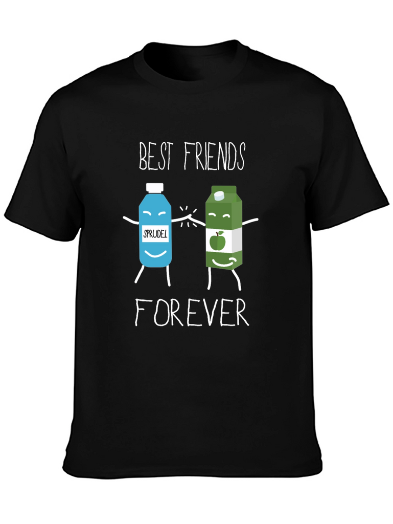 This black t-shirt features a playful graphic design showcasing two cartoon beverage containers, labeled 'Sprudel' and apple juice, holding hands. Above them, the words 'BEST FRIENDS' are printed, followed by 'FOREVER' below. Made from what appears to be a soft cotton blend, this casual tee is perfect for everyday wear. It's a fun and quirky way to express friendship. Wear it to casual outings, friend meetups, or just lounging at home. This tee is sure to bring a smile to anyone's face and is a great conversation starter. The design is printed with clear, vibrant inks. Add this adorable tee to your wardrobe!
