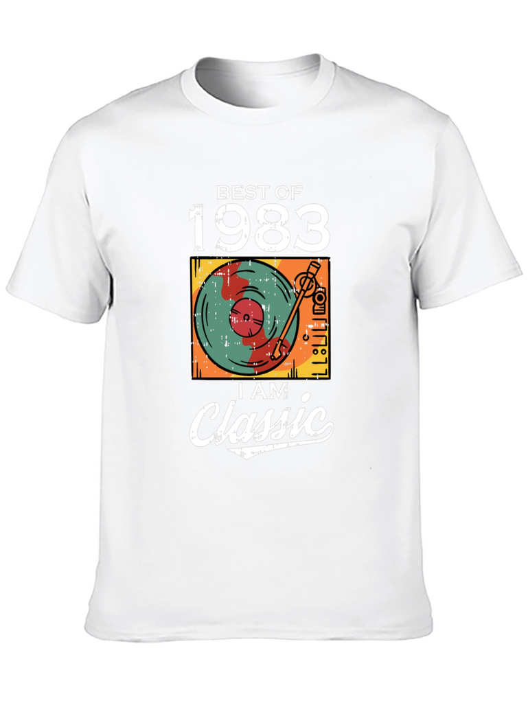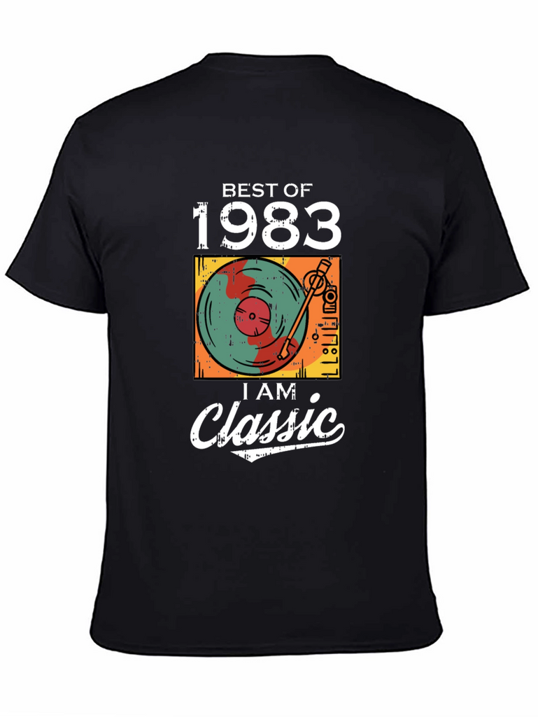 Celebrate a legendary year with this eye-catching graphic t-shirt! The design features "Best of 1983" above a retro-style record player image and "I AM Classic" below, all printed on a soft, comfortable black fabric. This tee is perfect for those who appreciate vintage vibes and timeless style. Wear it casually with jeans or dress it up with a blazer for a unique statement. A great gift for birthdays, anniversaries, or anyone who loves the music and memories of 1983. Show off your classic cool with this must-have t-shirt!