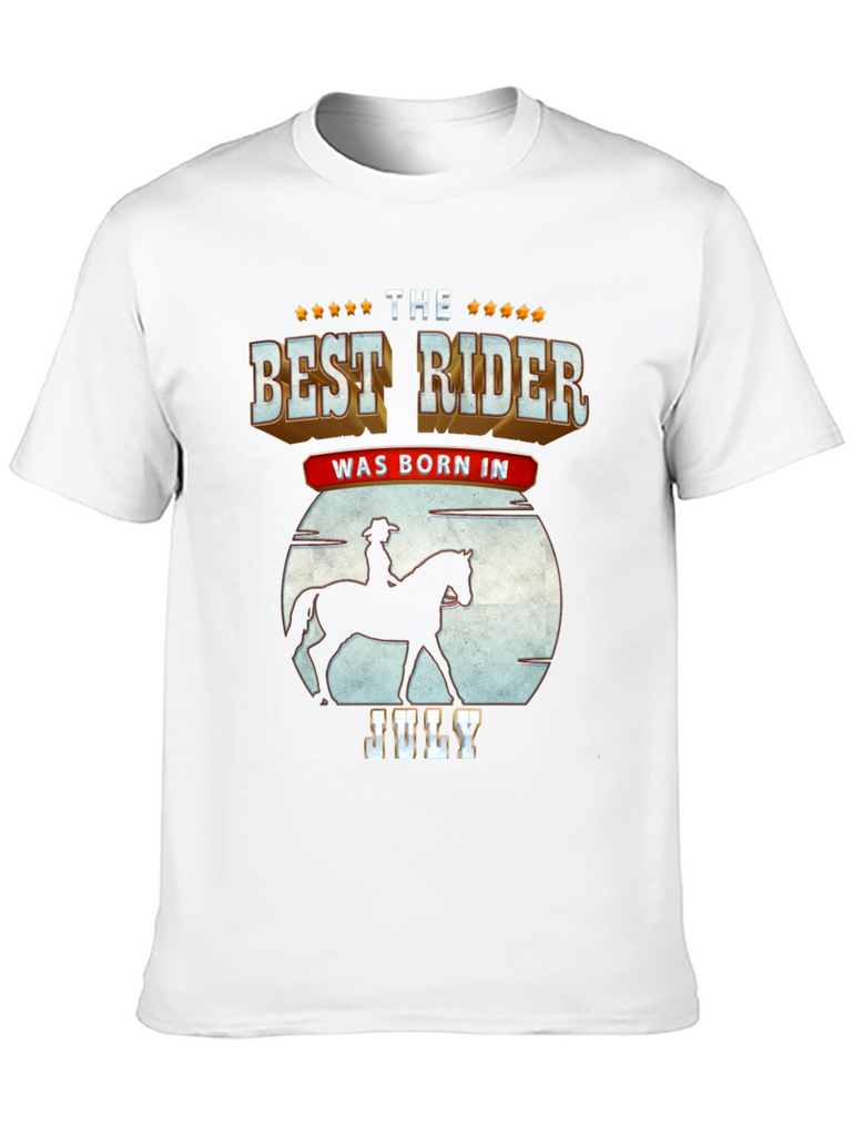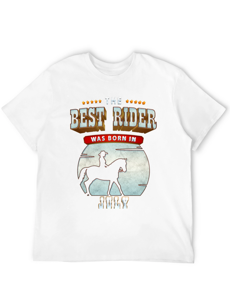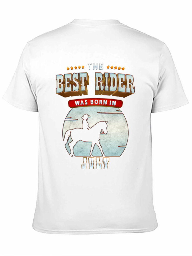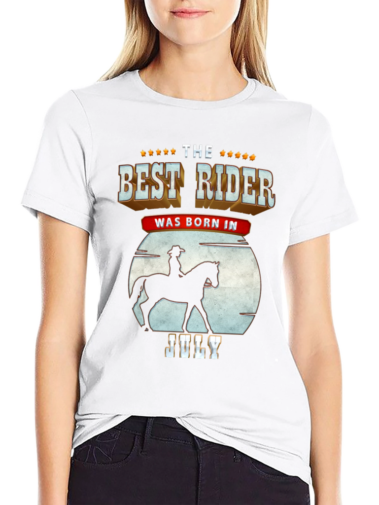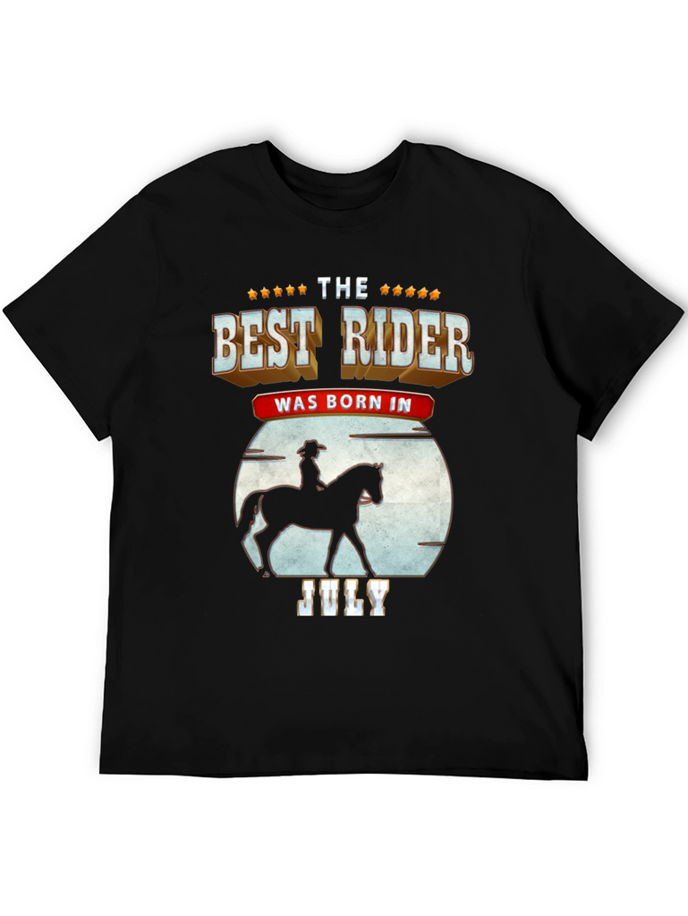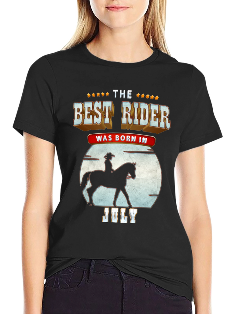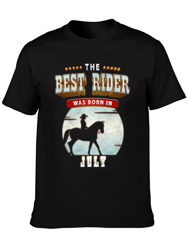 Show off your love for horseback riding with this unique t-shirt. The design features a silhouette of a rider on horseback against a moon backdrop, combined with bold text stating "The Best Rider Was Born In July." The shirt is made from a soft, breathable fabric and is comfortable to wear, perfect for casual outings, horse shows, or simply relaxing at home. Get this shirt as a gift for a friend.