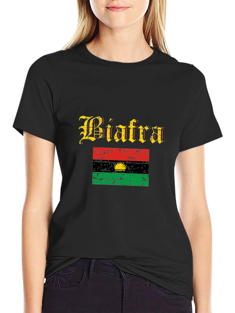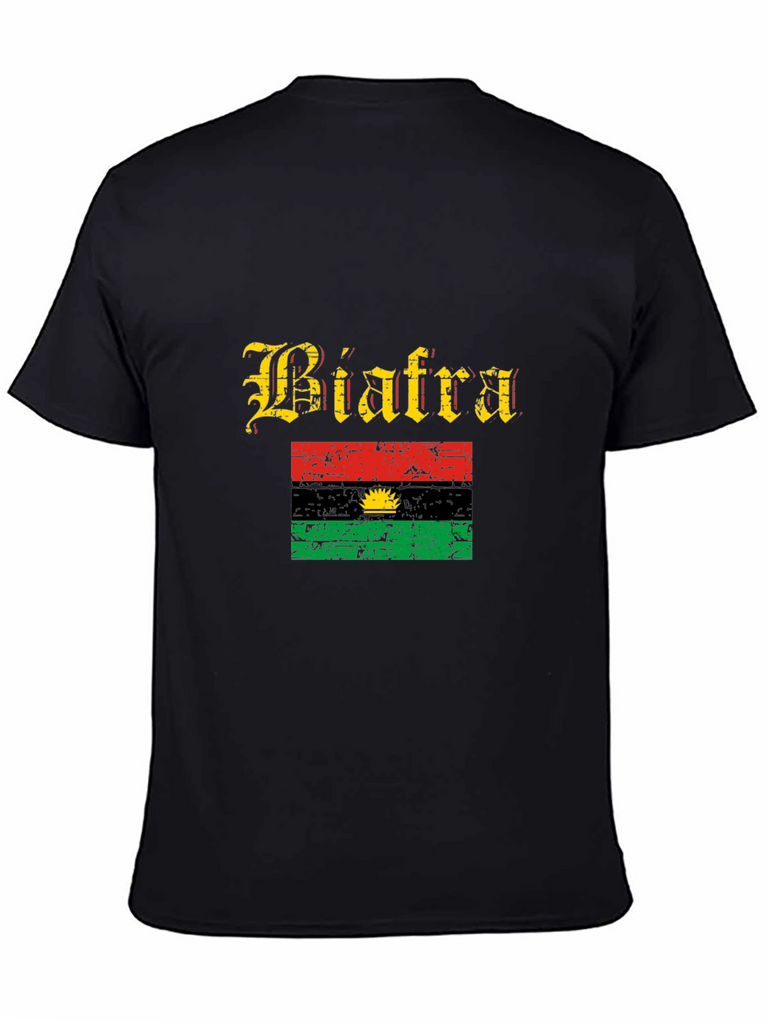 Show your pride with this striking black t-shirt featuring the Biafra flag emblem. The design includes the word "Biafra" in a stylized font above the iconic red, black, and green flag with a central sunburst. The distressed, vintage-look print gives it a unique, worn-in feel. Made from a comfortable material, this short-sleeved tee is perfect for casual wear, cultural events, or making a statement of solidarity. A bold and meaningful addition to any wardrobe, it's sure to spark conversations and showcase your heritage.
