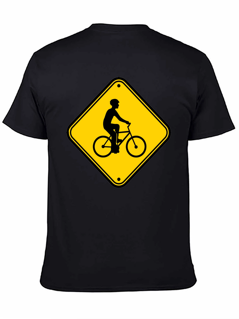 Show off your love for cycling with this unique graphic t-shirt. The black tee features a striking yellow diamond design, mimicking a 'Bicycle Crossing' road sign, complete with a silhouette of a cyclist. Made from comfortable, breathable fabric, this tee is perfect for everyday wear. Ideal for casual outings, bike rides, or simply expressing your passion for the sport. A great conversation starter, this shirt is a must-have for any cycling enthusiast's wardrobe. The bold graphic stands out against the black background, ensuring you'll turn heads wherever you go.