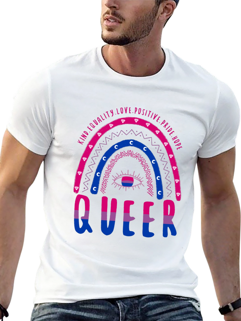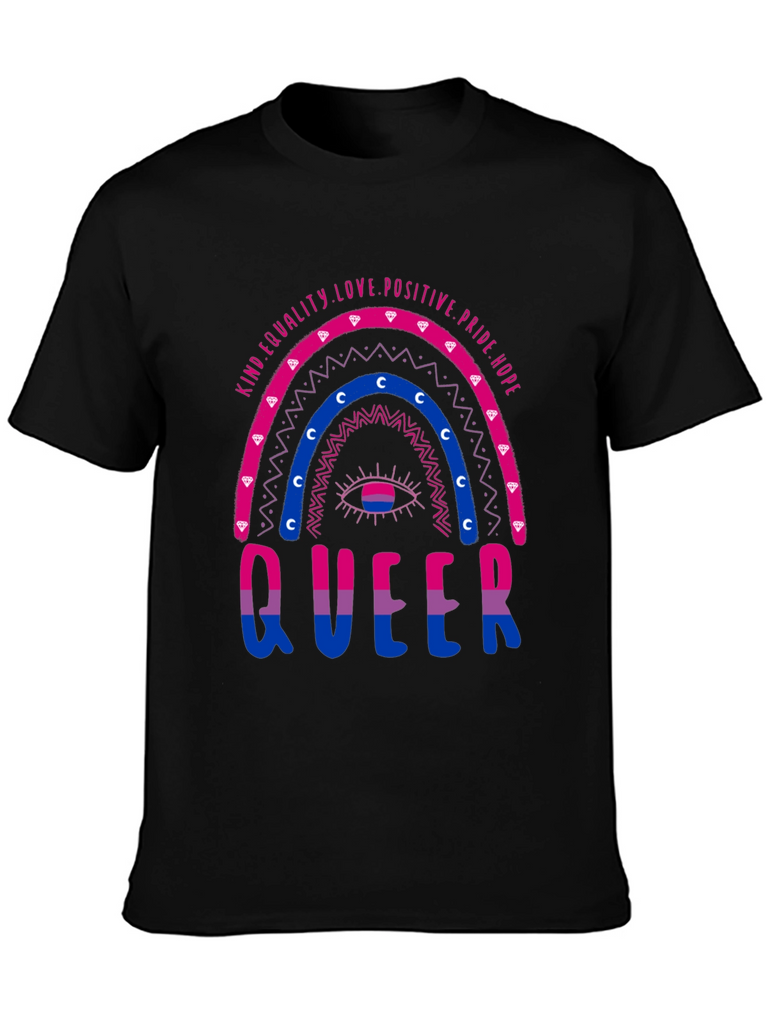 Show your pride with this eye-catching Bisexual Pride T-Shirt. Featuring a vibrant rainbow design in bisexual pride colors of pink, purple, and blue, this shirt makes a bold statement. The word "Queer" is printed in a matching color gradient. The design includes the words "Kind, Equality, Love, Positive, Pride, Hope", along with an eye in the colors of the pride flag. This comfortable shirt is perfect for pride events, everyday wear, or as a gift for someone special. Wear your identity with pride and style!