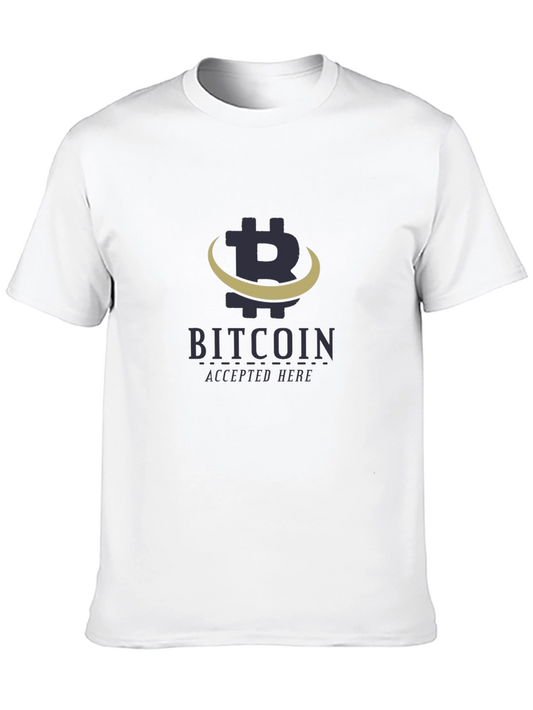 Show your support for cryptocurrency with this stylish black t-shirt. Featuring a bold Bitcoin logo with a golden accent and the phrase "Bitcoin Accepted Here," this tee is perfect for tech enthusiasts and early adopters. Made from a comfortable, breathable fabric, it's ideal for casual wear, tech conferences, or showcasing your forward-thinking mindset. The simple yet eye-catching design makes it a great conversation starter and a must-have for anyone passionate about the future of digital currency. Get yours today and be part of the financial revolution!
