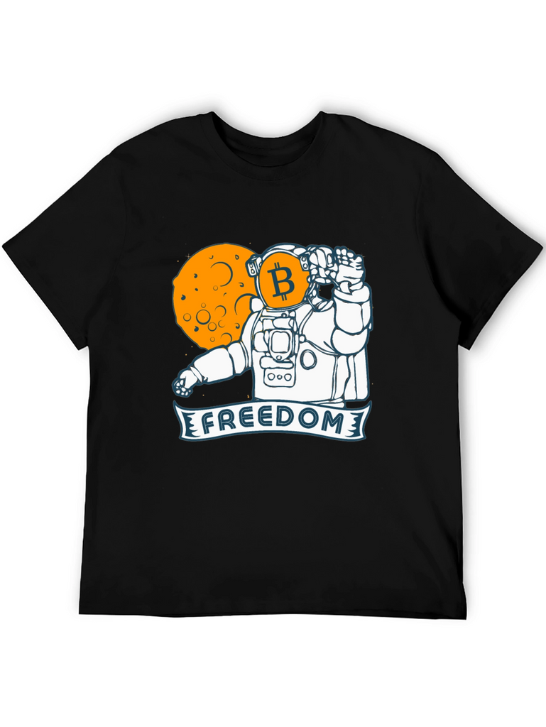 Reach for the moon with this unique Bitcoin Astronaut t-shirt! This eye-catching black tee features a stylized astronaut graphic with a Bitcoin logo on the helmet against a lunar backdrop. Boldly proclaiming "Freedom," it’s perfect for crypto enthusiasts and anyone who values financial independence. Made from a soft, comfortable fabric, this shirt is ideal for everyday wear, crypto meetups, or as a conversation starter. Show your support for the decentralized future with this awesome t-shirt. Get yours today and let your crypto pride shine!