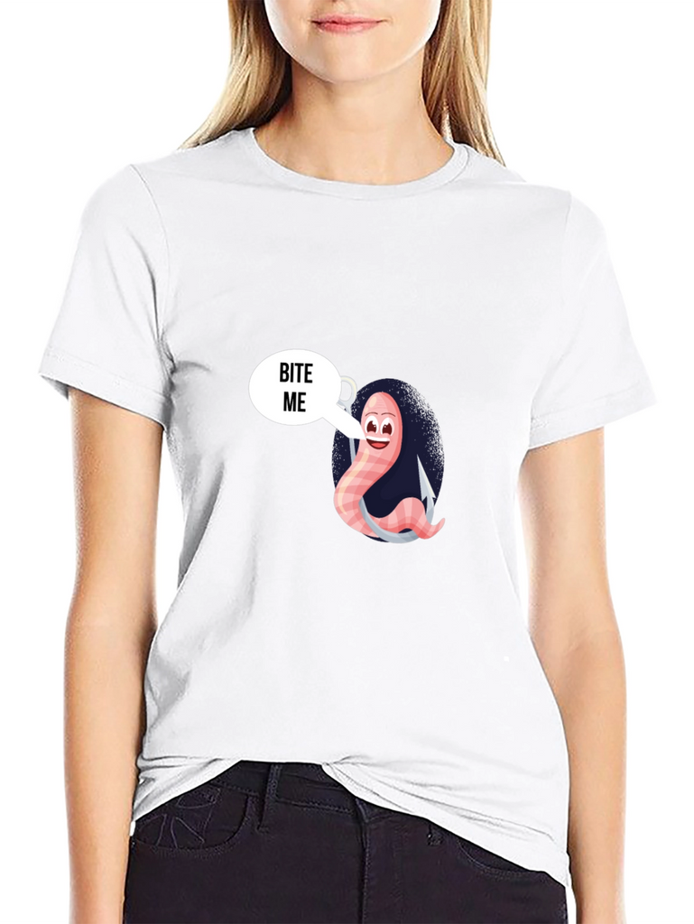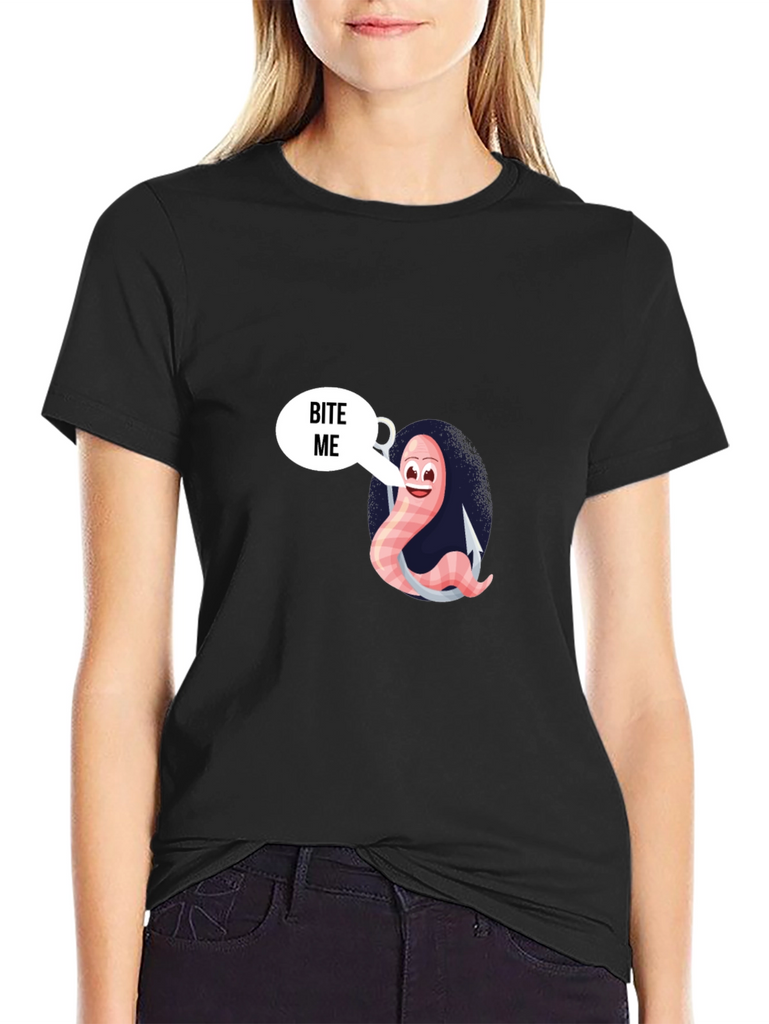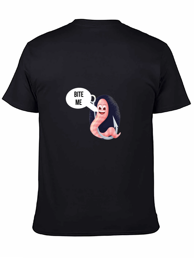 Show off your playful side with this unique black t-shirt! The design features a cartoon worm with a cheerful expression, dangling from a fishing hook and daring you to 'Bite Me' in a speech bubble. The shirt is made from a soft-looking, dark fabric. Perfect for casual wear, fishing trips, or as a fun conversation starter. This tee combines comfort and quirky style, making it a standout addition to any wardrobe. Get yours today and let your sense of humor shine!