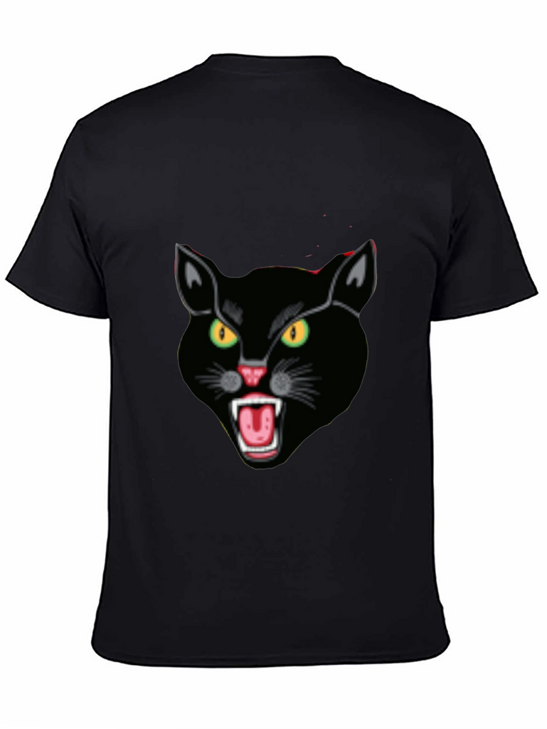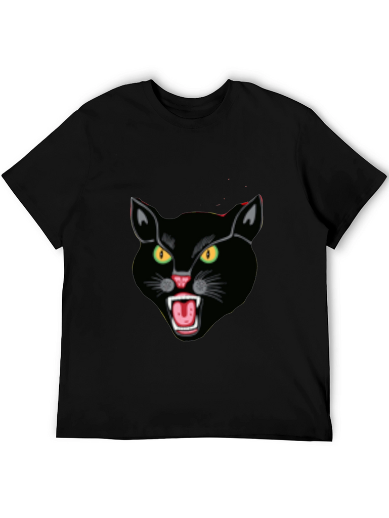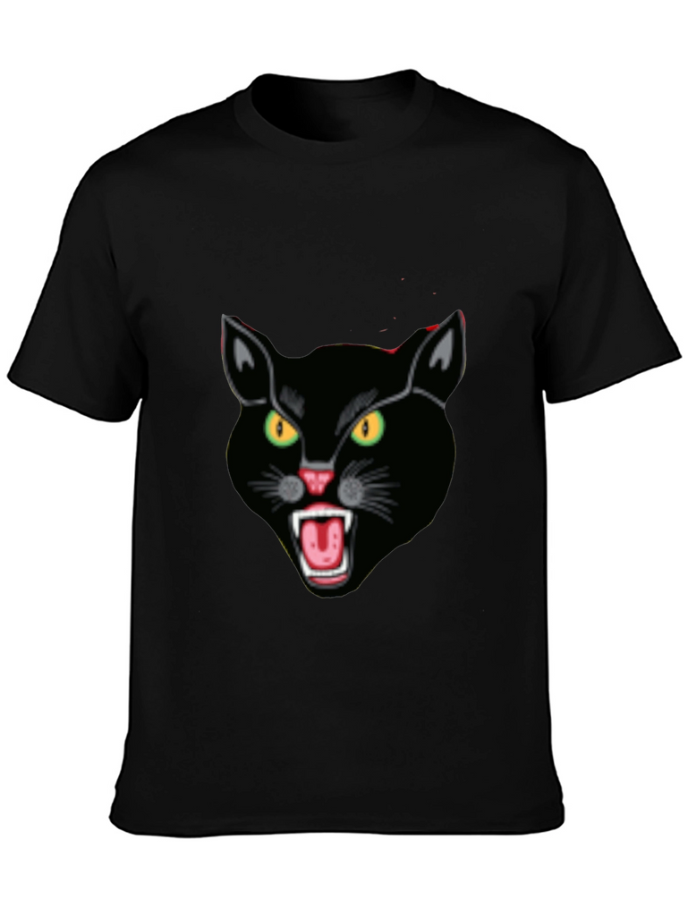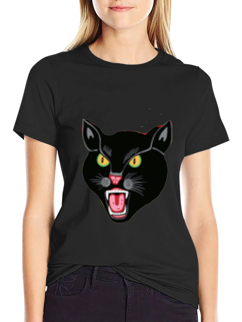 Unleash your inner wildcat with this striking black t-shirt featuring a bold graphic of a snarling black cat. The design showcases piercing yellow eyes and a vibrant red mouth, creating a fierce and eye-catching statement. Crafted from comfortable, breathable fabric, this tee is perfect for everyday wear, concerts, or casual outings. Its classic fit ensures a flattering silhouette for all body types. Pair it with jeans, shorts, or a skirt for a versatile and edgy look. Make a statement and express your unique style with this must-have graphic tee. Let your feline spirit shine!