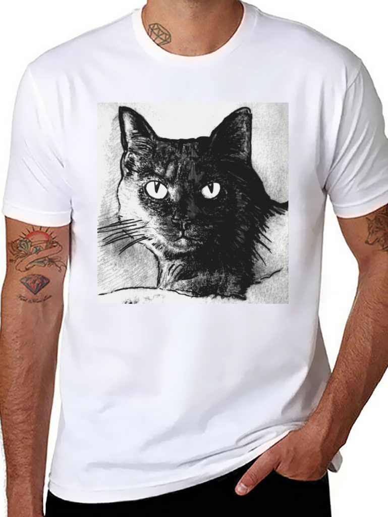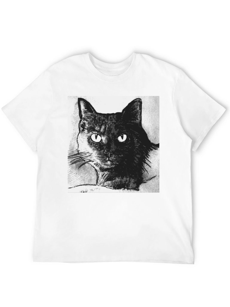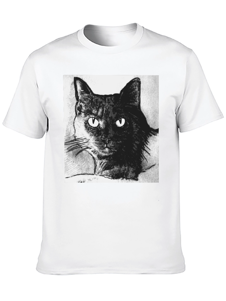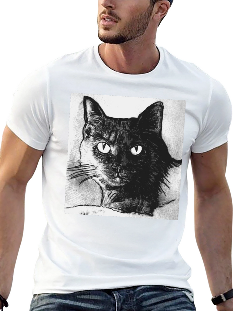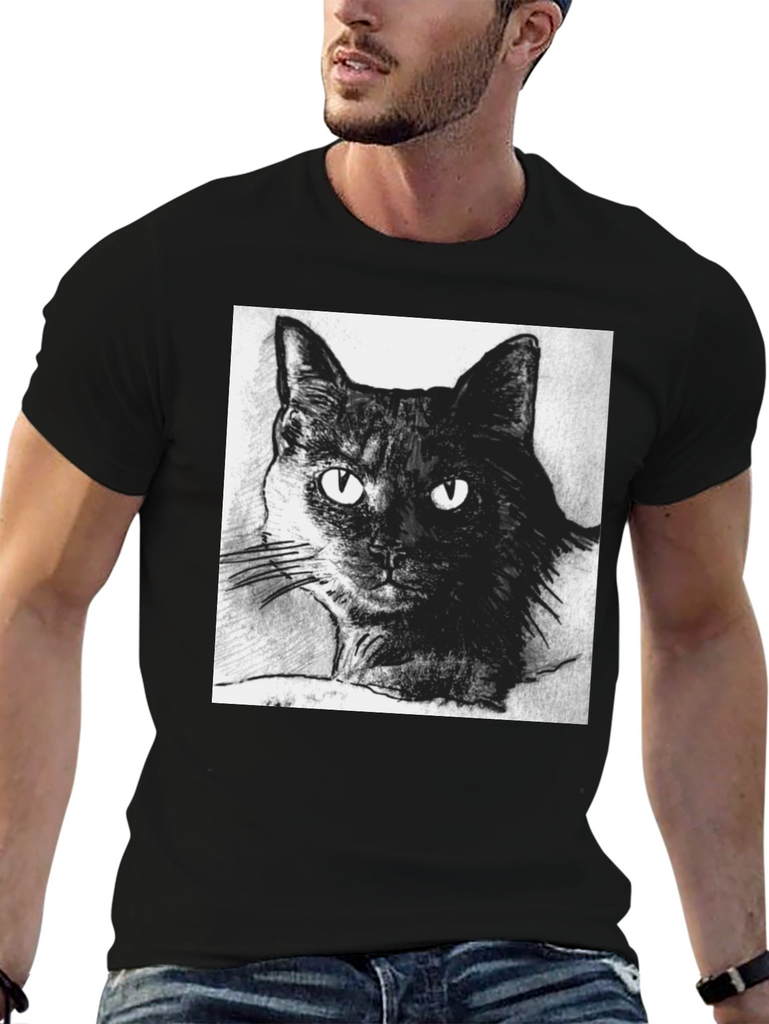 Showcase your love for feline friends with this striking black t-shirt! Featuring a captivating black and white portrait of a cat, this tee is perfect for everyday wear. The design is printed on a soft, comfortable fabric, ensuring a great fit. Whether you're a cat lover or just appreciate unique graphic tees, this shirt is sure to turn heads. Pair it with jeans, shorts, or your favorite casual bottoms for a stylish and effortless look. This tee is a purr-fect addition to any wardrobe!