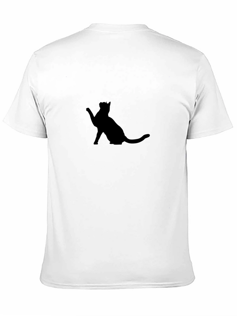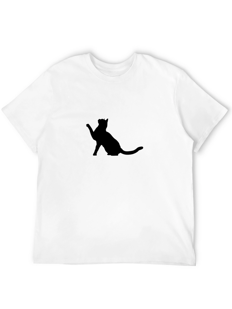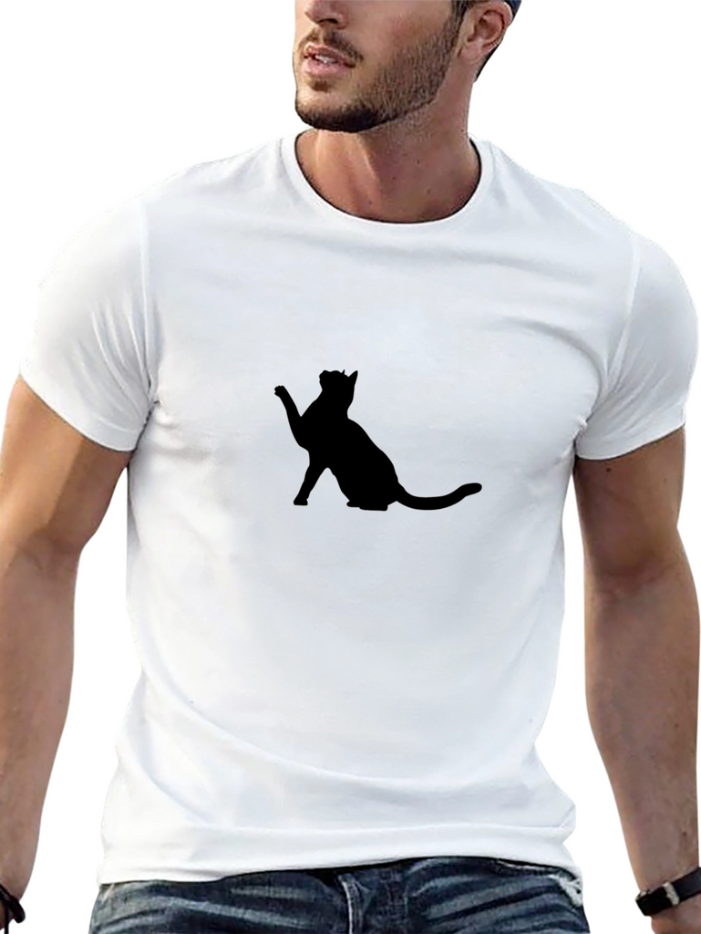 This classic black t-shirt features a sleek silhouette of a cat raising its paw. Made from a comfortable-looking fabric, this short-sleeved tee is perfect for casual wear and showcases your love for feline friends. The dark print stands out subtly against the black shirt, making it versatile for various outfits. Ideal for everyday style, this shirt is a great way to express your personality. Whether you're running errands or relaxing at home, this tee is a comfortable and stylish choice. The unisex design makes it a great option for anyone who loves cats. Get yours today and show off your purr-fect style!