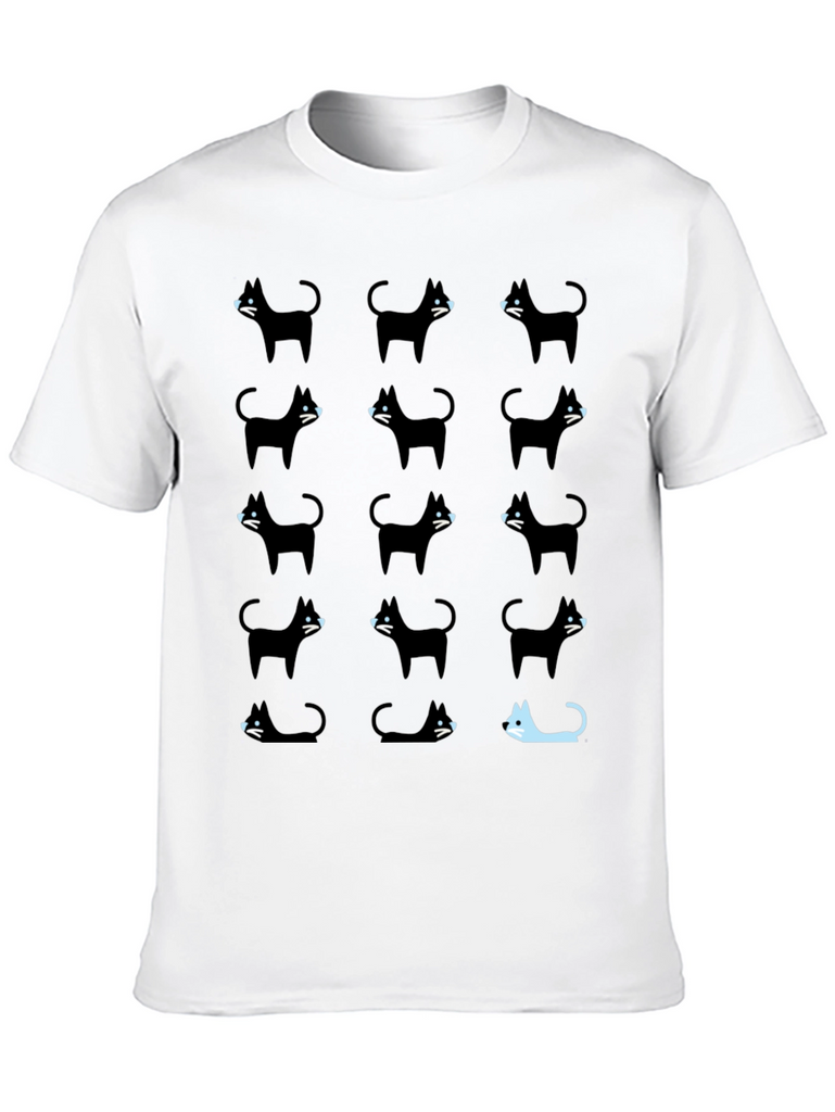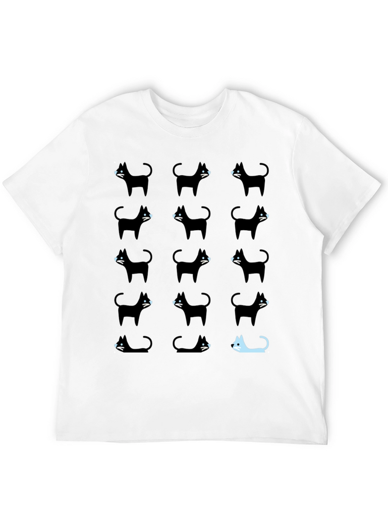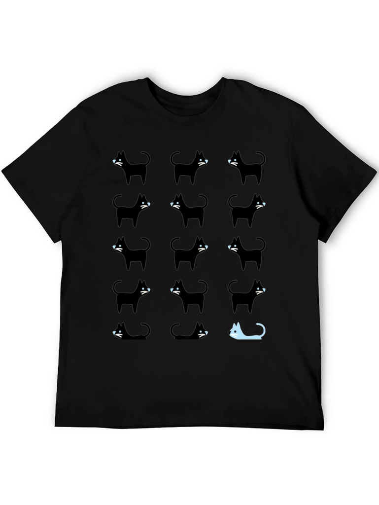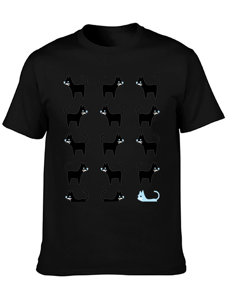 Show off your unique style with this eye-catching black t-shirt! Featuring a repeating pattern of stylized black cats, this tee adds a playful touch to any outfit. Made from a soft, comfortable fabric, it's perfect for everyday wear. The unique design includes one special light blue cat lying down, adding a pop of color and individuality. Pair it with jeans, shorts, or a skirt for a casual yet fashionable look. Stand out from the crowd and express your love for cats with this one-of-a-kind t-shirt!