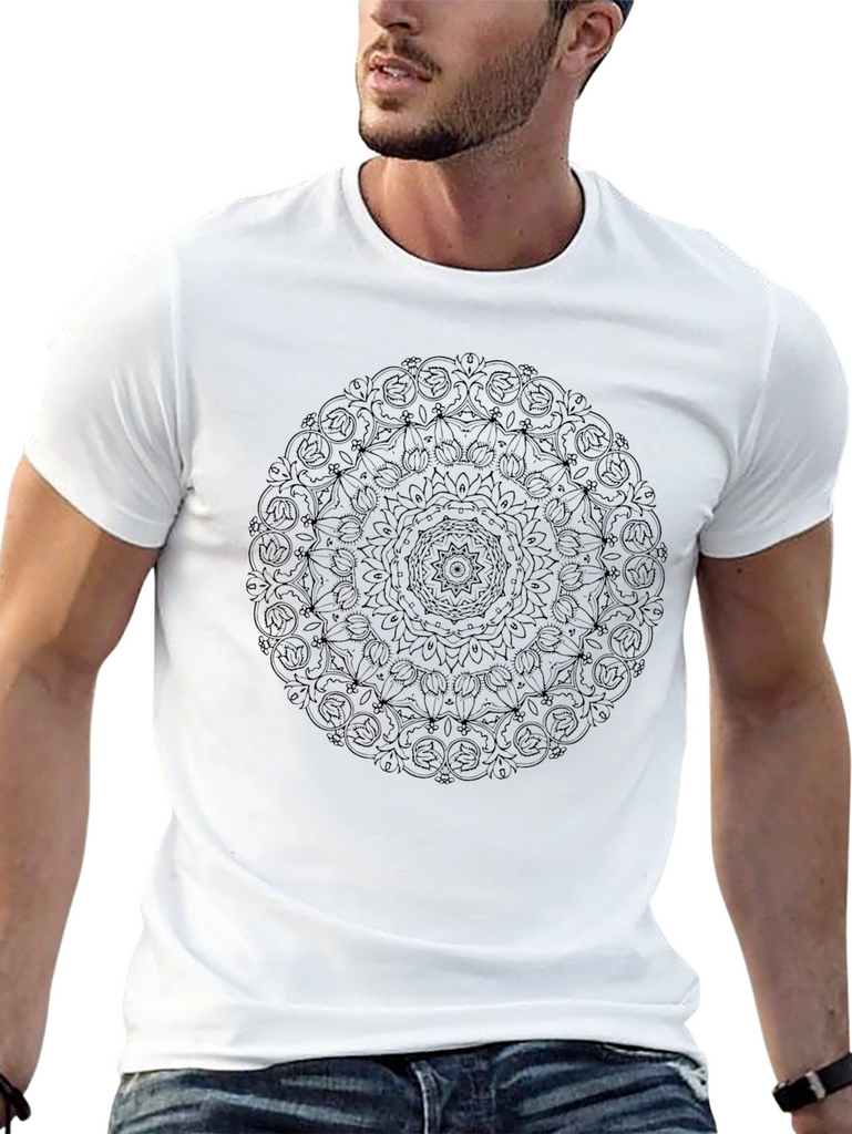 Embrace understated style with this black tee featuring a subtle yet intricate mandala design. The monochromatic graphic adds a touch of artistic flair to the classic t-shirt silhouette. Made from what appears to be soft, breathable fabric, this shirt ensures comfort and a relaxed fit. Perfect for everyday wear, casual outings, or layering under jackets. Pair it with jeans or chinos for a versatile and effortlessly cool look. The unique design elevates this wardrobe staple, making it a must-have for any modern man. This tee combines comfort, style, and a unique graphic for a standout piece.