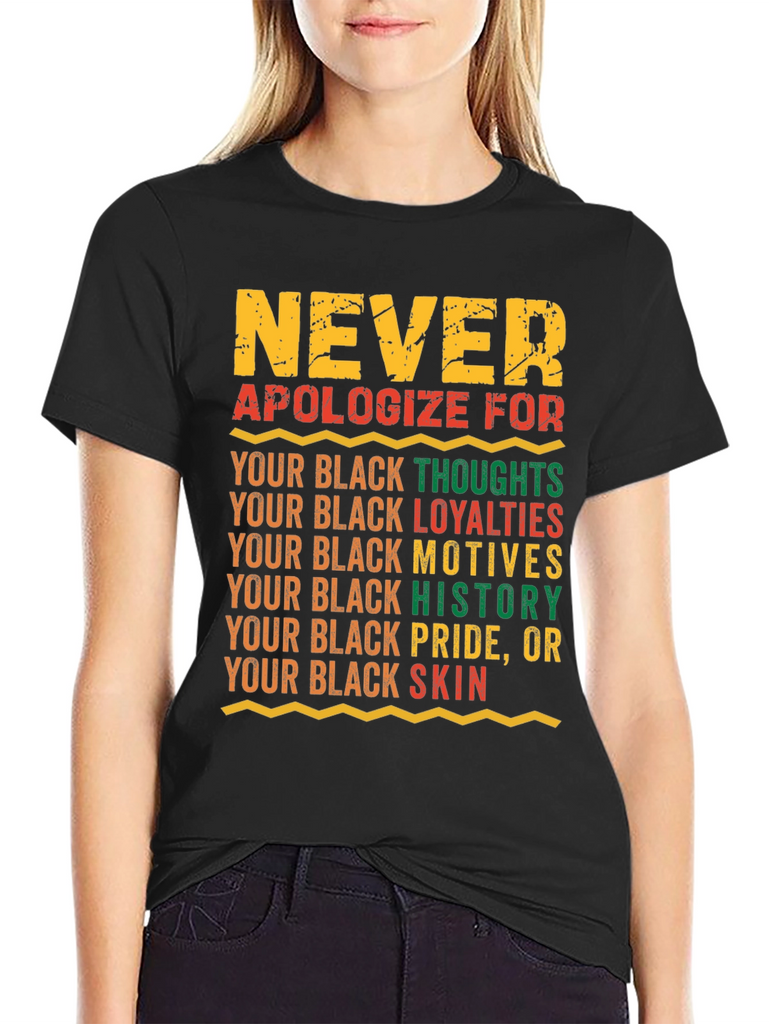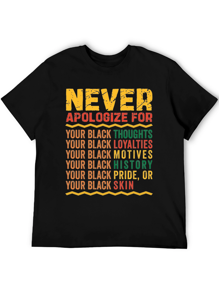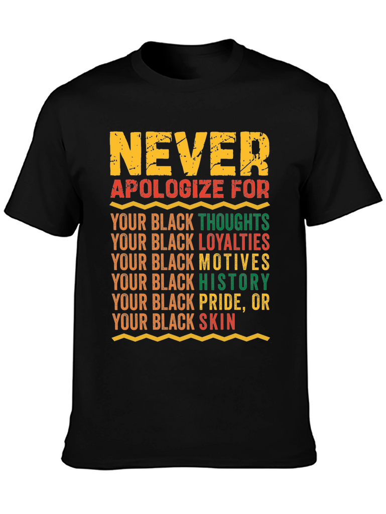 Show your pride with this bold graphic tee. Featuring the statement "Never Apologize For Your Black Thoughts, Your Black Loyalties, Your Black Motives, Your Black History, Your Black Pride, Or Your Black Skin", this shirt makes a powerful statement. The striking design uses vibrant colors to make it stand out. Made from comfortable materials, it's perfect for everyday wear or to showcase your heritage at special events. Wear it to rallies, parties, or casual outings to express your identity and start conversations. This tee is more than just clothing, it's a declaration of self-love and empowerment.