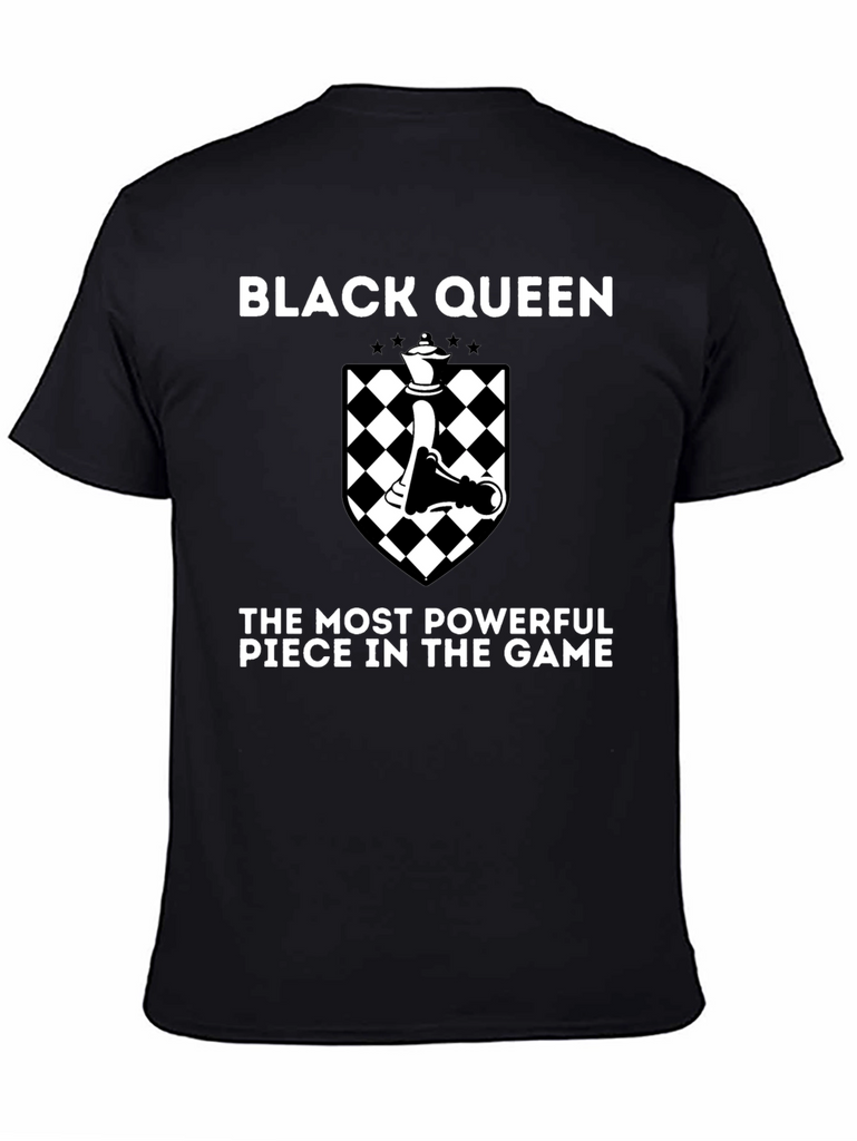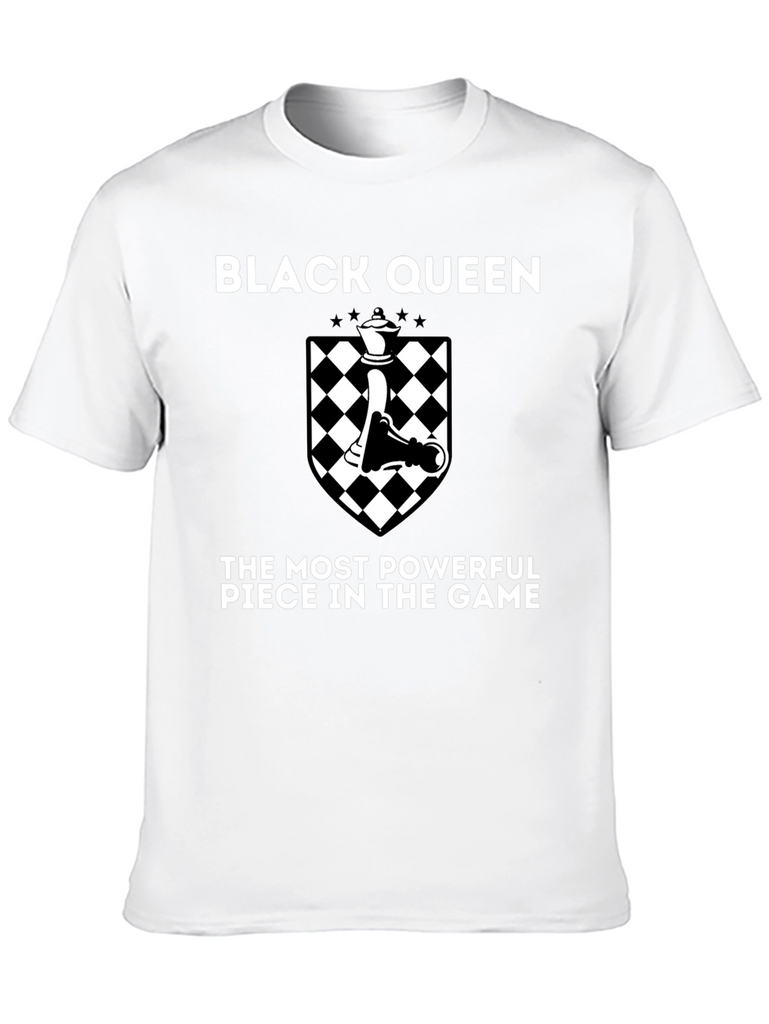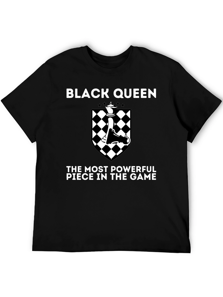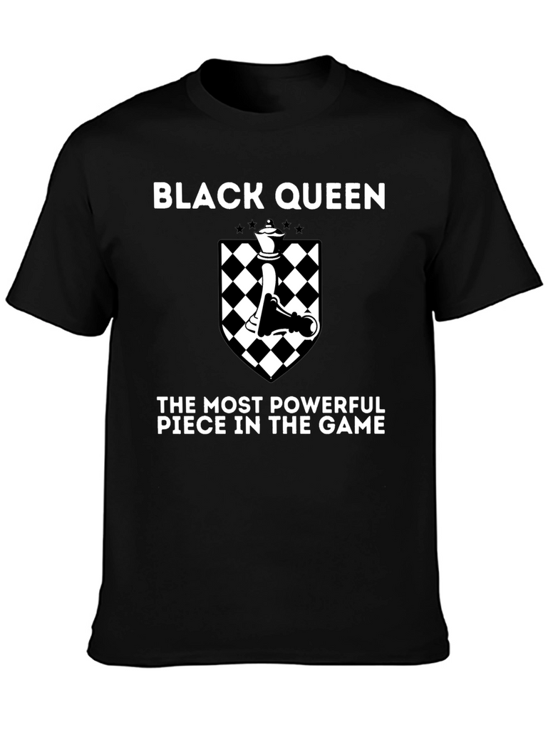 Show your love for the queen in chess with this unique graphic t-shirt. The shirt features a striking design with a checkered shield showcasing a chess queen piece. Above the shield is the statement "BLACK QUEEN", and below the shield reads "THE MOST POWERFUL PIECE IN THE GAME". Made from comfortable fabric, this tee is perfect for casual wear, chess club meetings, or as a gift for chess enthusiasts. Express your passion for the game in style!