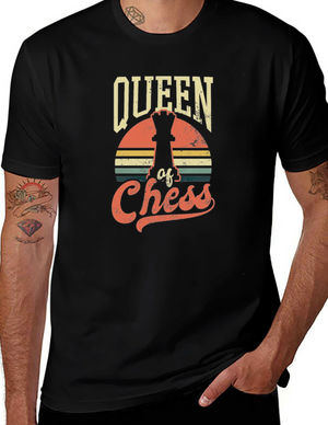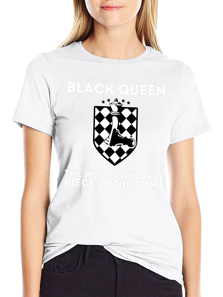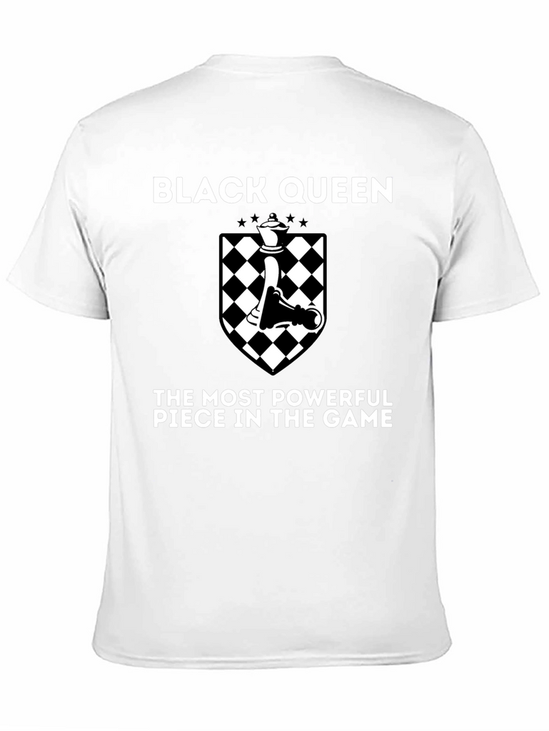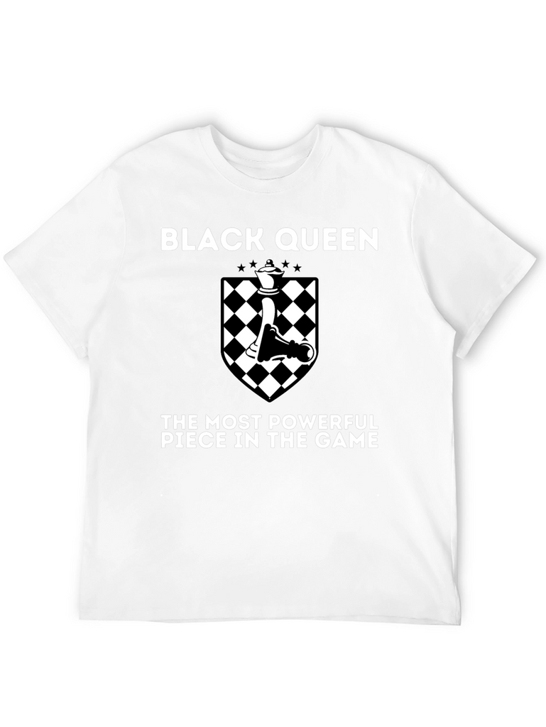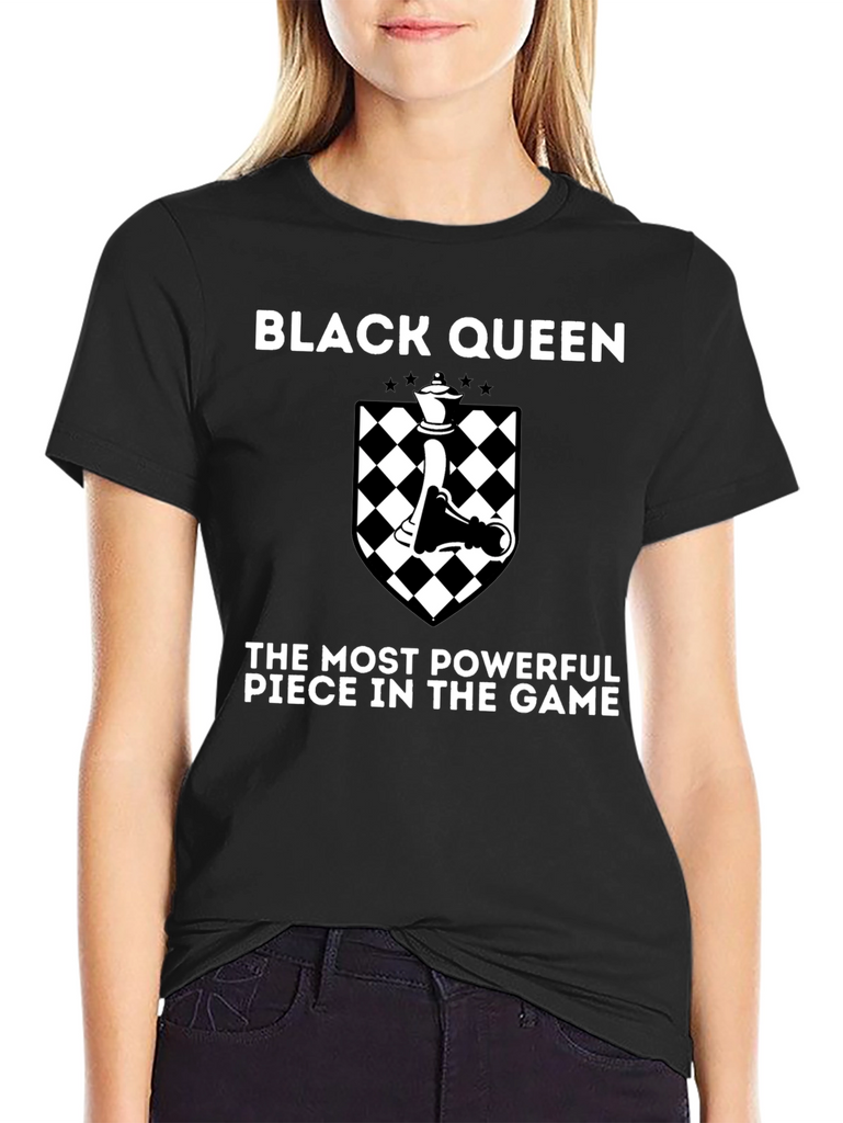 Show your love for the queen in chess with this unique graphic t-shirt. The shirt features a striking design with a checkered shield showcasing a chess queen piece. Above the shield is the statement "BLACK QUEEN", and below the shield reads "THE MOST POWERFUL PIECE IN THE GAME". Made from comfortable fabric, this tee is perfect for casual wear, chess club meetings, or as a gift for chess enthusiasts. Express your passion for the game in style!