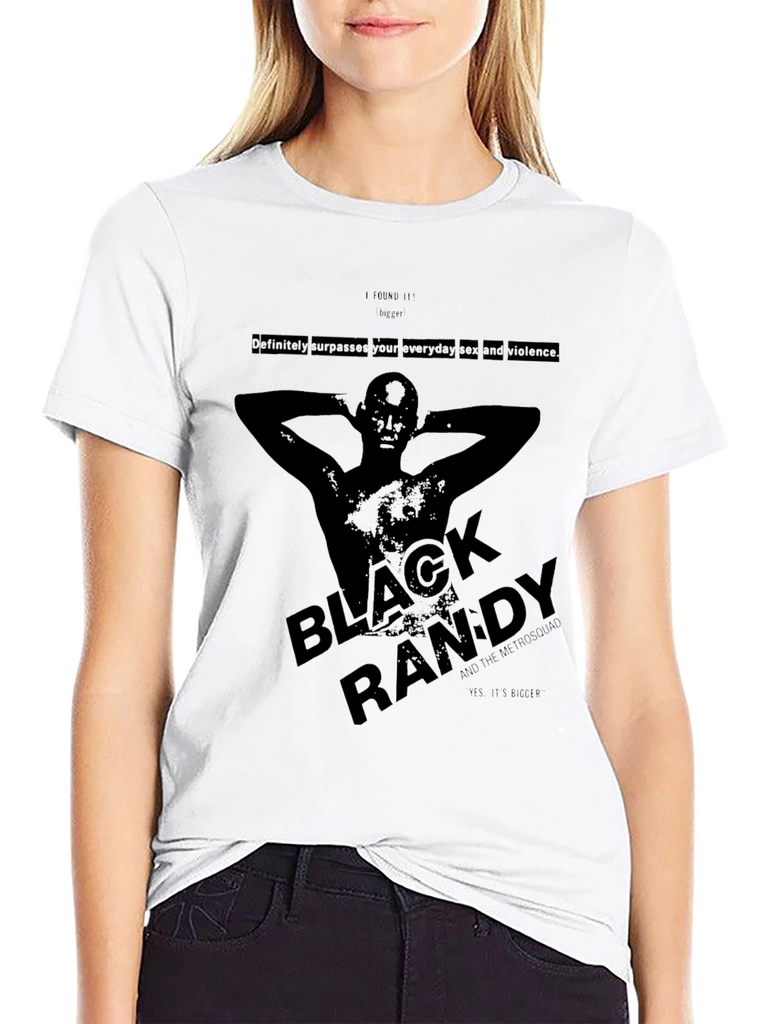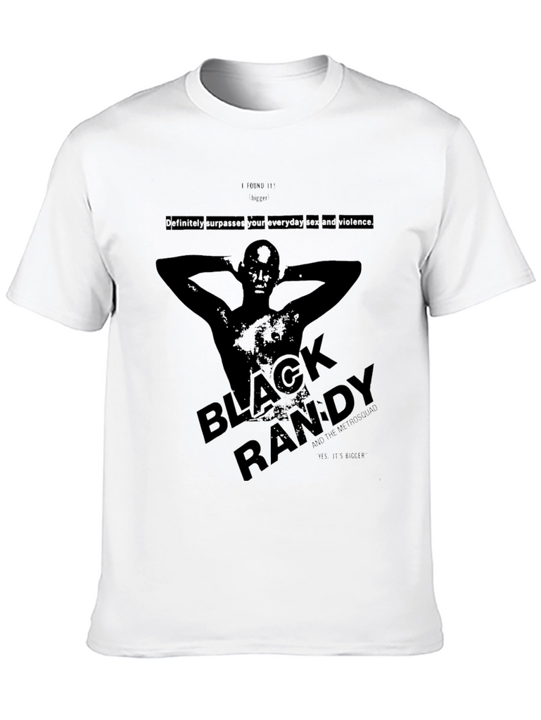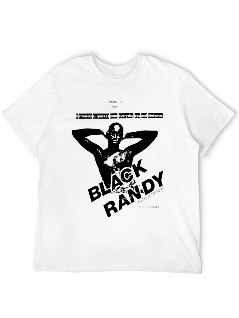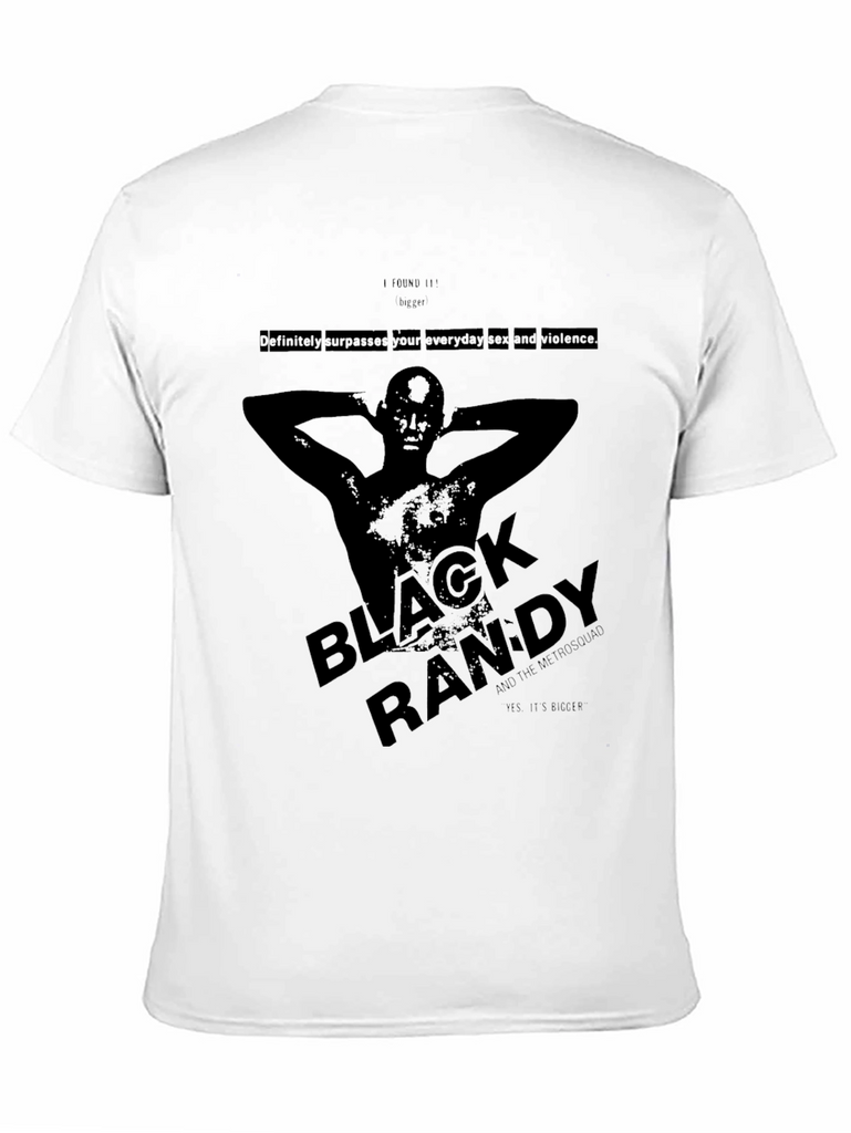 This black t-shirt features a bold and provocative design. At its center, the text "BLACK RANDY" is prominently displayed above smaller text reading, "AND THE METHE", beneath an artistic graphic of a shirtless man with his hands behind his head. Above the graphic, it says, "Definitely surpasses your everyday sex and violence". This edgy and eye-catching tee is perfect for making a statement and standing out from the crowd. Wear it to concerts, casual outings, or anywhere you want to express your unique style. Made with soft, comfortable material, this shirt ensures a great fit and all-day wearability. Get yours now and add a touch of rebellious flair to your wardrobe!