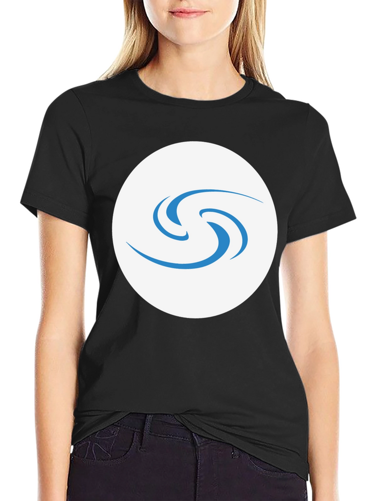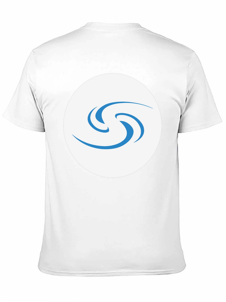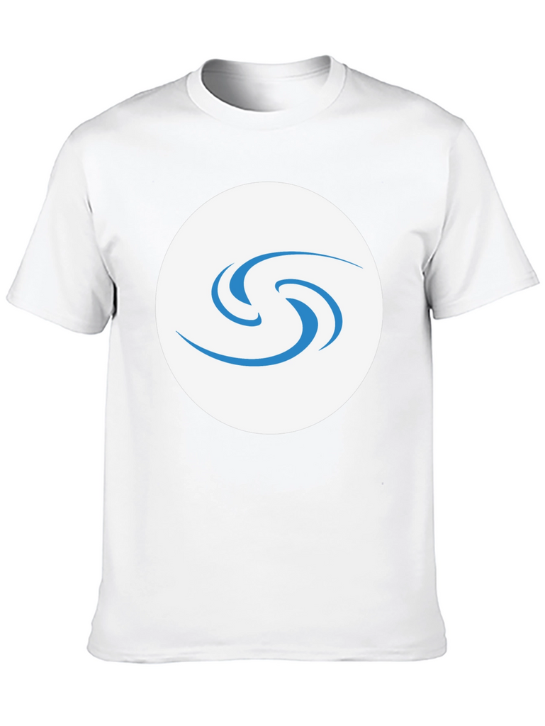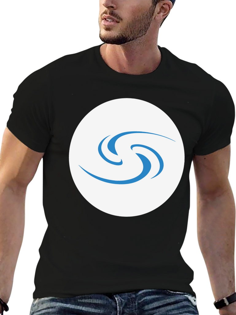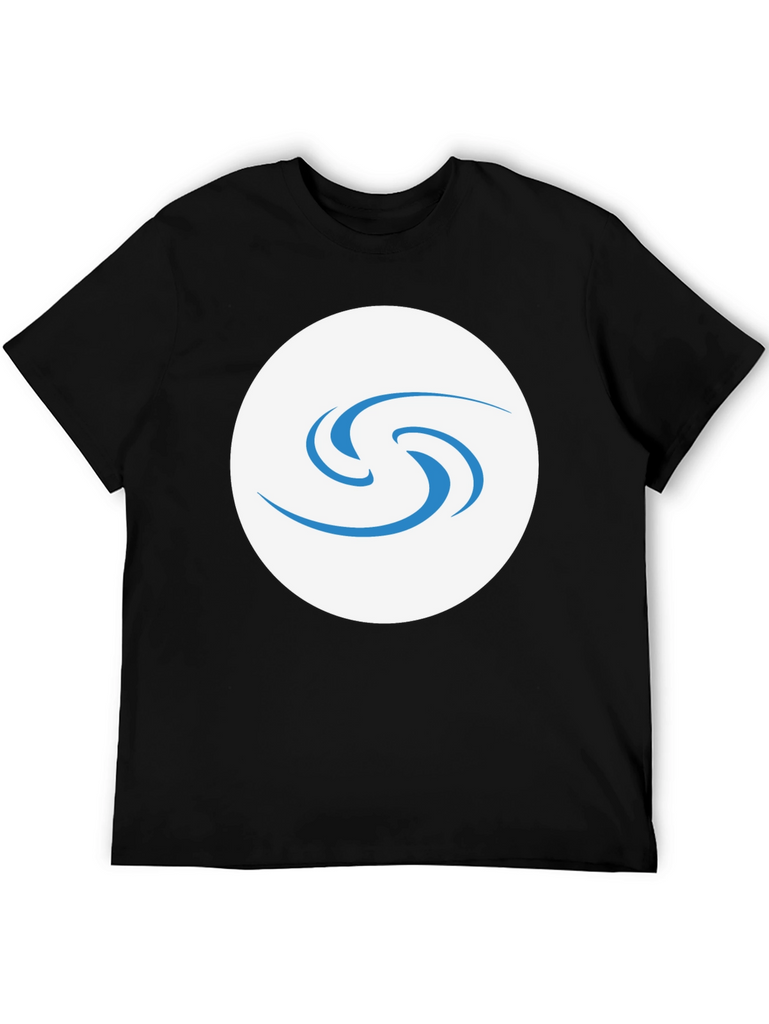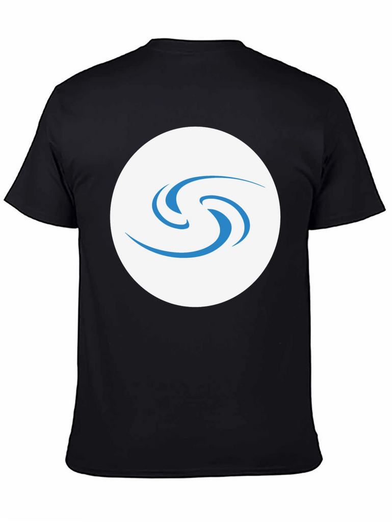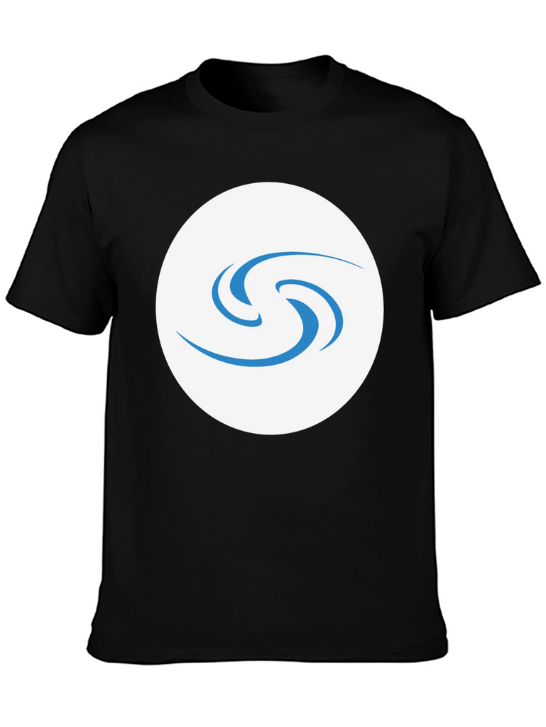 This classic black t-shirt features a striking circular graphic design prominently displayed on the chest. The graphic consists of swirling blue lines set against a clean white background, creating a visually appealing contrast. Made from what appears to be a soft, comfortable cotton blend, this tee offers both style and everyday wearability. Perfect for casual outings, weekend adventures, or simply relaxing at home, this t-shirt is a versatile addition to any wardrobe. Pair it with jeans, shorts, or chinos for an effortlessly cool look. The unique graphic adds a touch of personality, making it a great conversation starter. Enjoy the comfort and style of this eye-catching t-shirt.